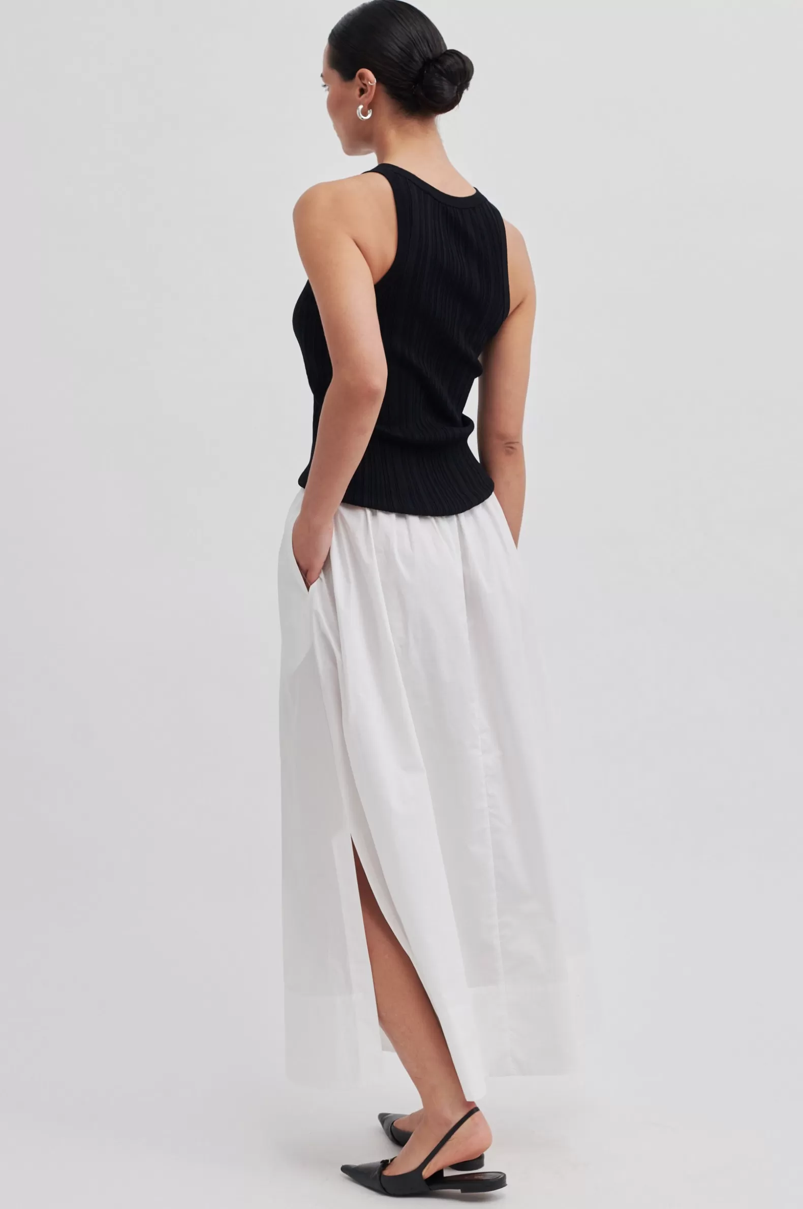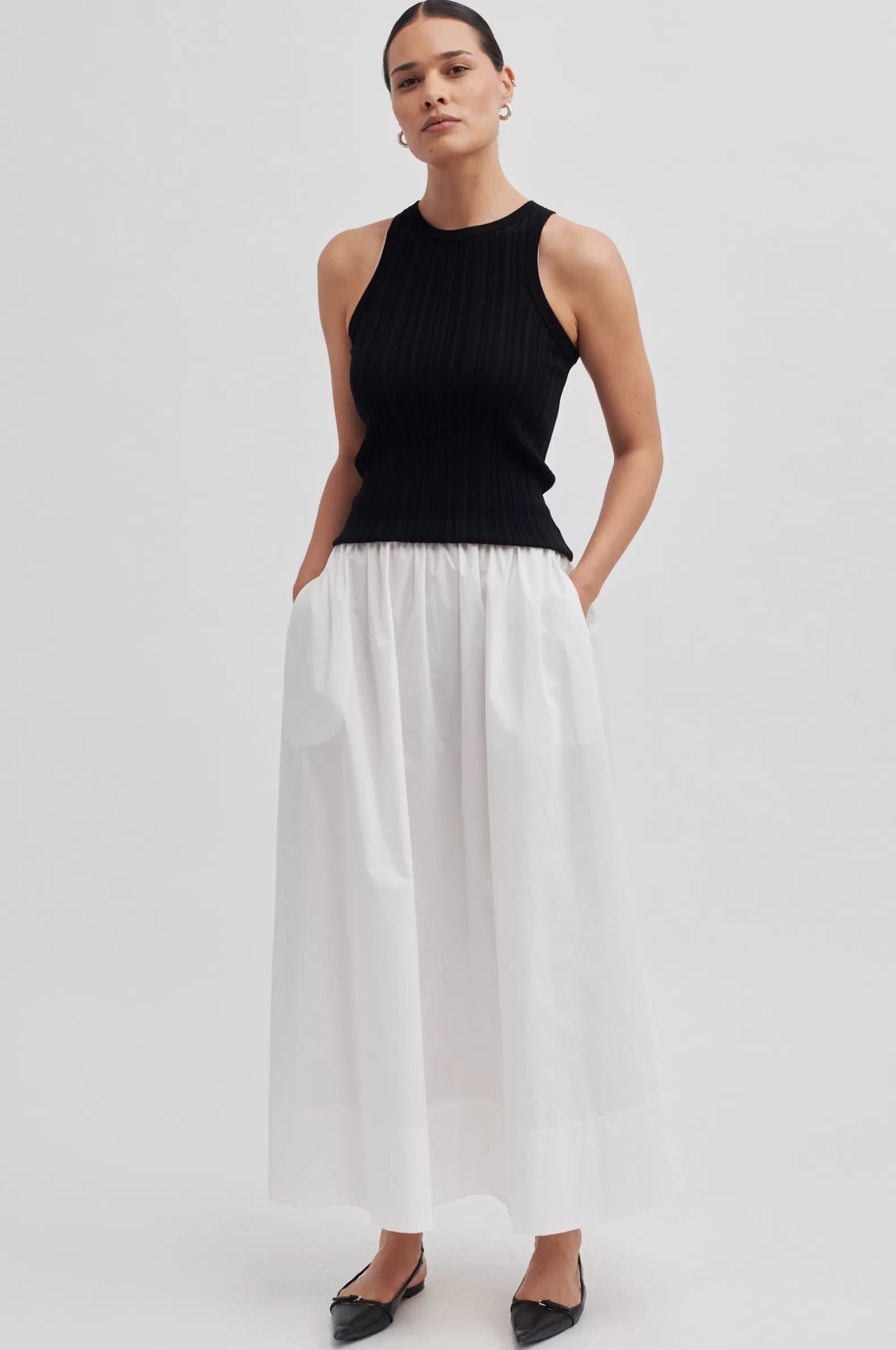 Second Female summer skirt with pockets. Made in light and smooth organic cotton. Featuring a covered elasticated waistband and two side pockets. Regular fit at waist with gathers that create extra volume.