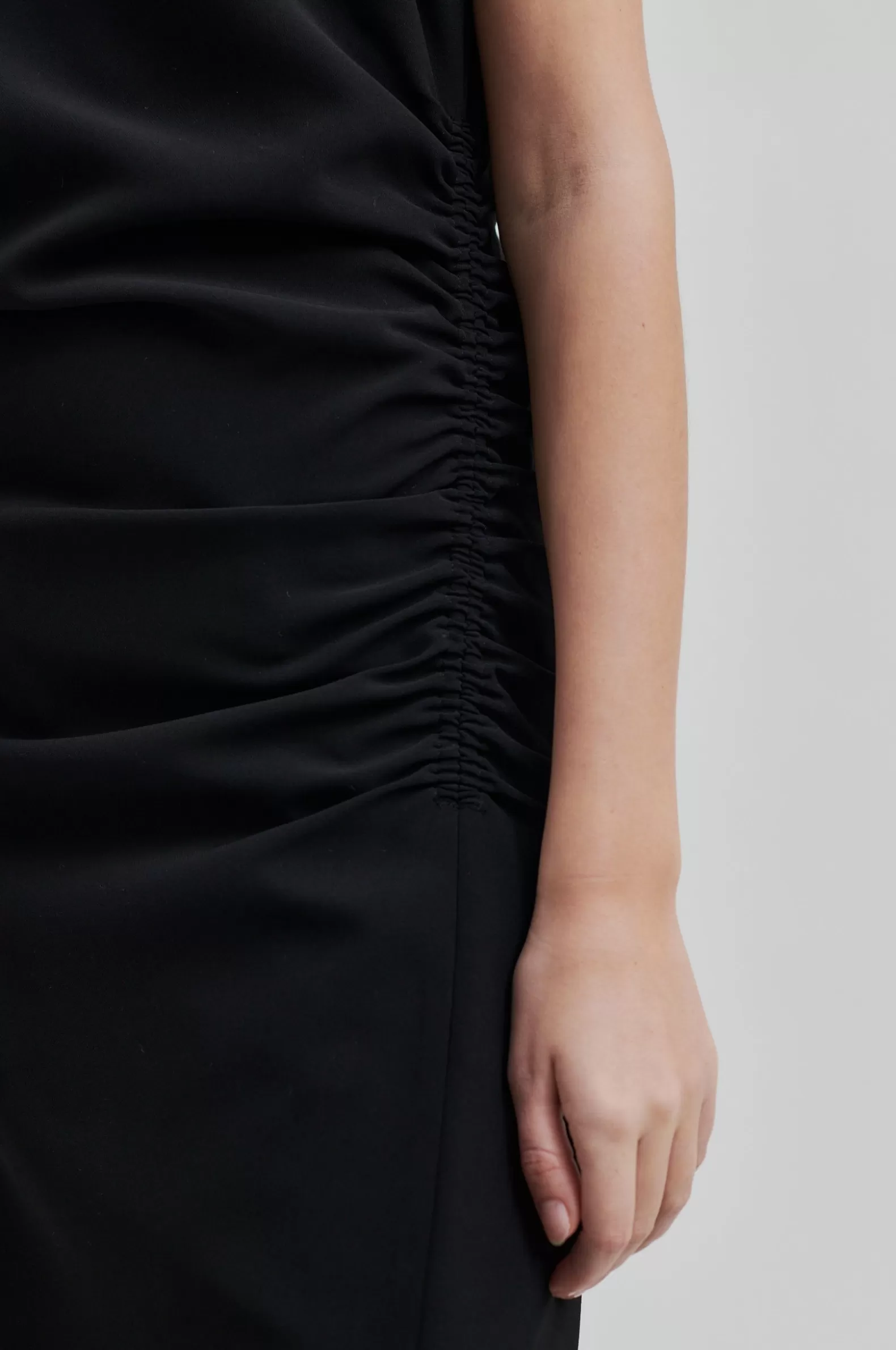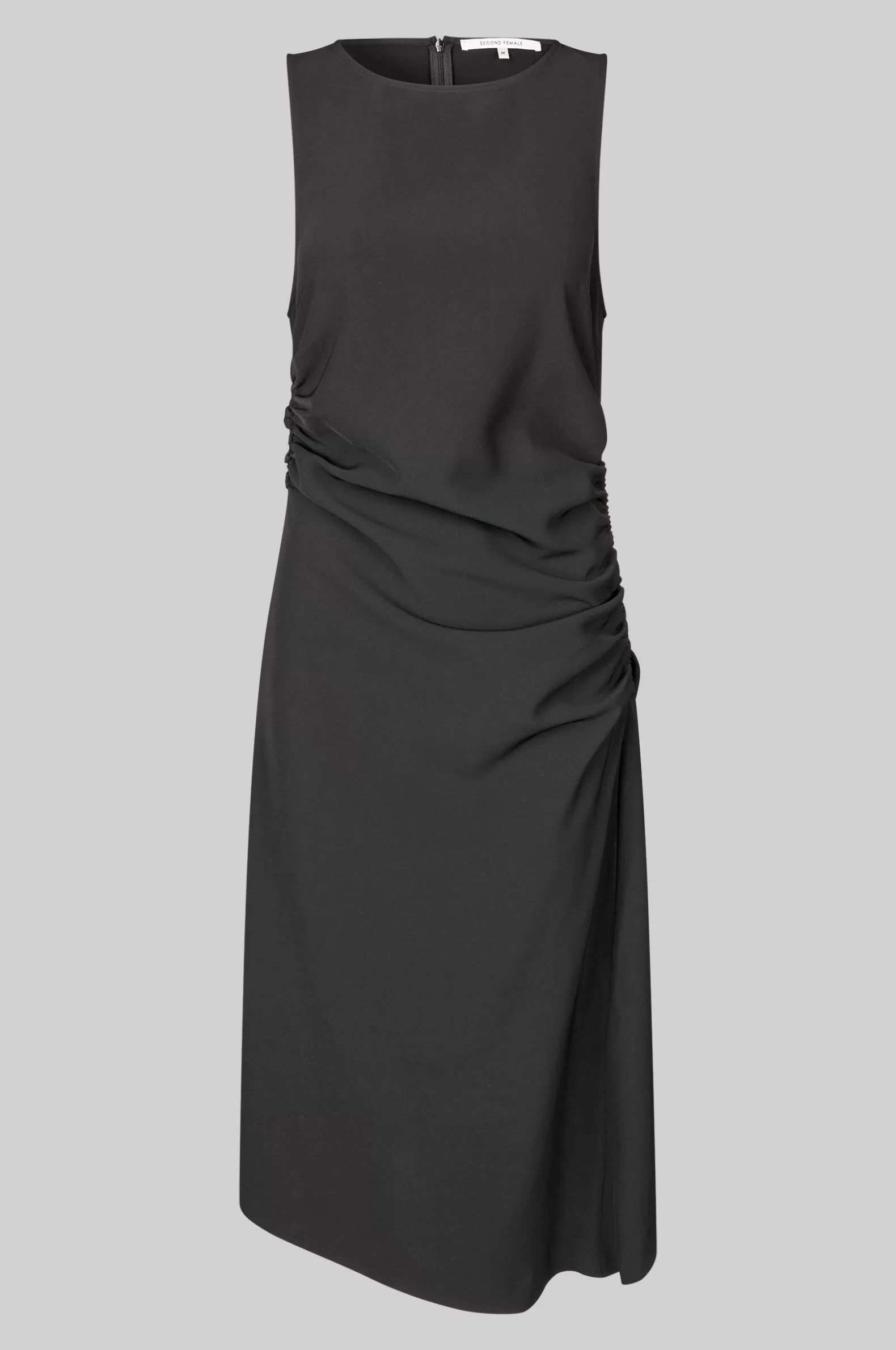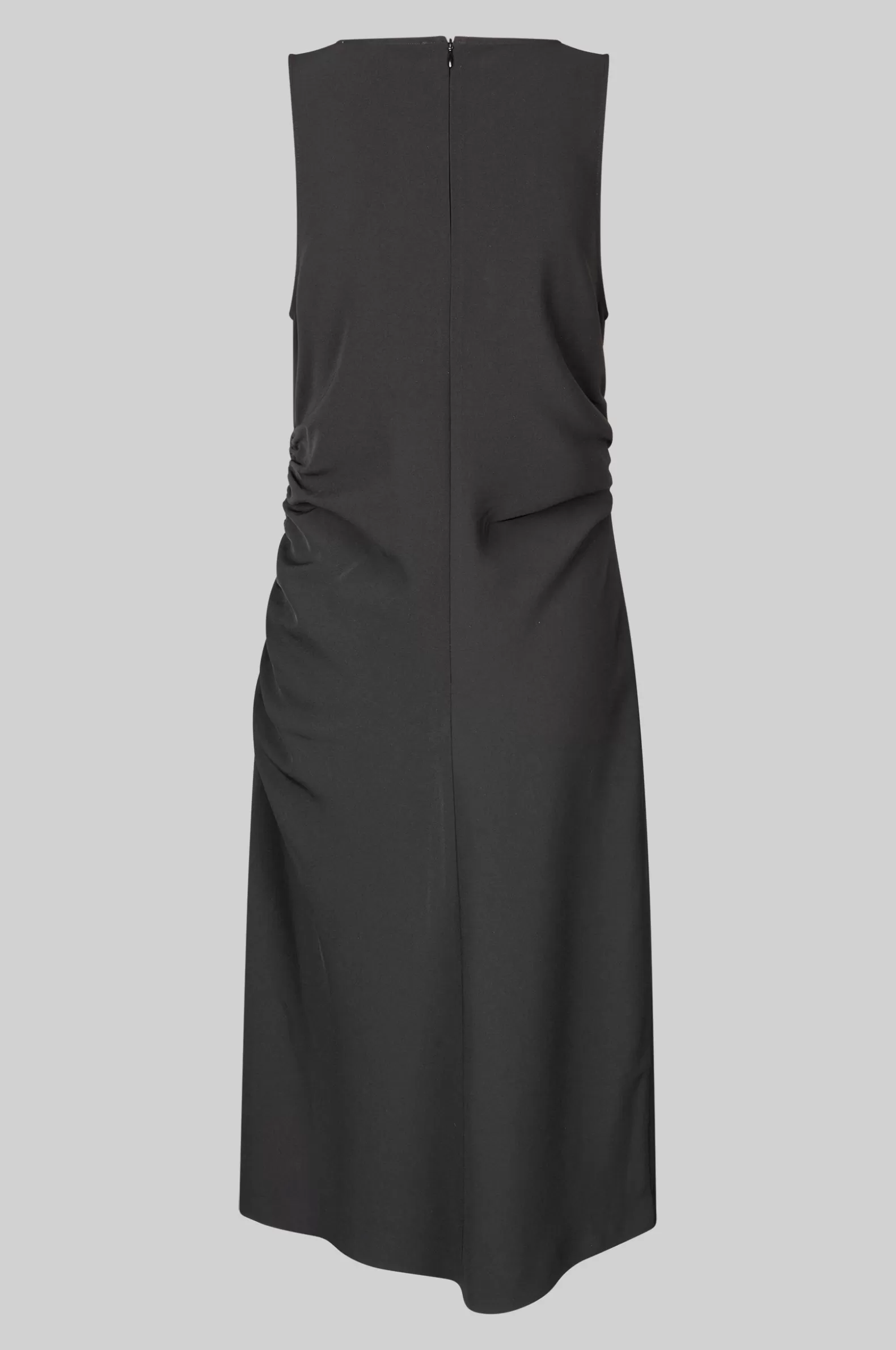 Second Female sleeveless dress with gathered sides. Made in a smooth and drapy recycled blend. Featuring a round neckline and zip fastening at the back. Gathered seams that create draped effect. Slim fit.