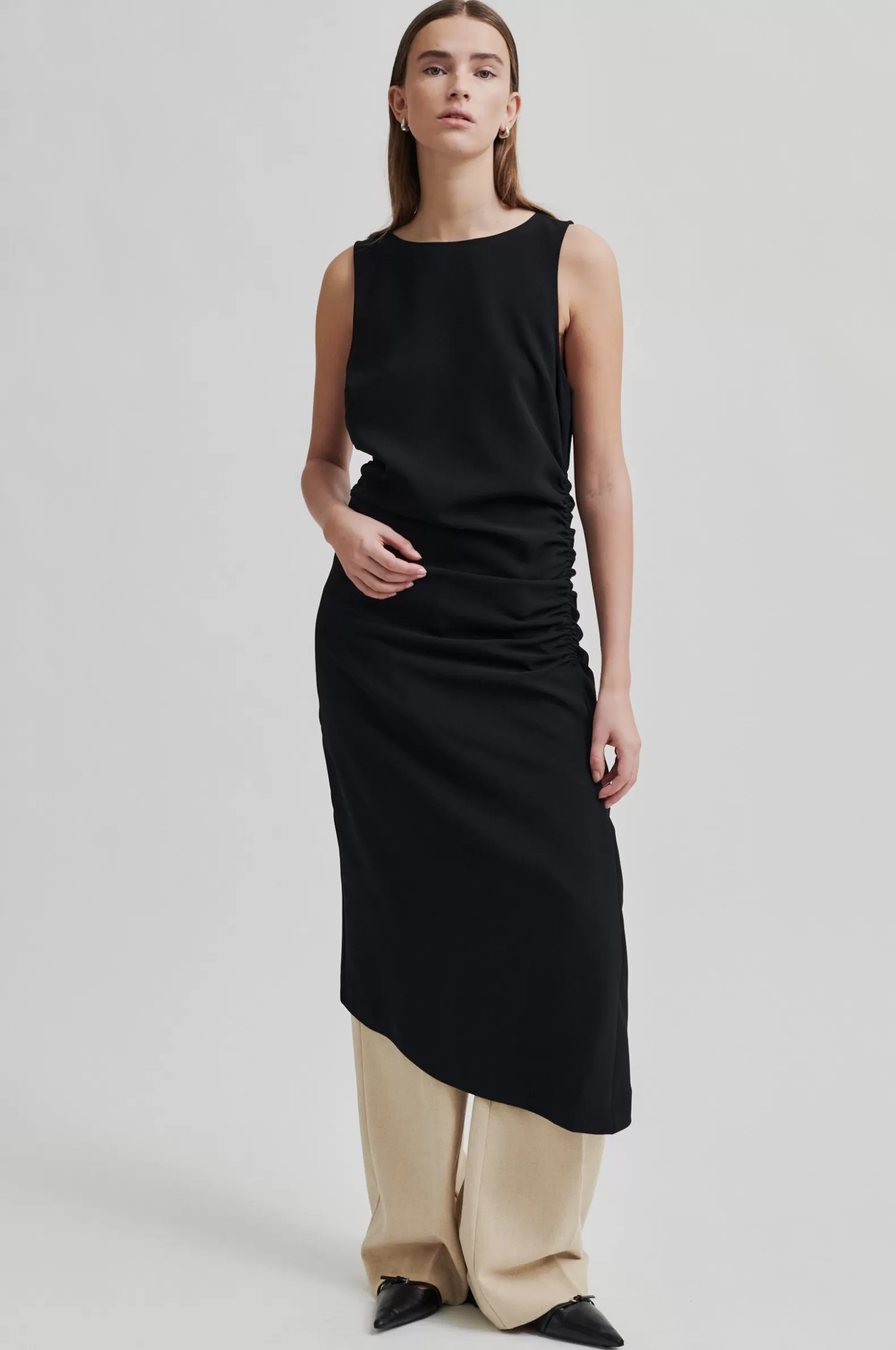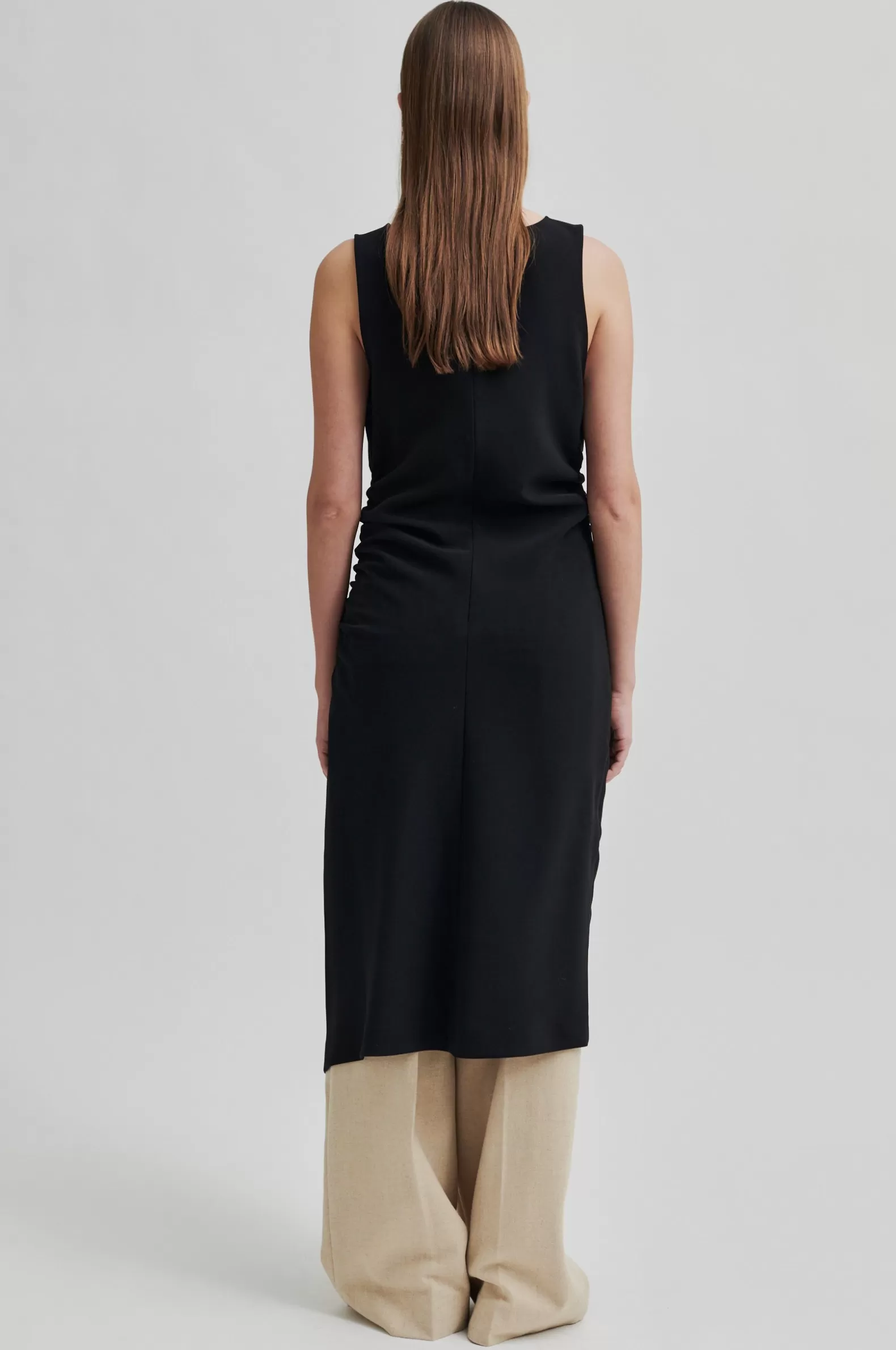 Second Female sleeveless dress with gathered sides. Made in a smooth and drapy recycled blend. Featuring a round necklin…
