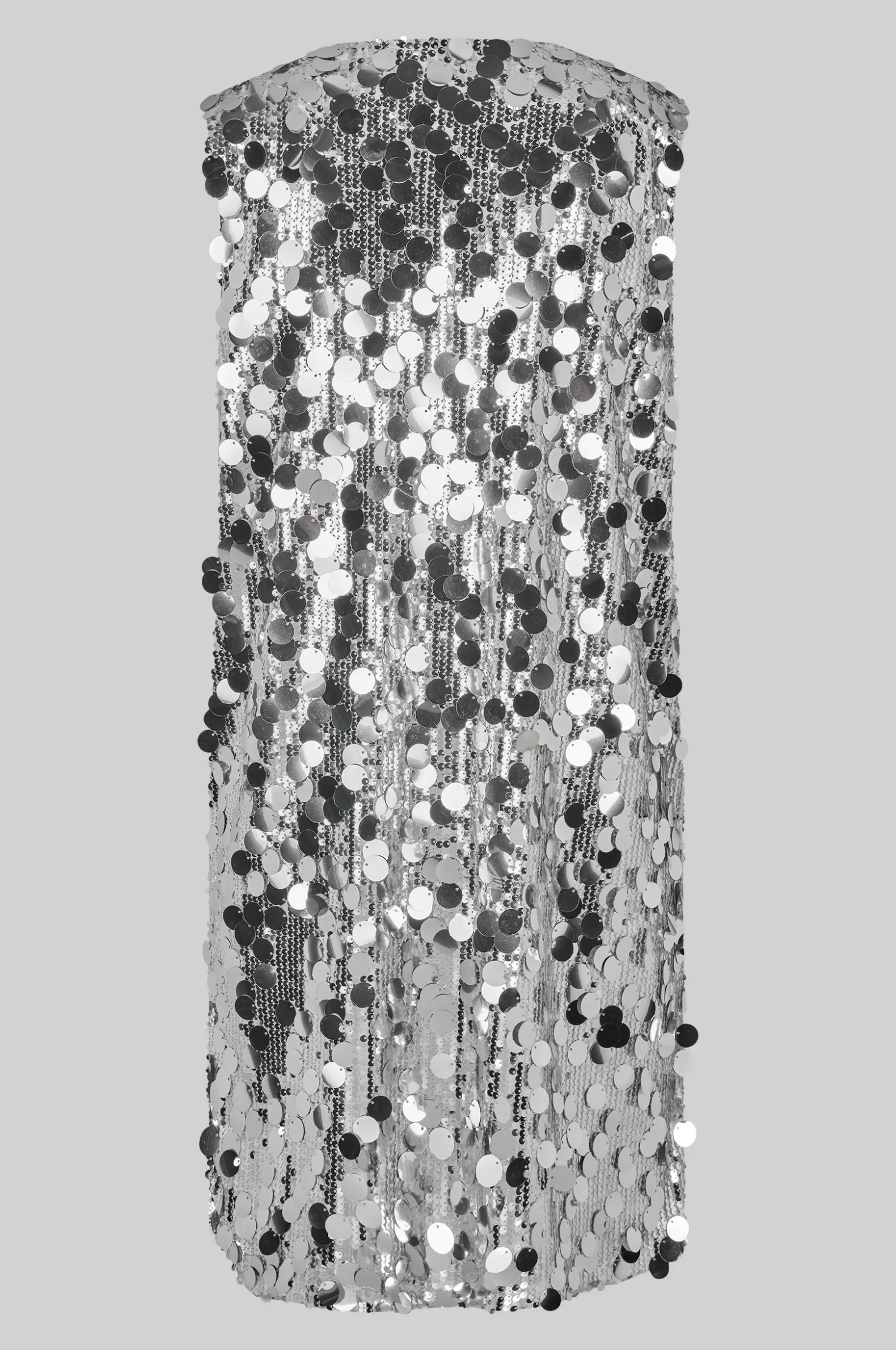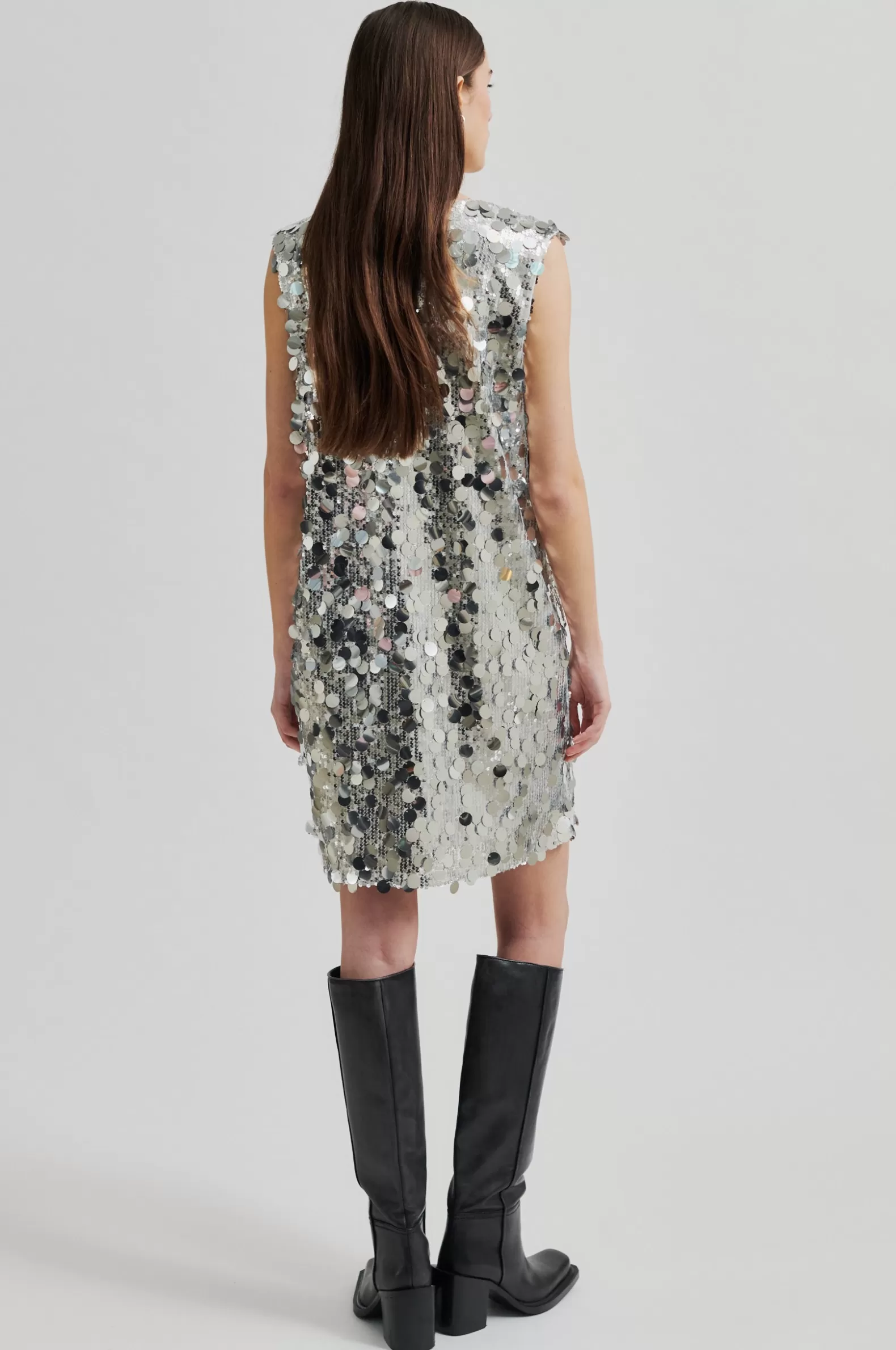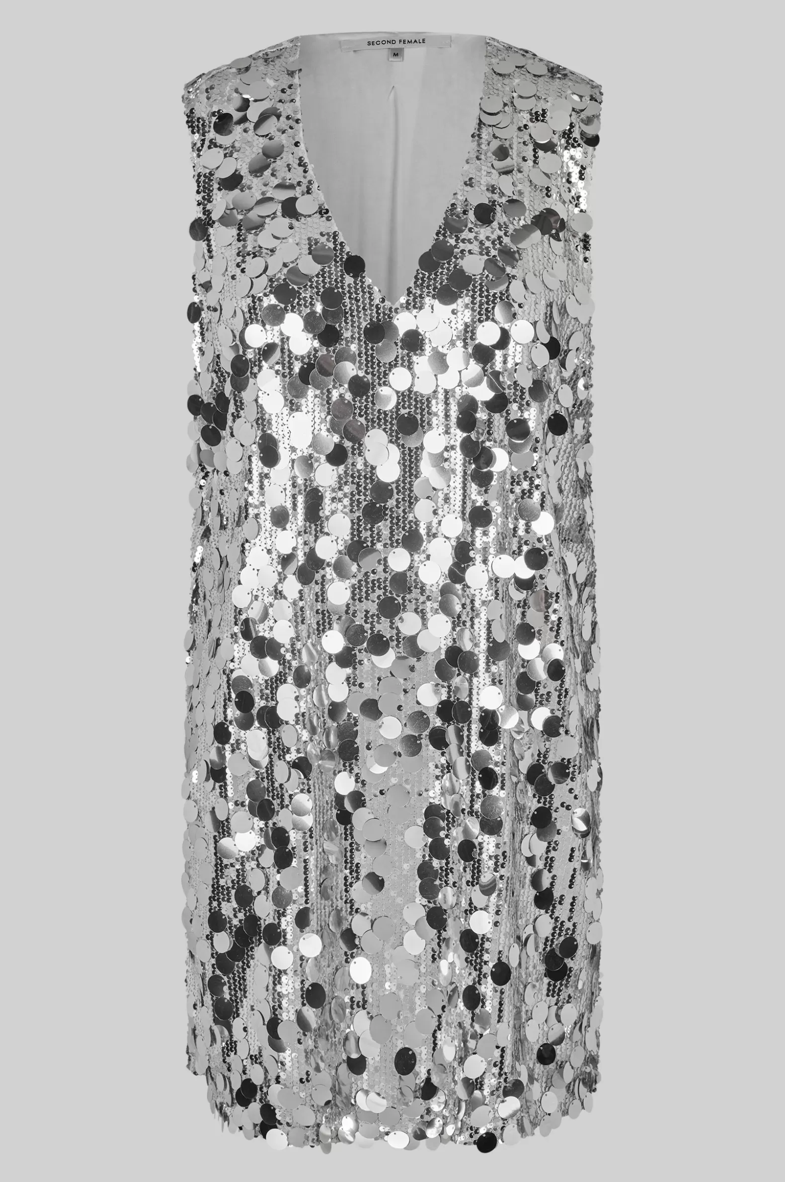 Second Female sequin mini dress. The dress has different sized silver sequins on a tonal mesh background. Featuring a V-neckline and sleeveless design. Fully lined. Regular fit with slight A-shape.