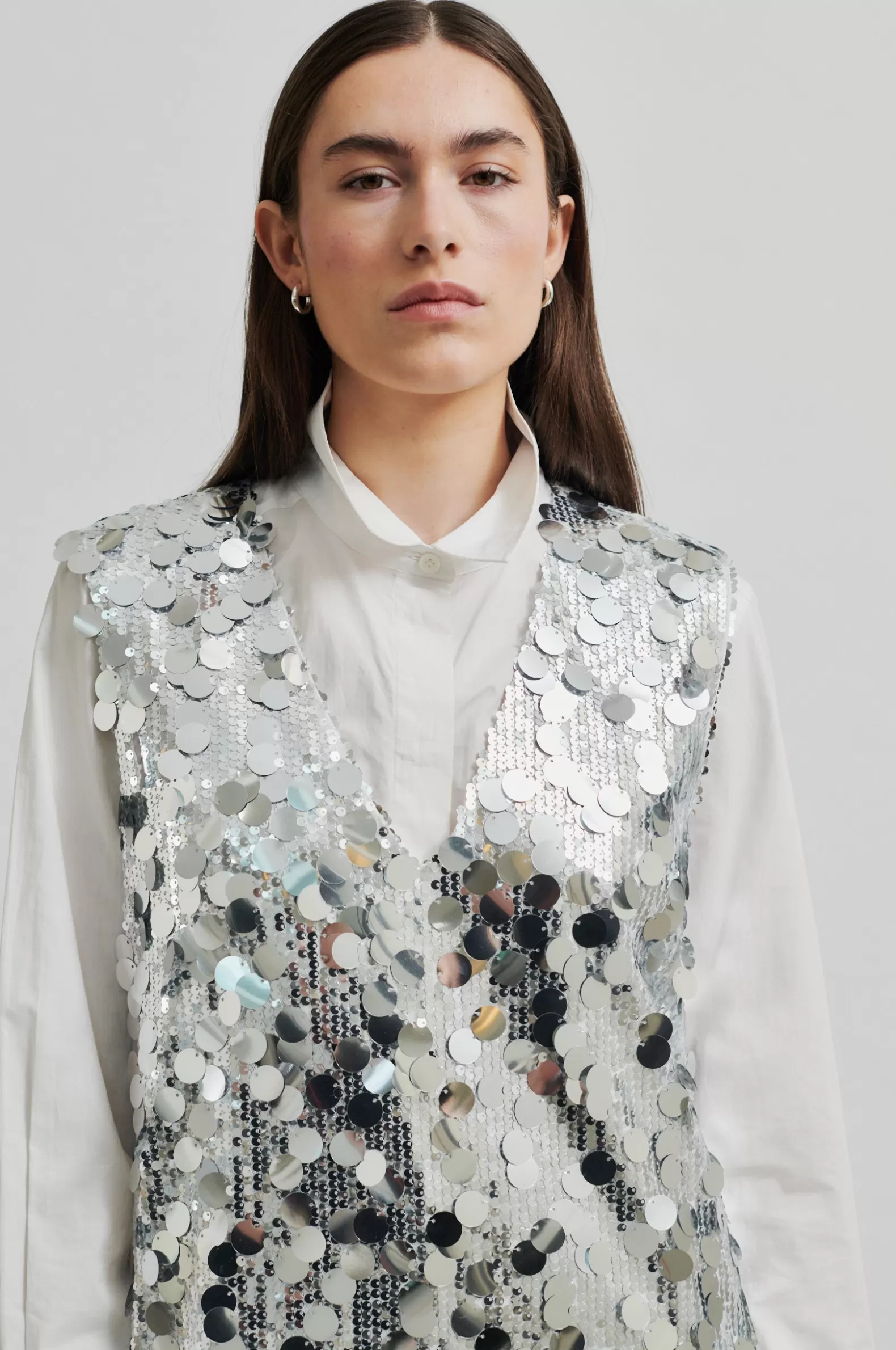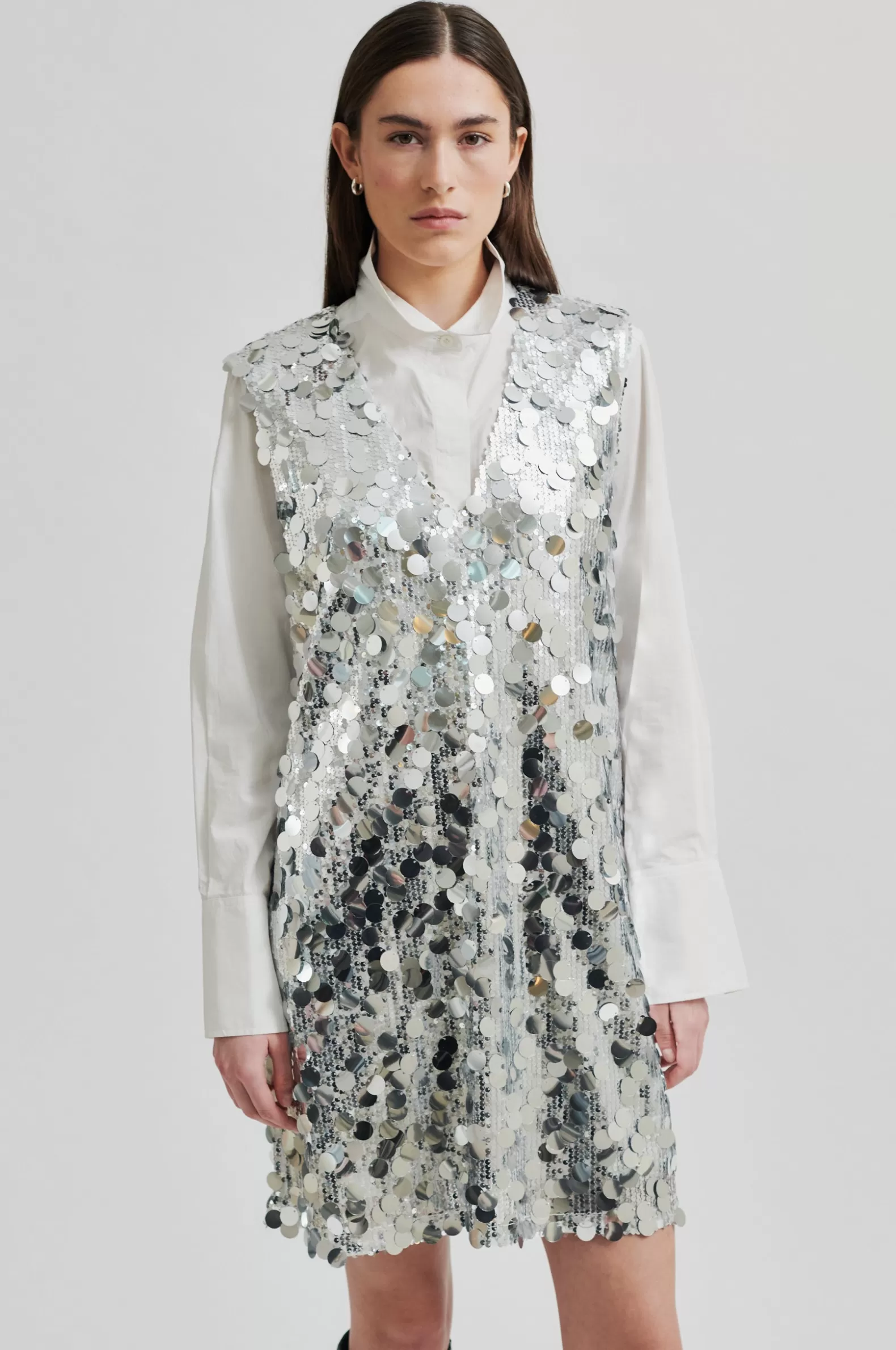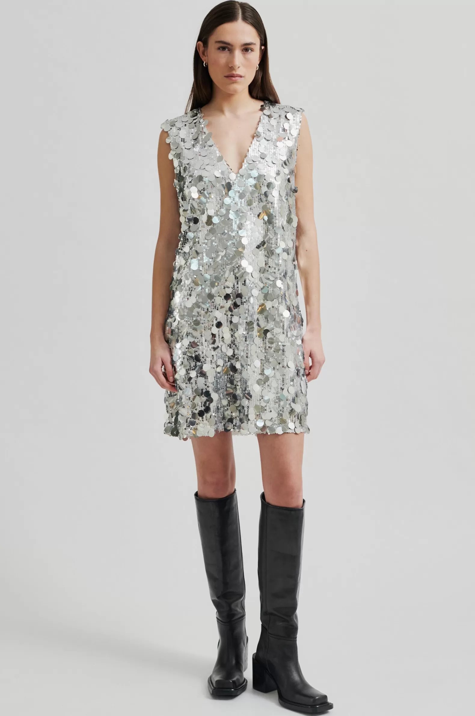 Second Female sequin mini dress. The dress has different sized silver sequins on a tonal mesh background. Featuring a V-neckline and sleeveless design. Fully lined. Regular fit with slight A-shape.