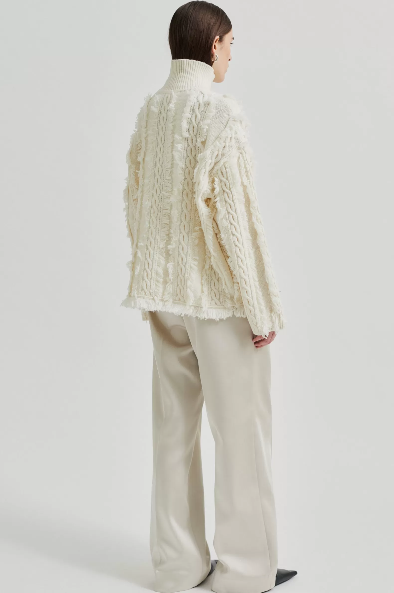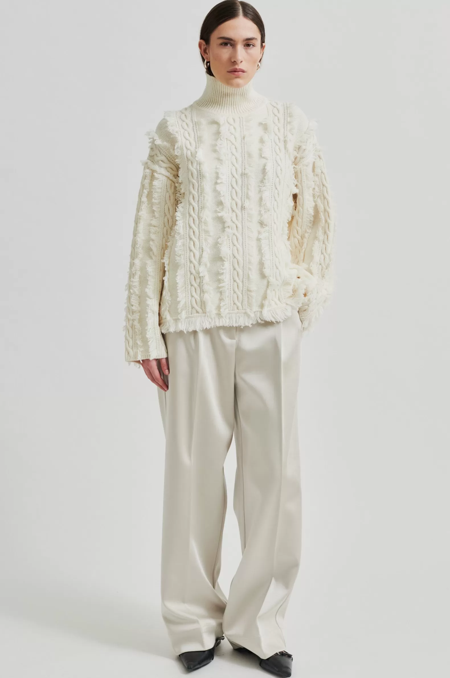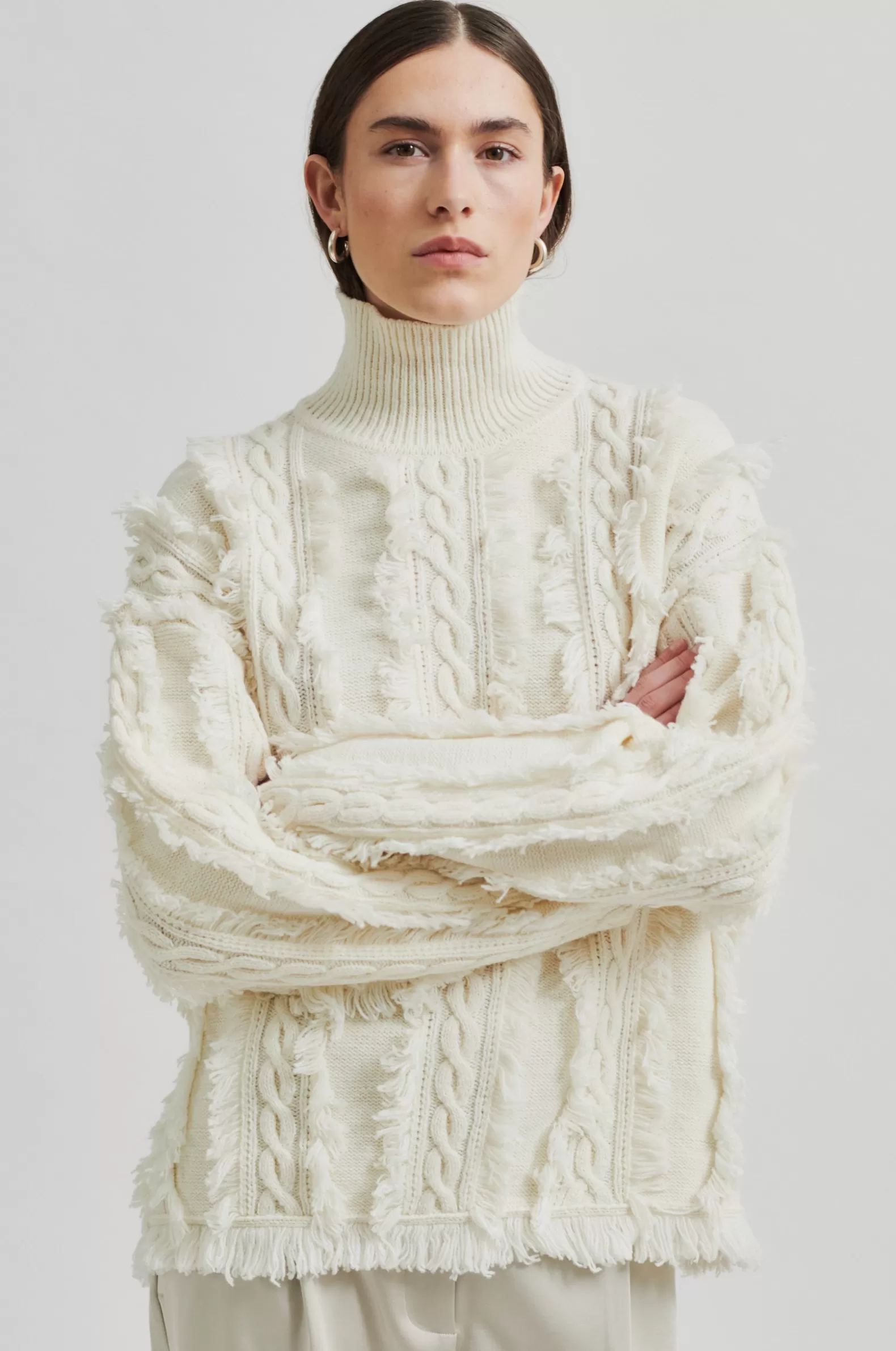 Second Female pullover with fringing. The pullover is made in a soft wool-cotton blend with cable knit pattern and fringing details. Featuring a round neck with dropped shoulders and long sleeves. Wide and relaxed fit.