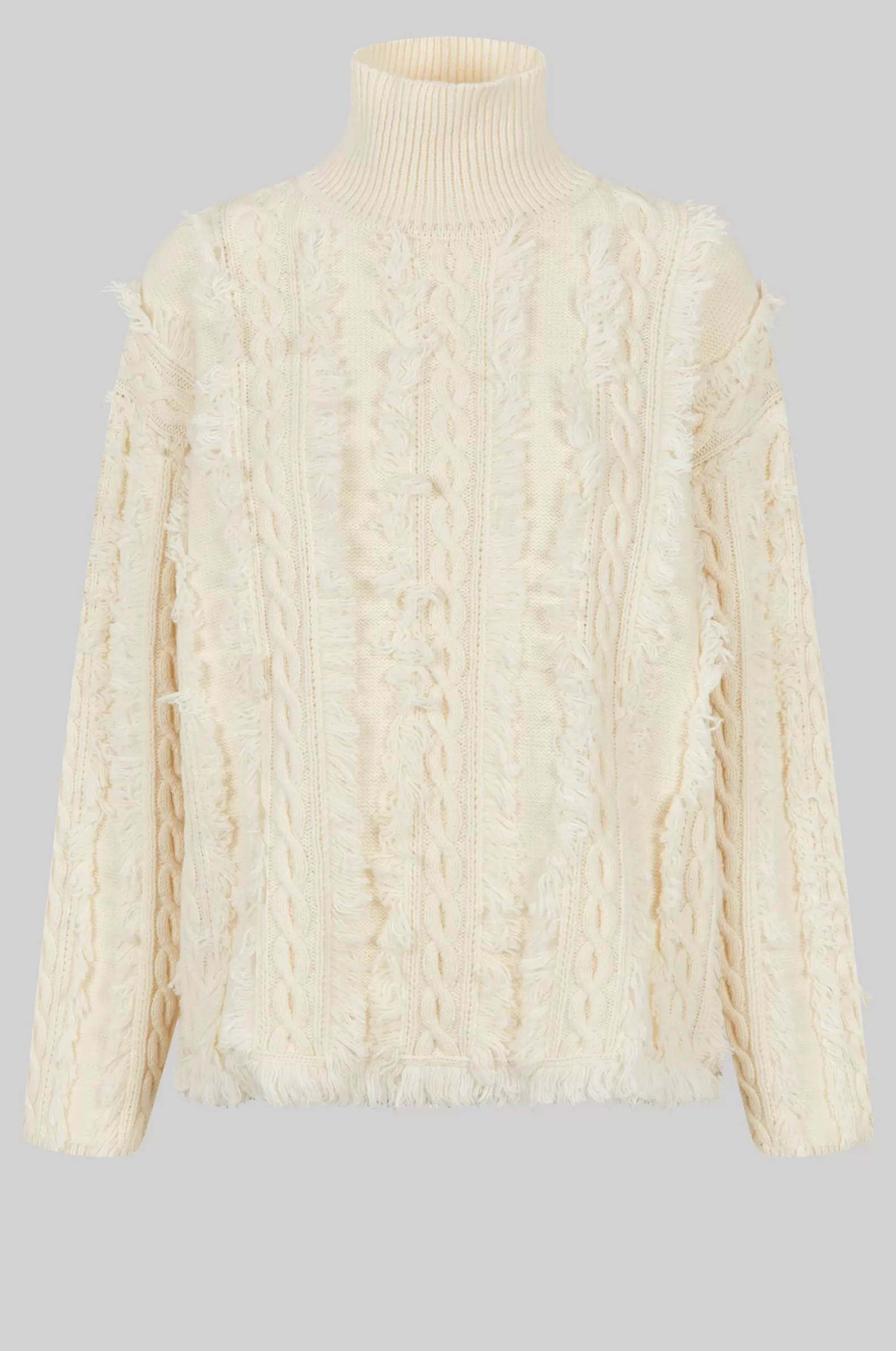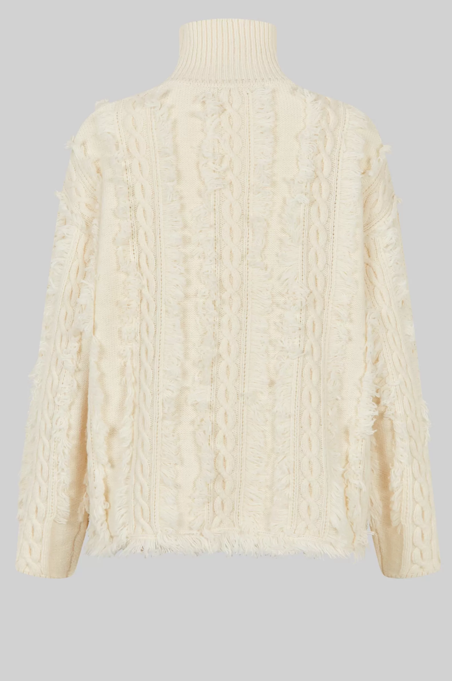 Second Female pullover with fringing. The pullover is made in a soft wool-cotton blend with cable knit pattern and fring…