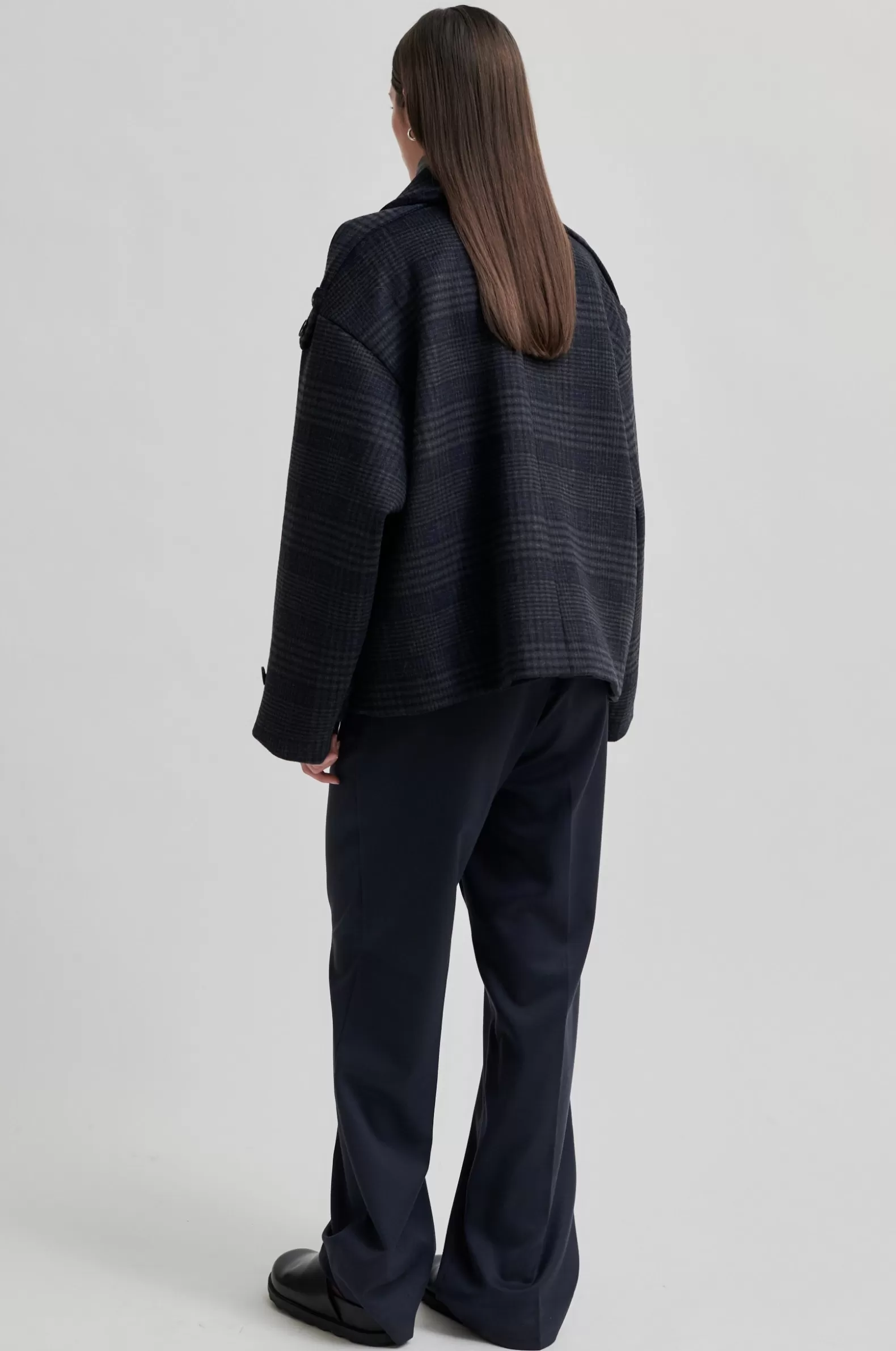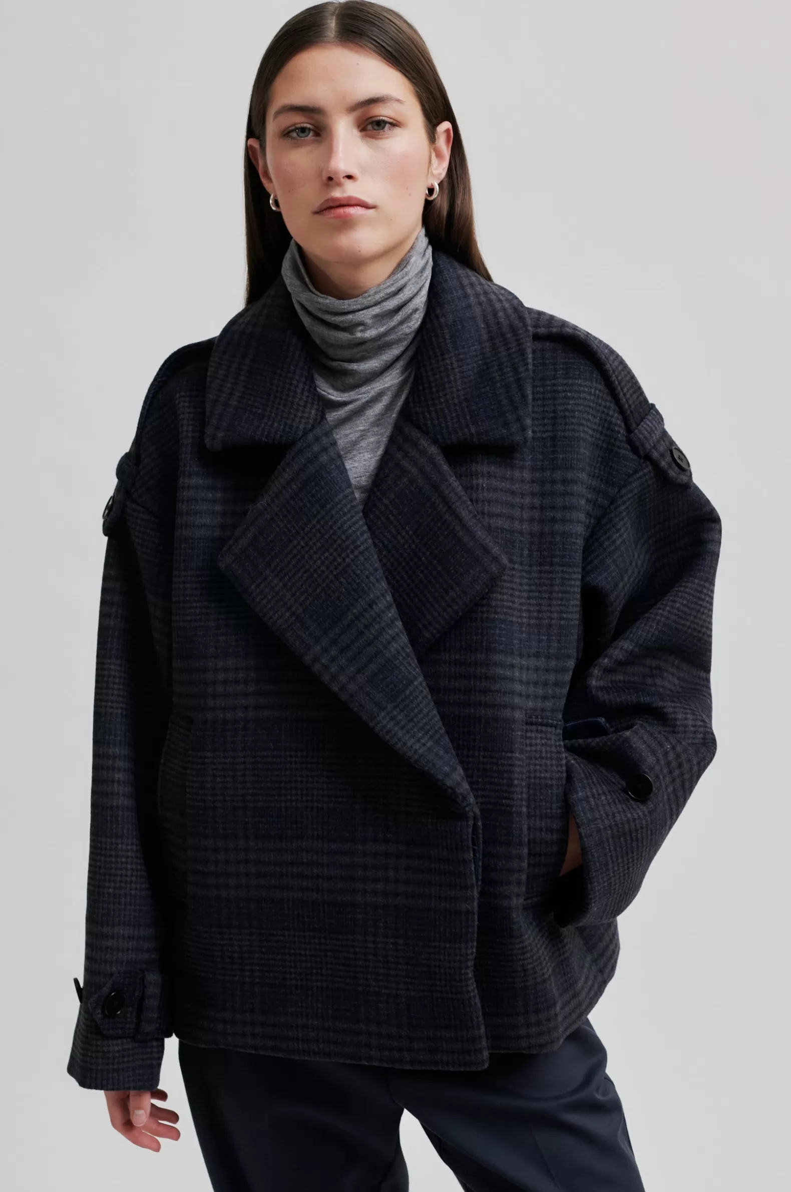 Second Female checked jacket. Made in thick, soft wool blend with checked pattern. Featuring wide notch lapel and concealed asymmetric button fastening at one side. Two deep side pockets. Dropped shoulders with straps and buttons and long sleeves with adjustable straps and buttons at sleeve ends. Fully lined. Wide, straight fit,