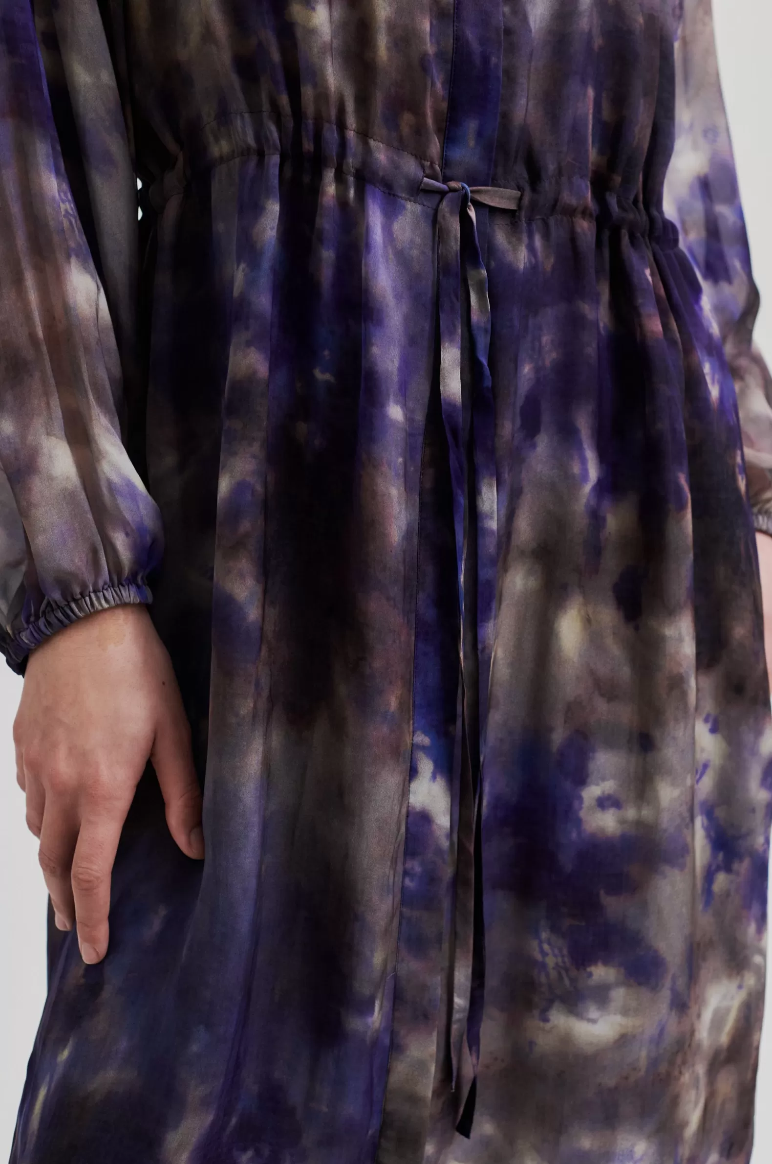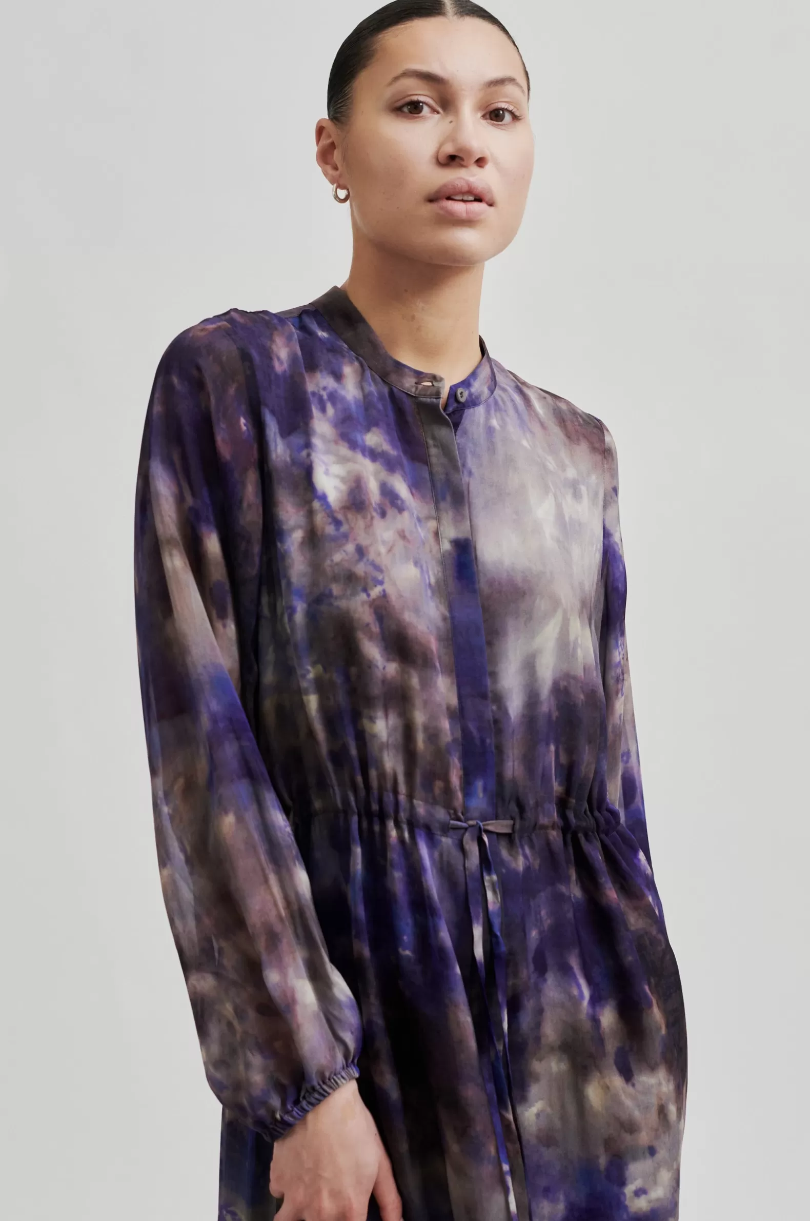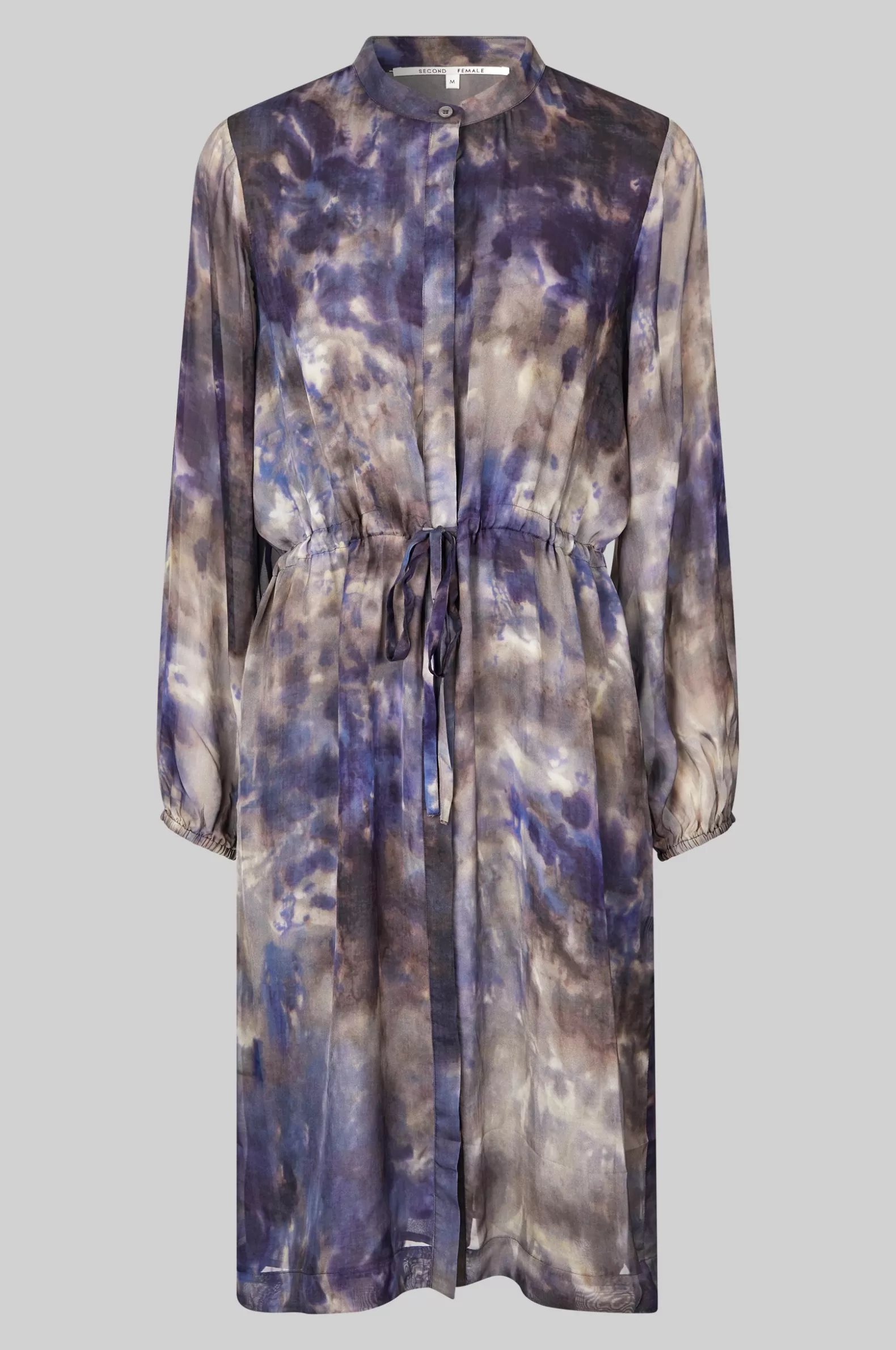 Second Female semi-sheer patterned shirt dress. Made in light and semi-sheer viscose with all-over pattern. Featuring a round neckline with small collar and placket with concealed button fastening and visible top button. Long sleeves with elasticated cuffs. Drawstring with tie fastening at waist. Lined body and unlined sleeves. Regular fit.
