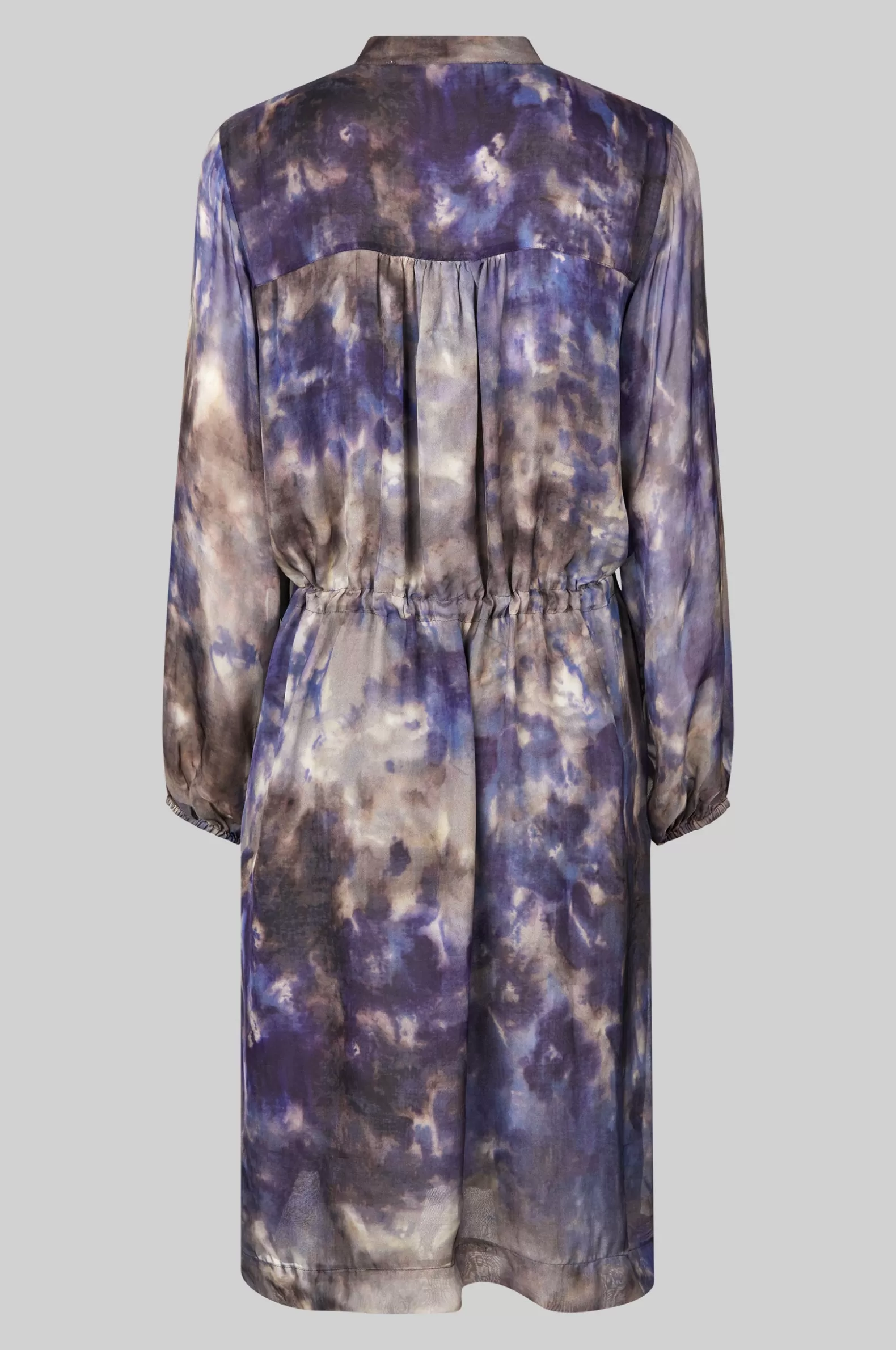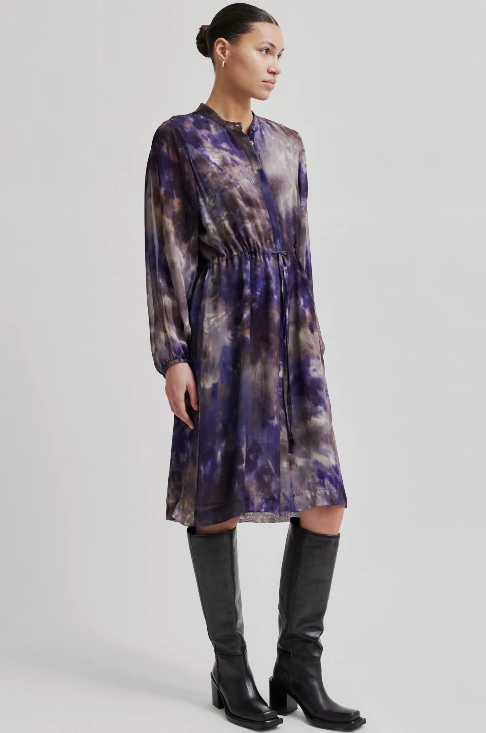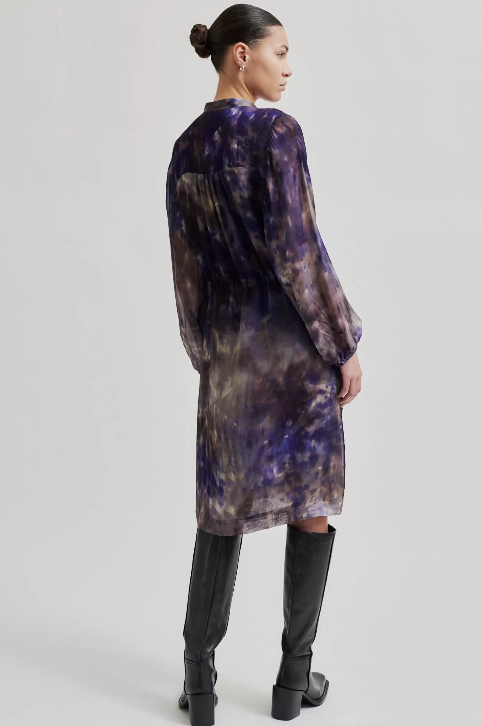 Second Female semi-sheer patterned shirt dress. Made in light and semi-sheer viscose with all-over pattern. Featuring a round neckline with small collar and placket with concealed button fastening and visible top button. Long sleeves with elasticated cuffs. Drawstring with tie fastening at waist. Lined body and unlined sleeves. Regular fit.