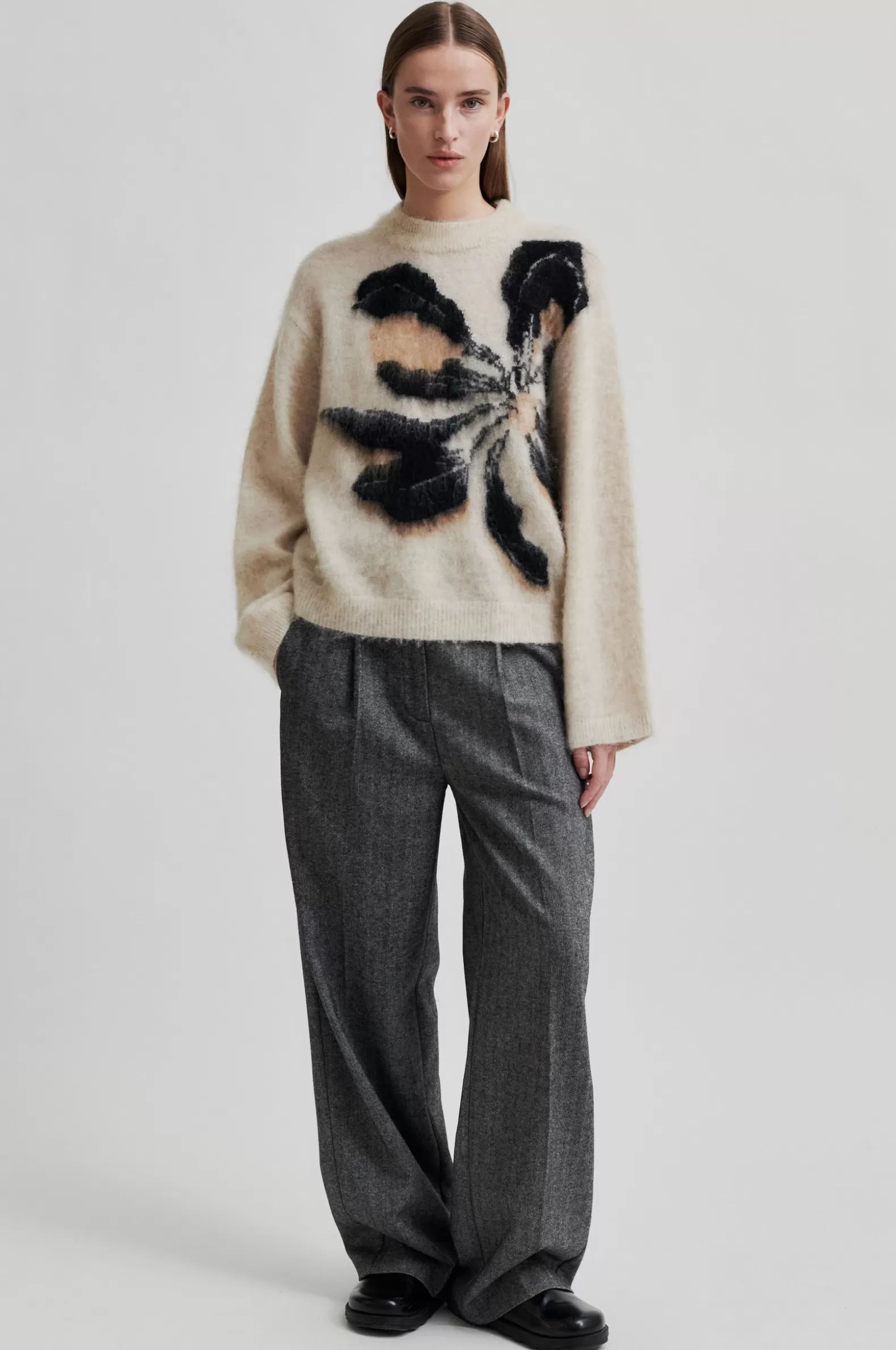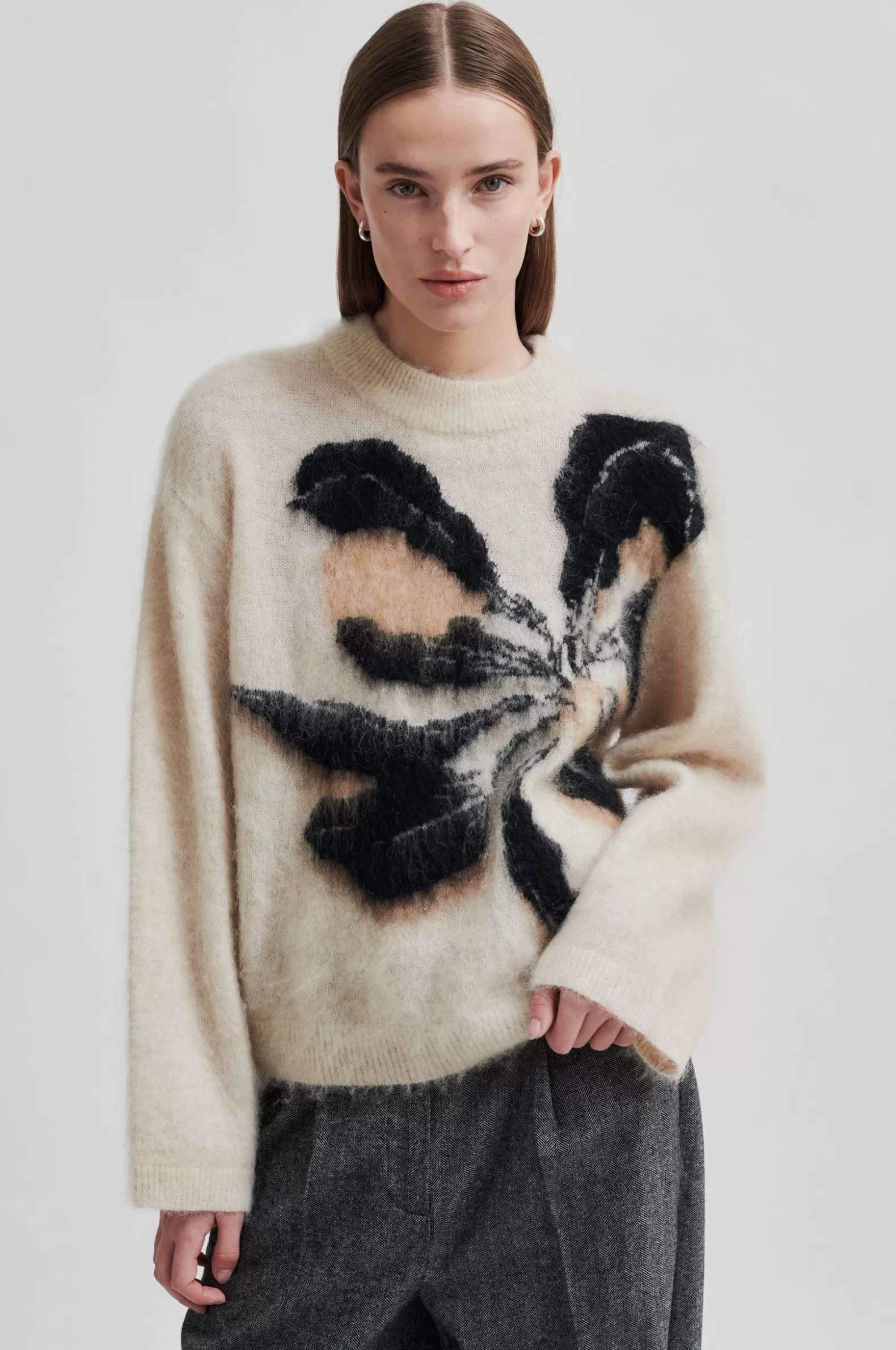 Second Female pullover with knitted pattern. Made in soft and stretchy merino blend with fluffy quality and knitted flower on main body and sleeves. Dropped shoulders with long sleeves. Loose and comfortable fit.