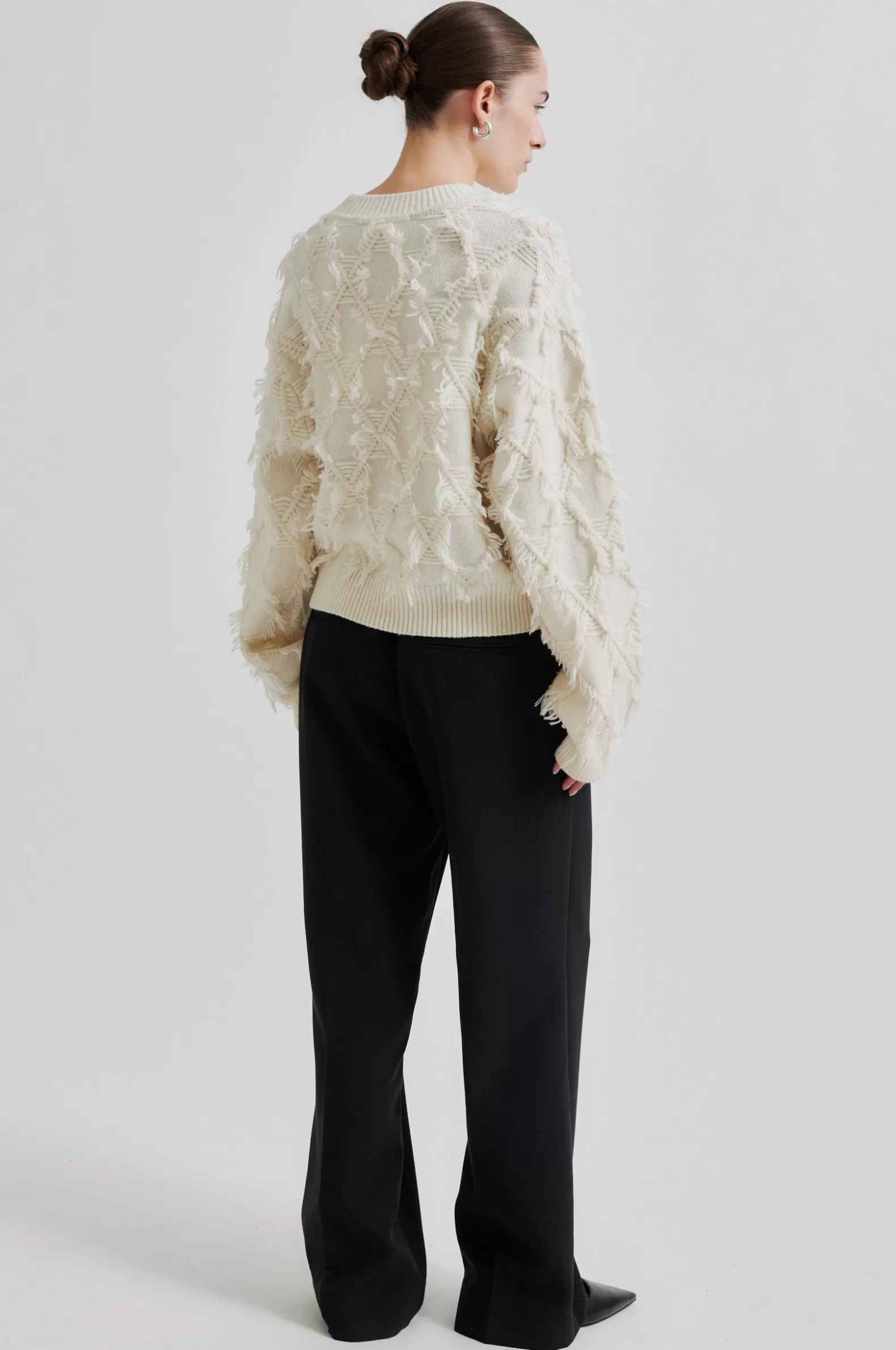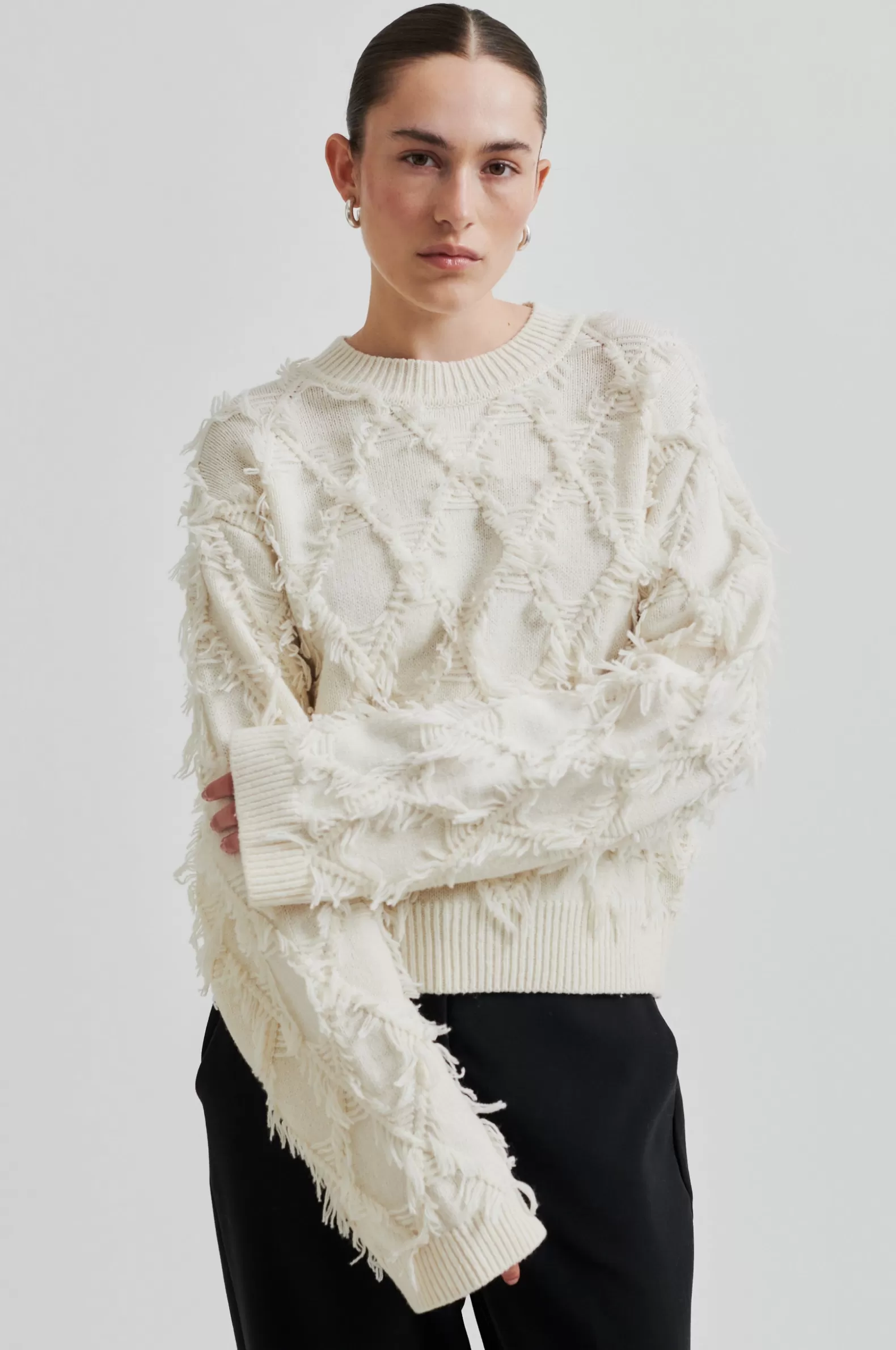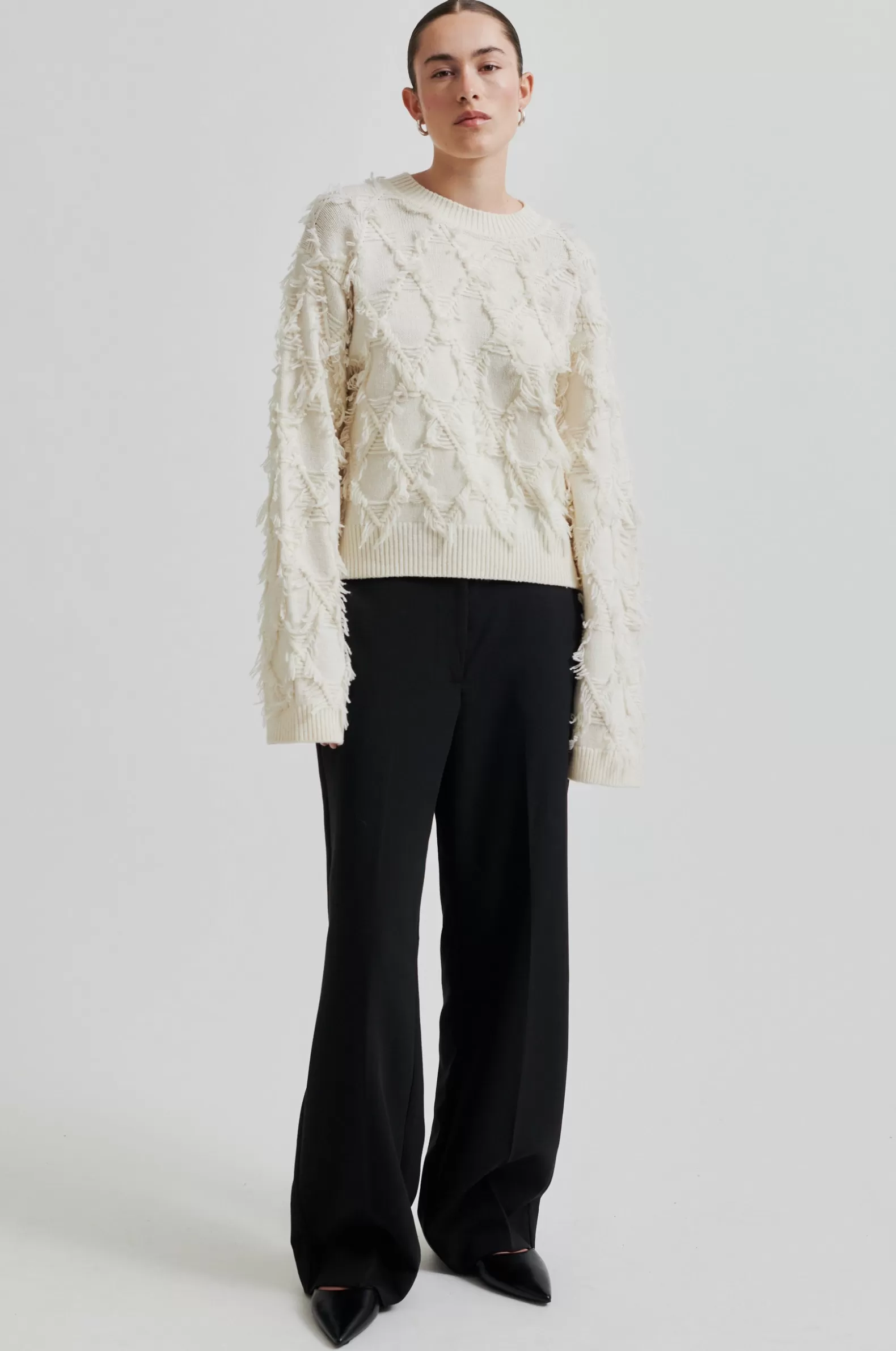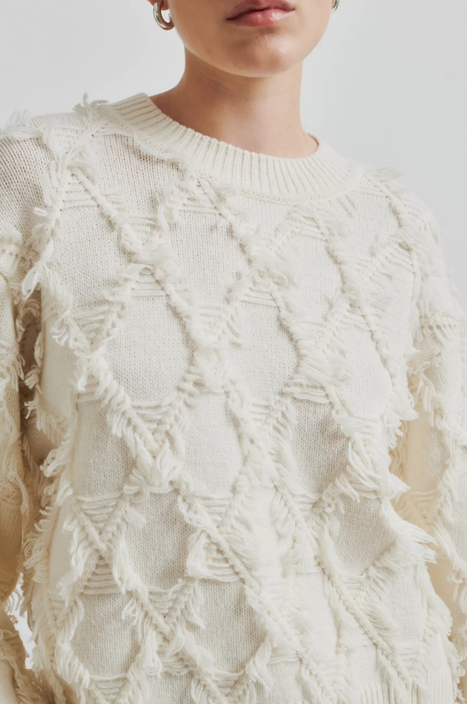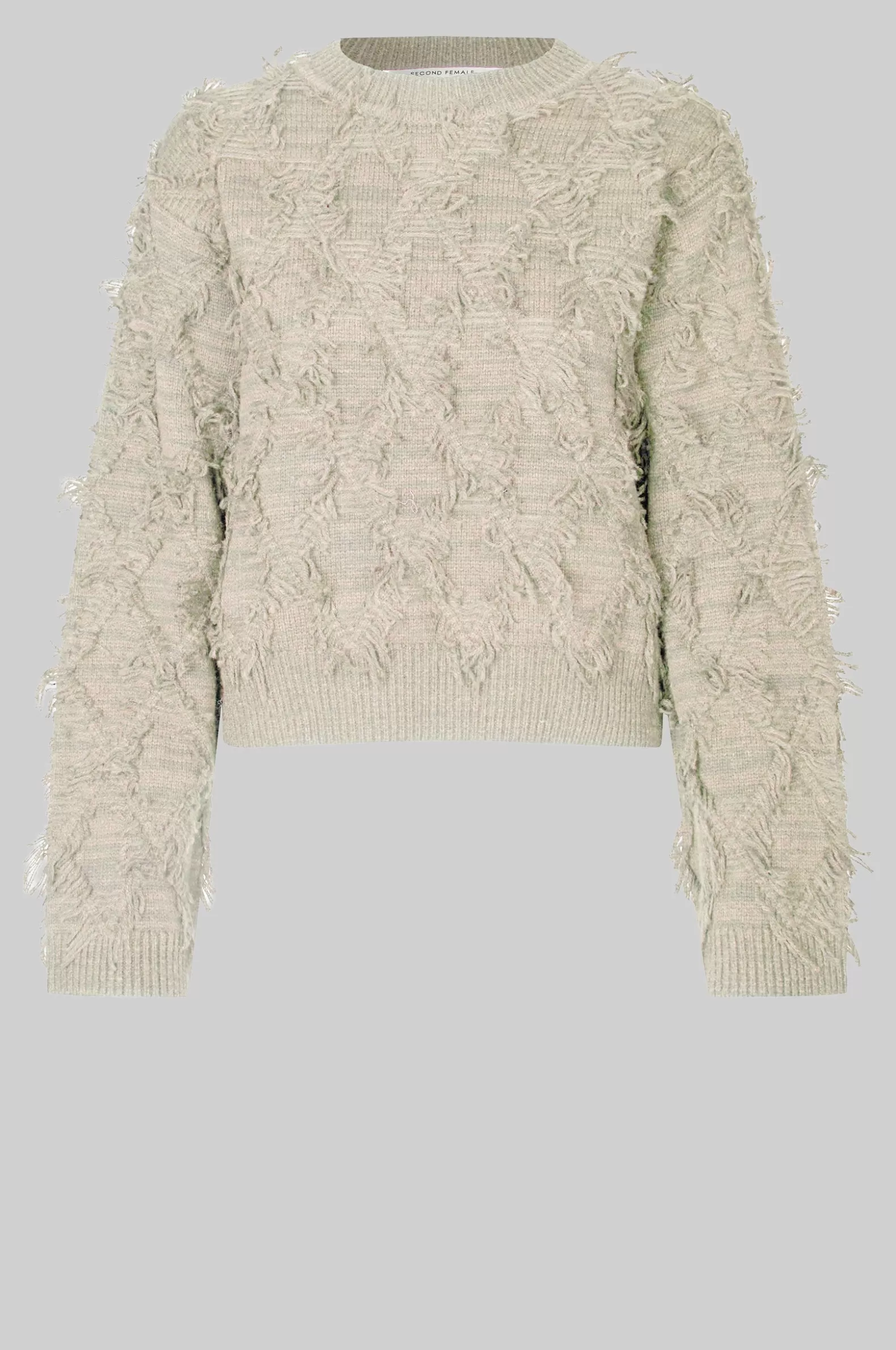 Second Female textured pullover. Made in soft and light wool blend with tassels that create textured effect. Featuring a round neckline and dropped shoulders with long sleeves. Ribbed neck, cuffs and bottom hem. Regular, slightly boxy fit.