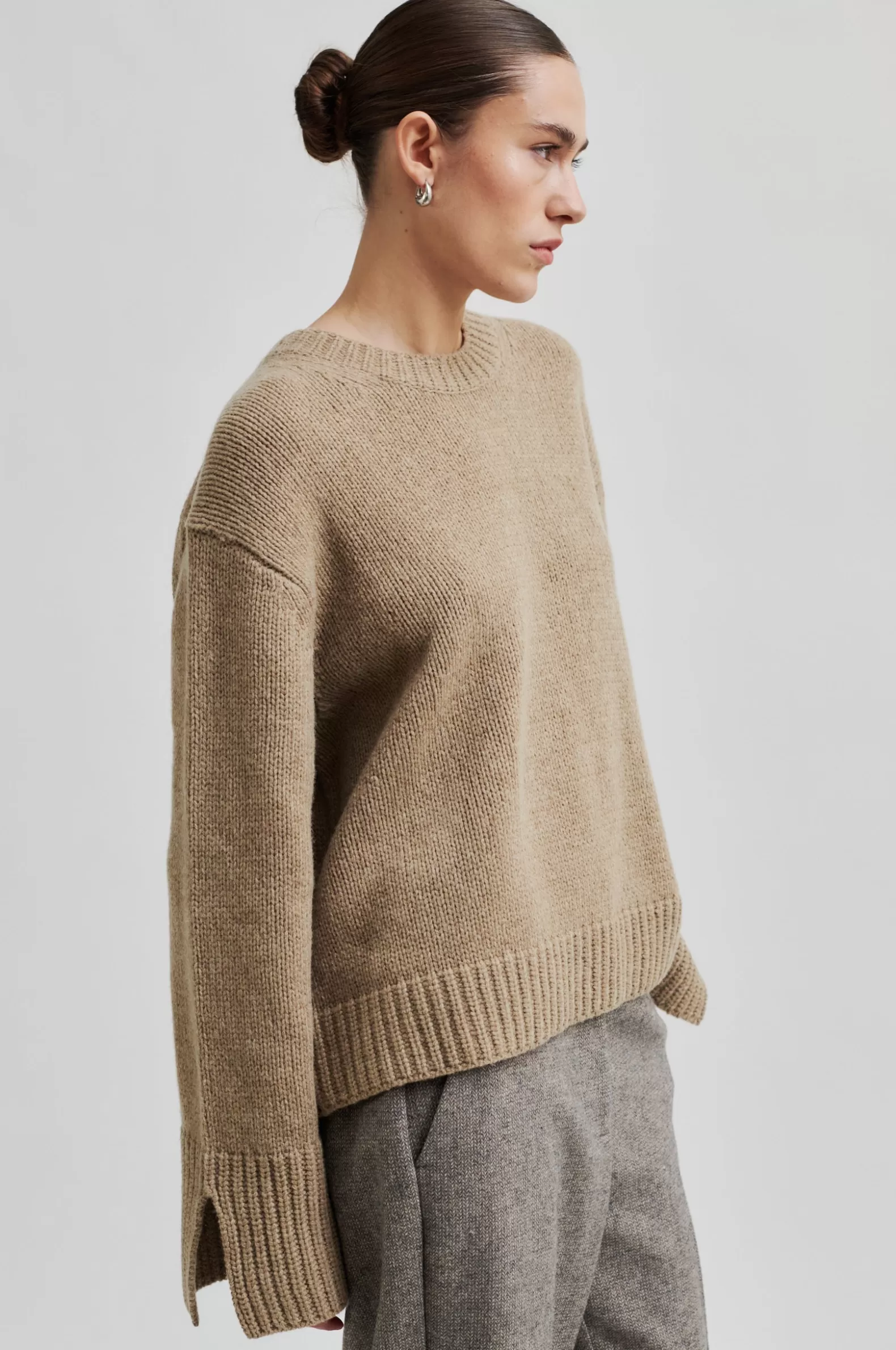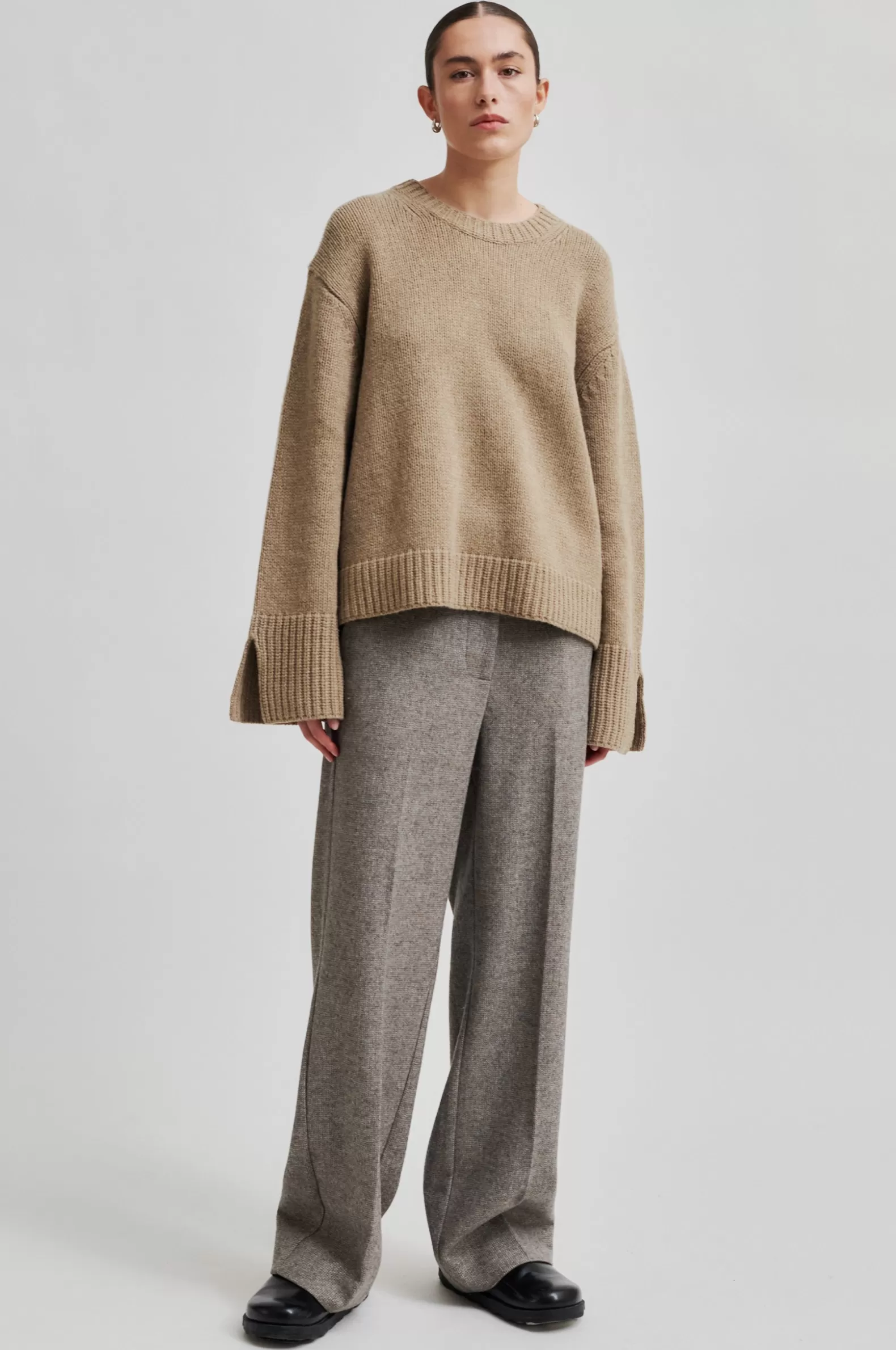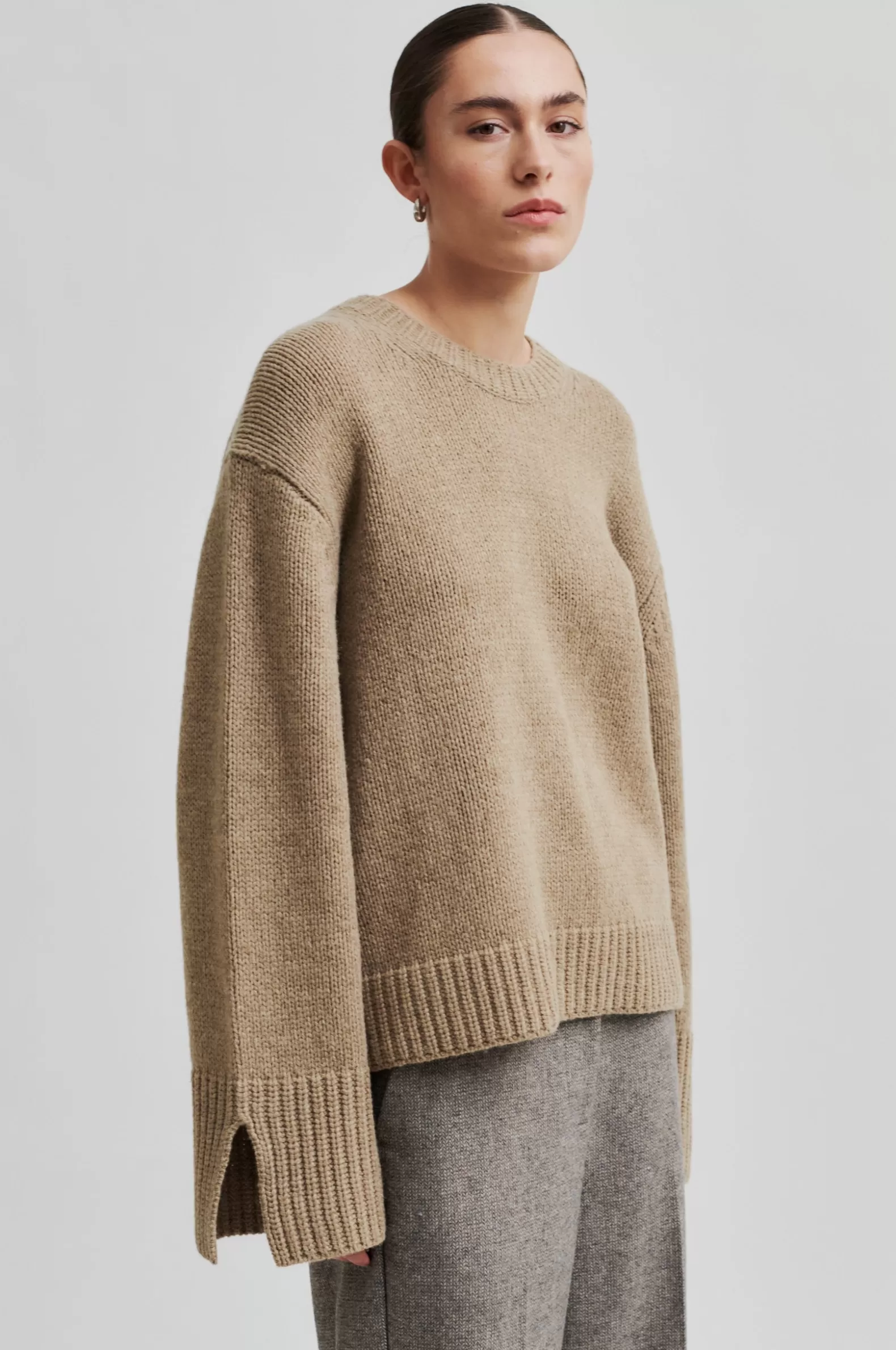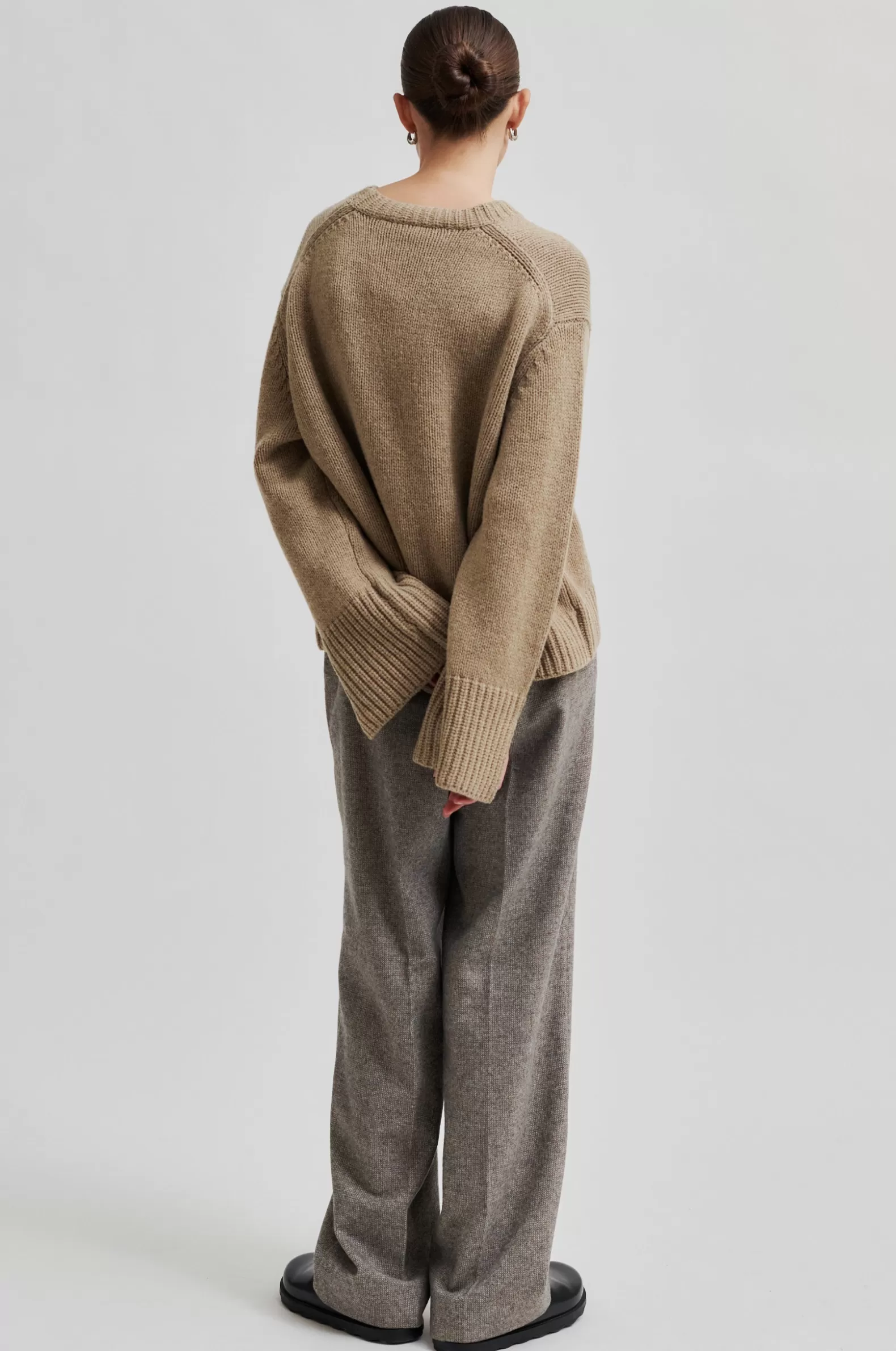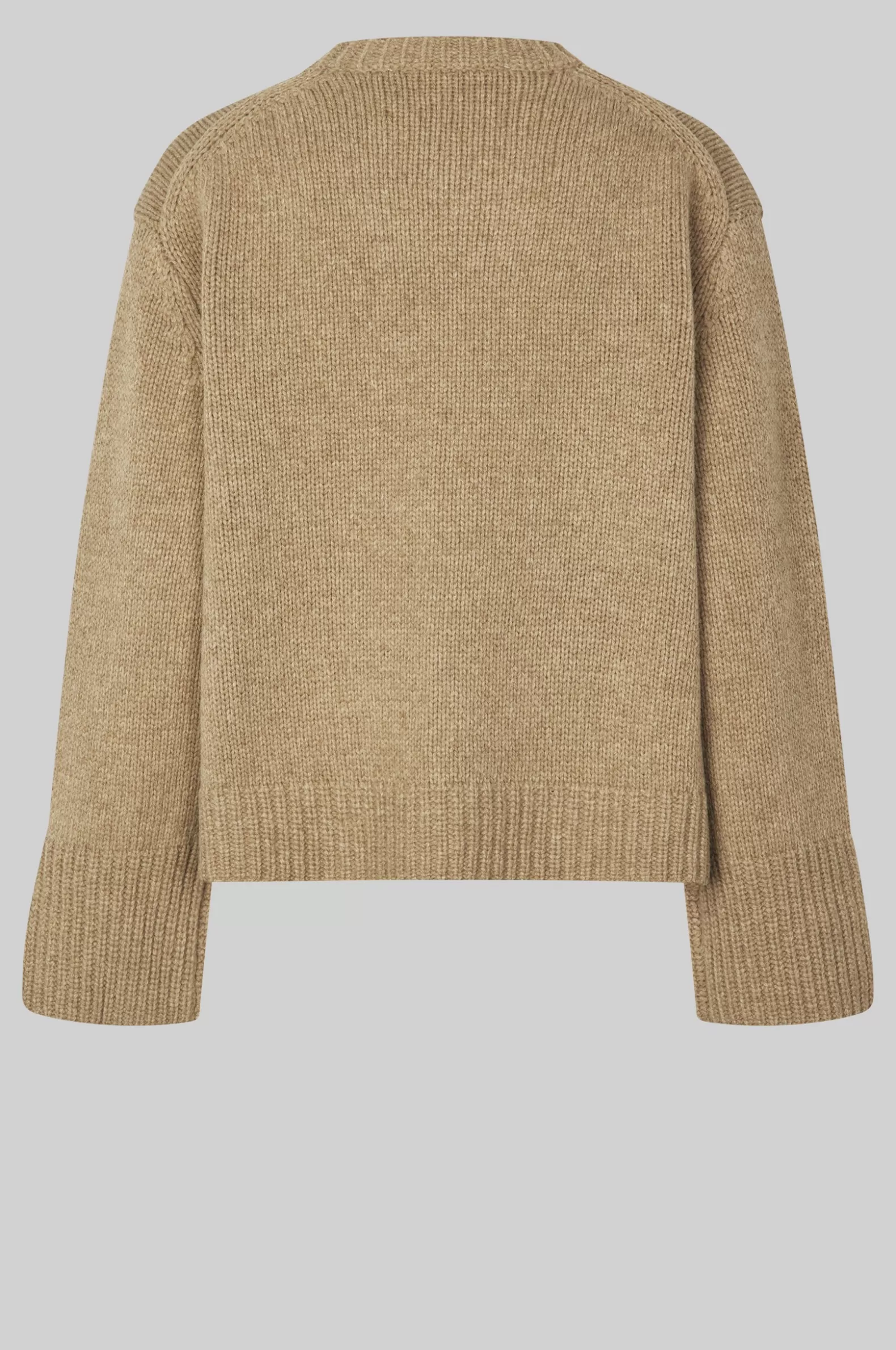 Second Female cardigan with pockets. Made in thick and heavy recycled wool blend. Featuring a round neckline. Dropped shoulders and long sleeves with wide ribbed cuffs and slits at ends. Ribbed trim at neck and bottom hem. Wide and slouchy fit.