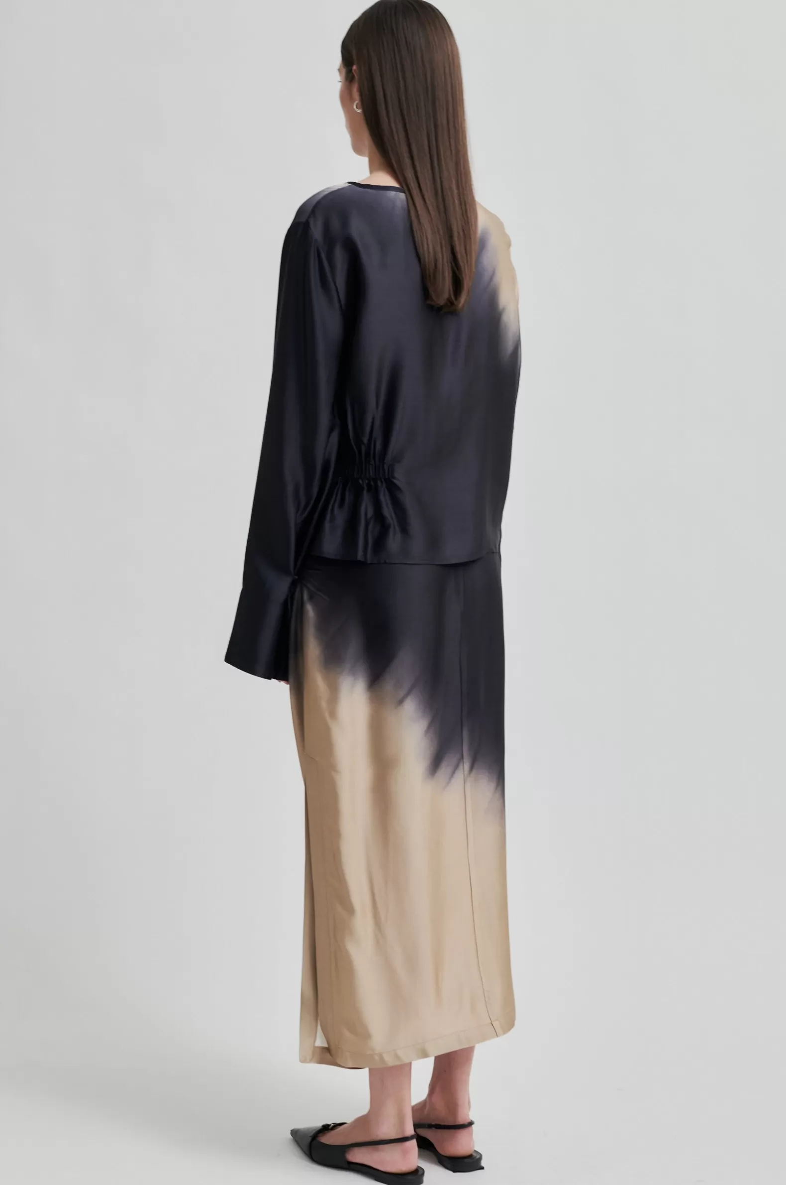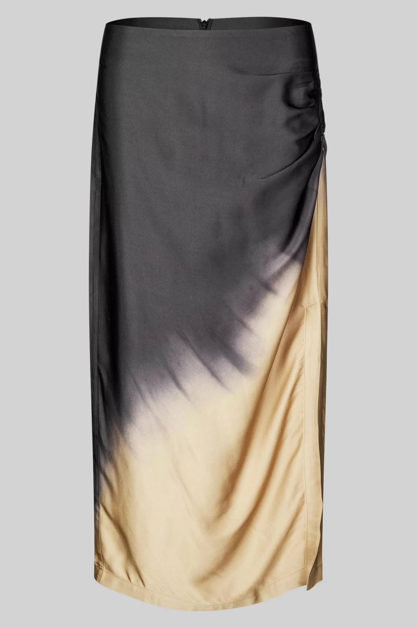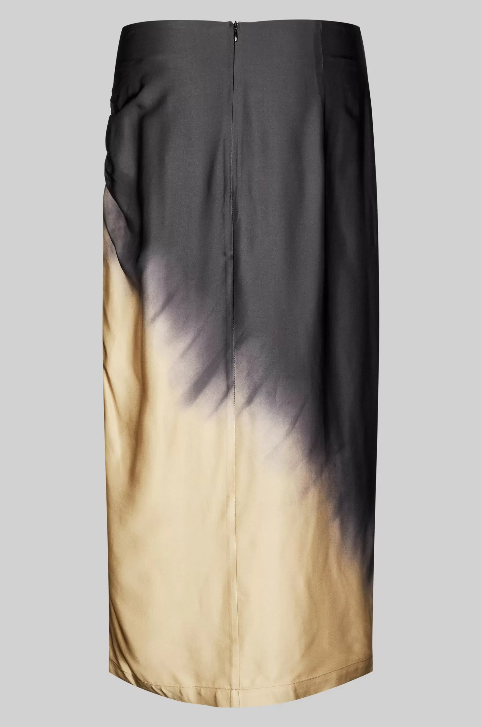Second Female two-tone skirt. Made in soft and smooth viscose with drapy quality. Featuring a concealed zip fastening at the back. Gathers at one side seam that creates draped effect. Deep slit at one side. Slim and flattering fit.