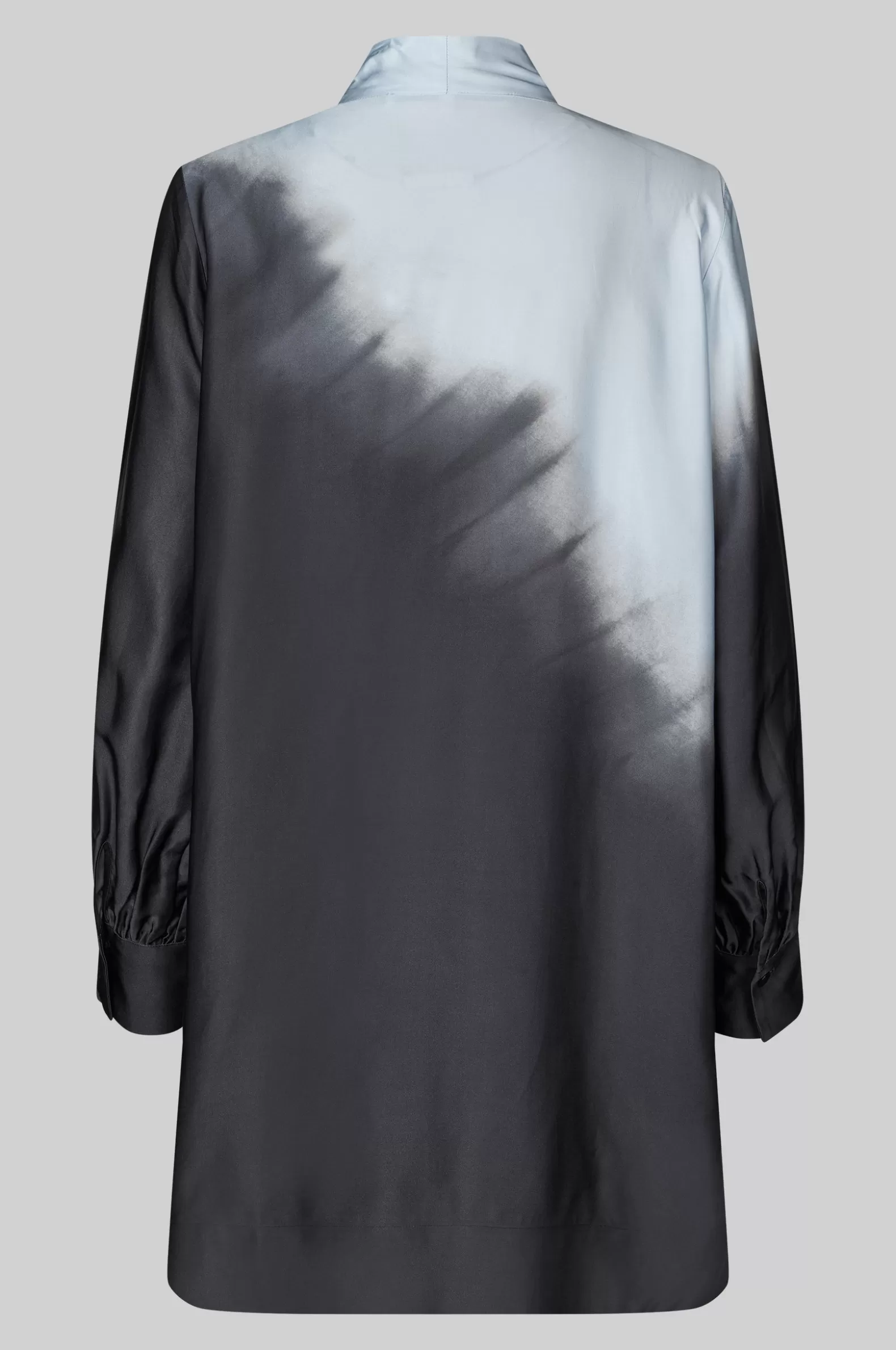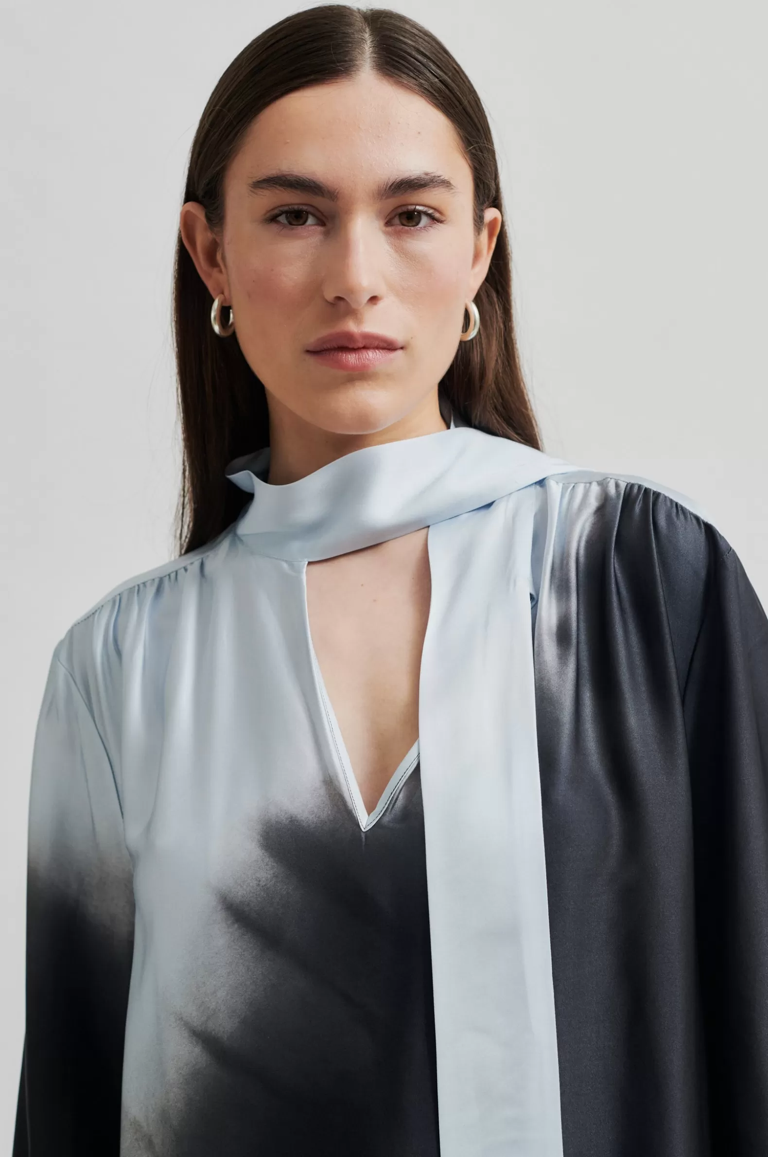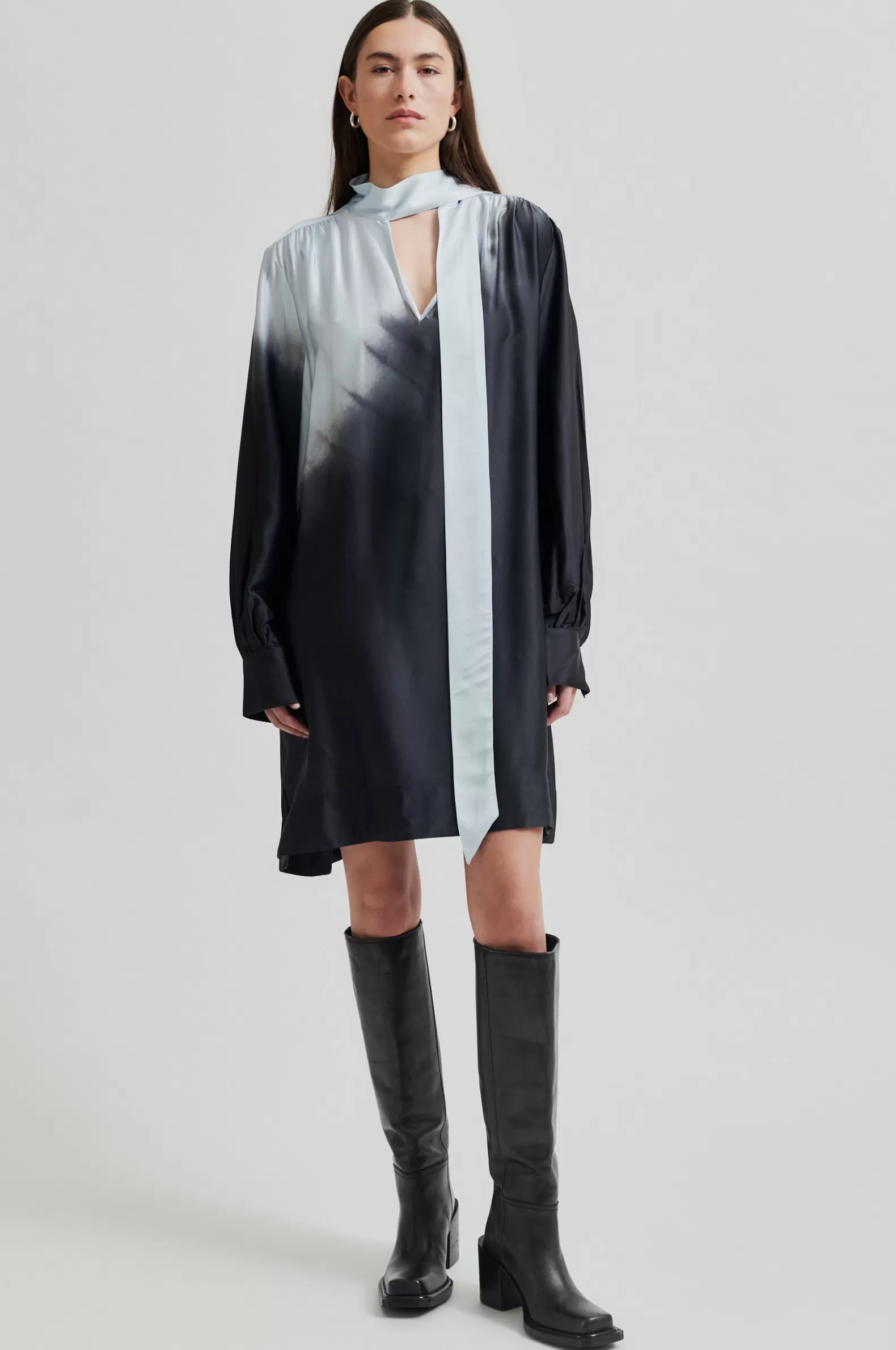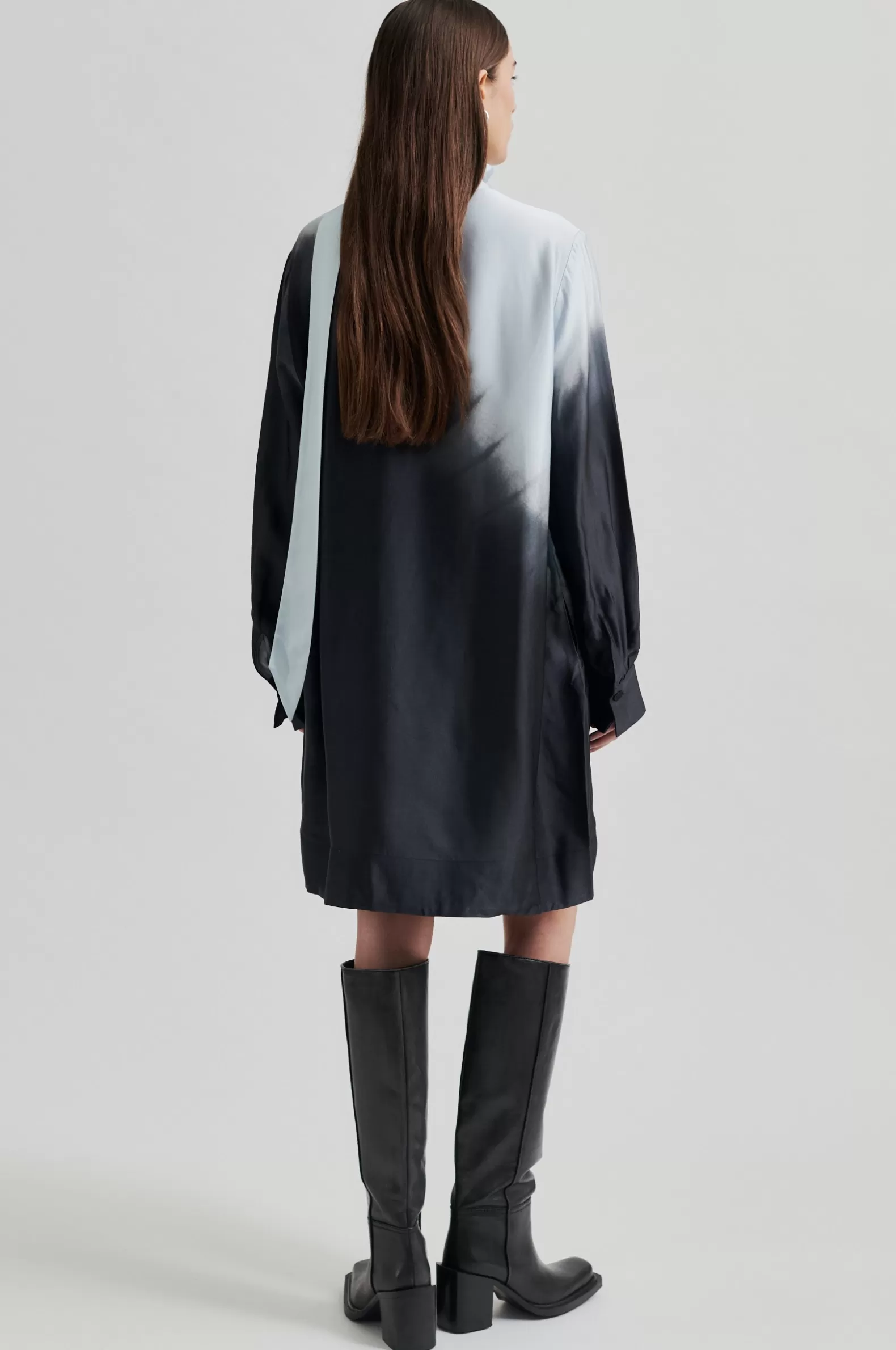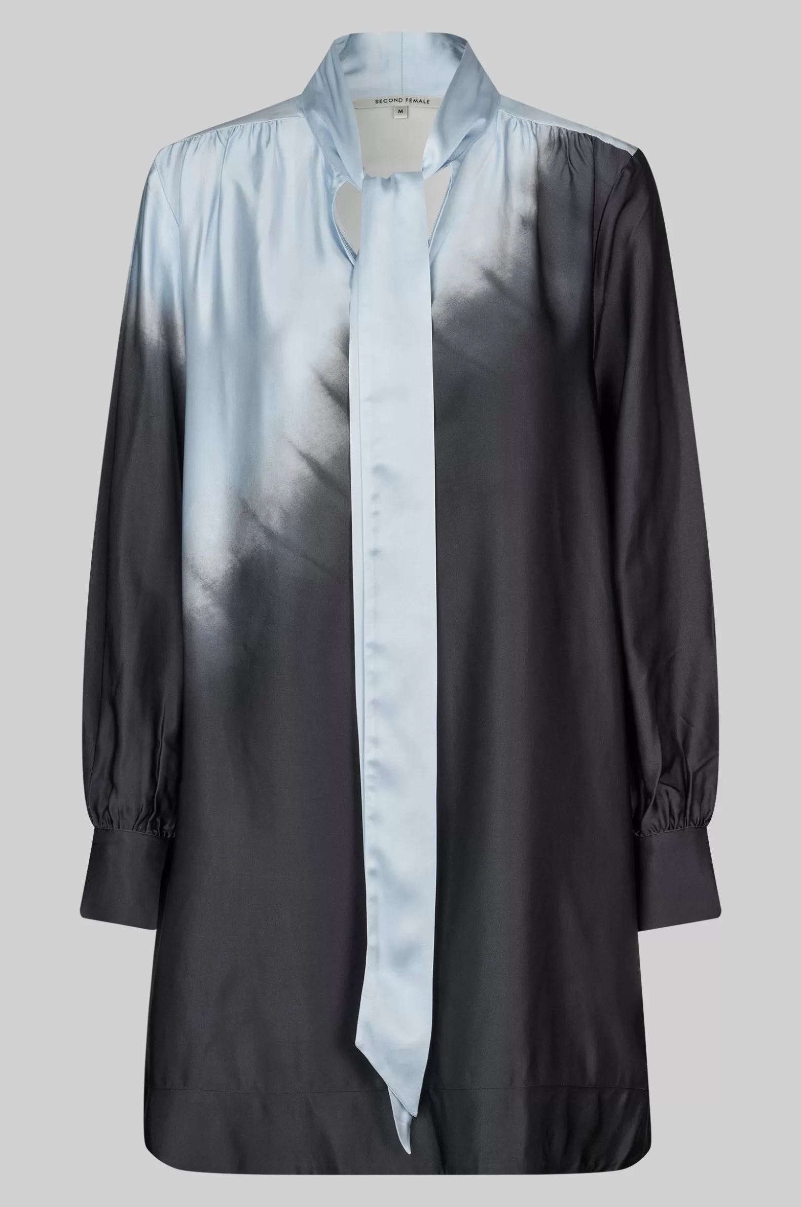 Second Female dip-dye mini dress. The dress is made in soft and smooth viscose with a dip-dye pattern. Featuring an open neckline with long ties that fasten at the neck. Long sleeves with buttoned cuffs and two in-seam side pockets. Loose and straight fit with fluid silhouette.