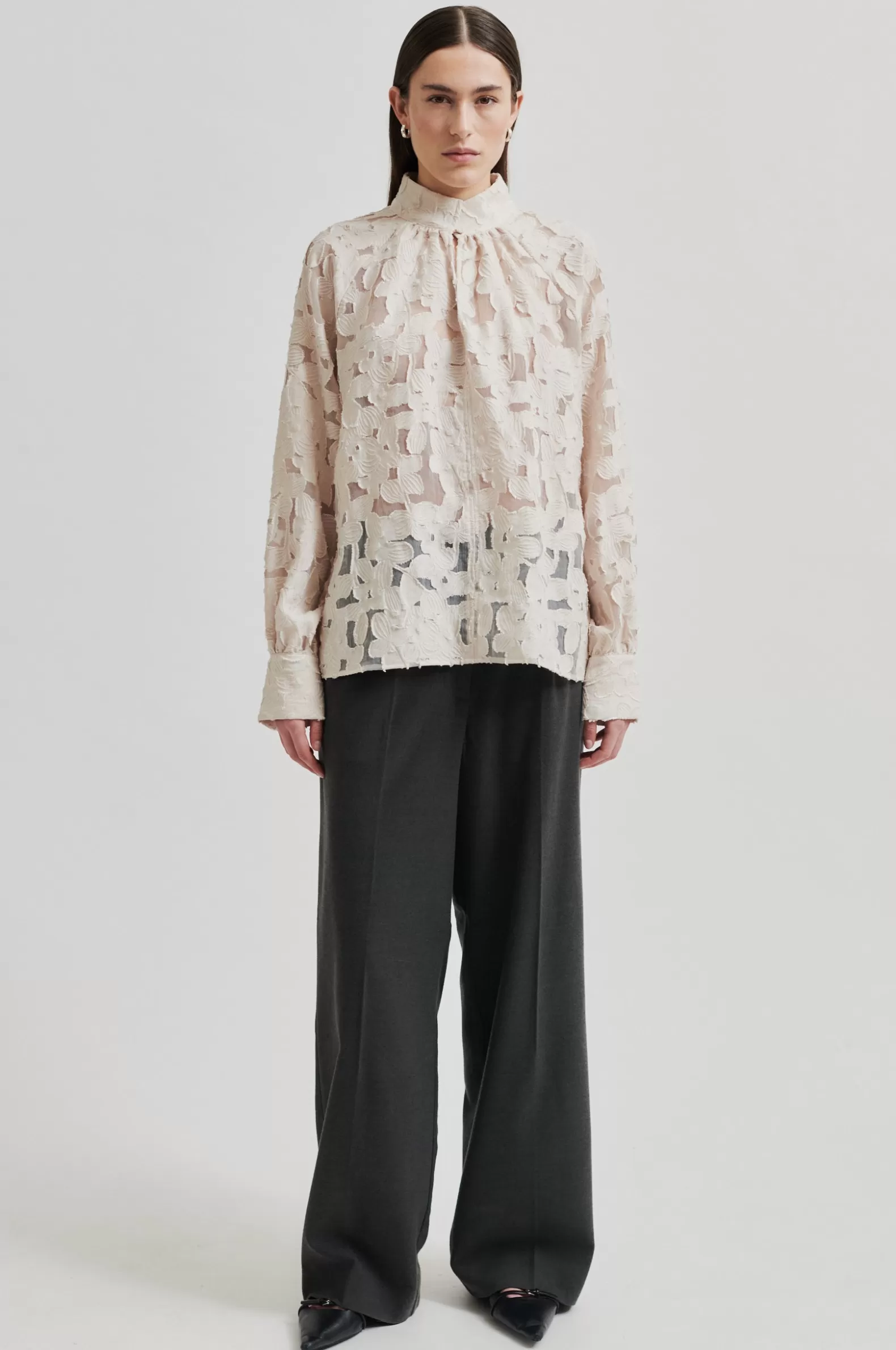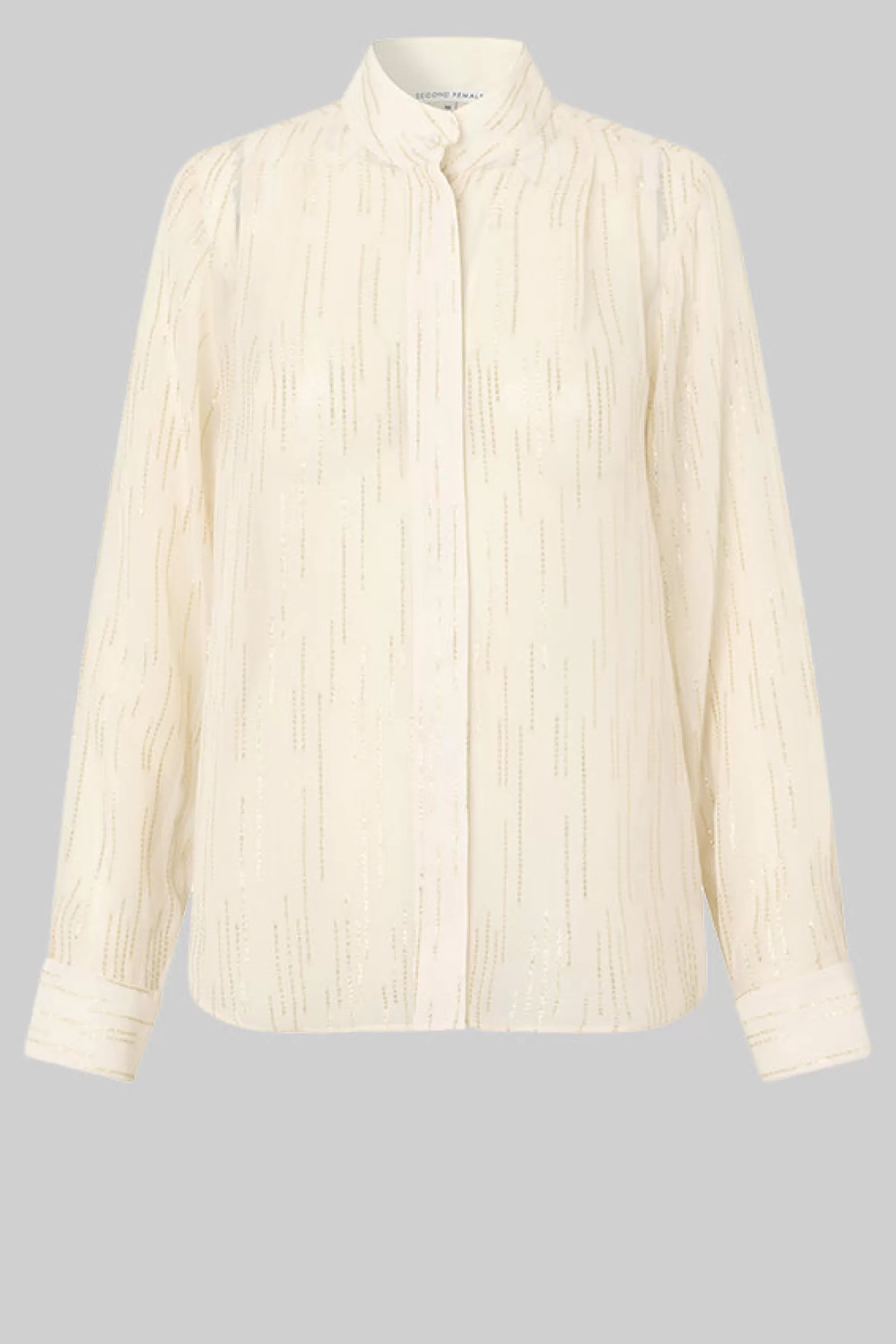 Second Female semi-sheer shirt. The shirt is made light in semi-sheer viscose with all-over glittery pattern. Featuring a high neck with button-though fastening at the front. Pleats at the front and slightly long sleeves with buttoned cuffs. Relaxed fit.