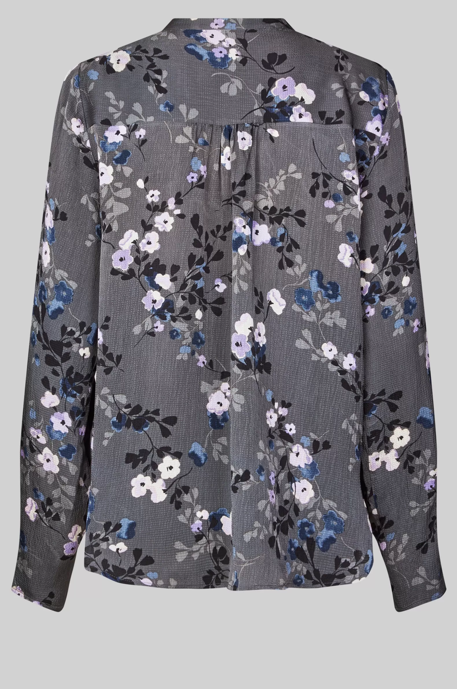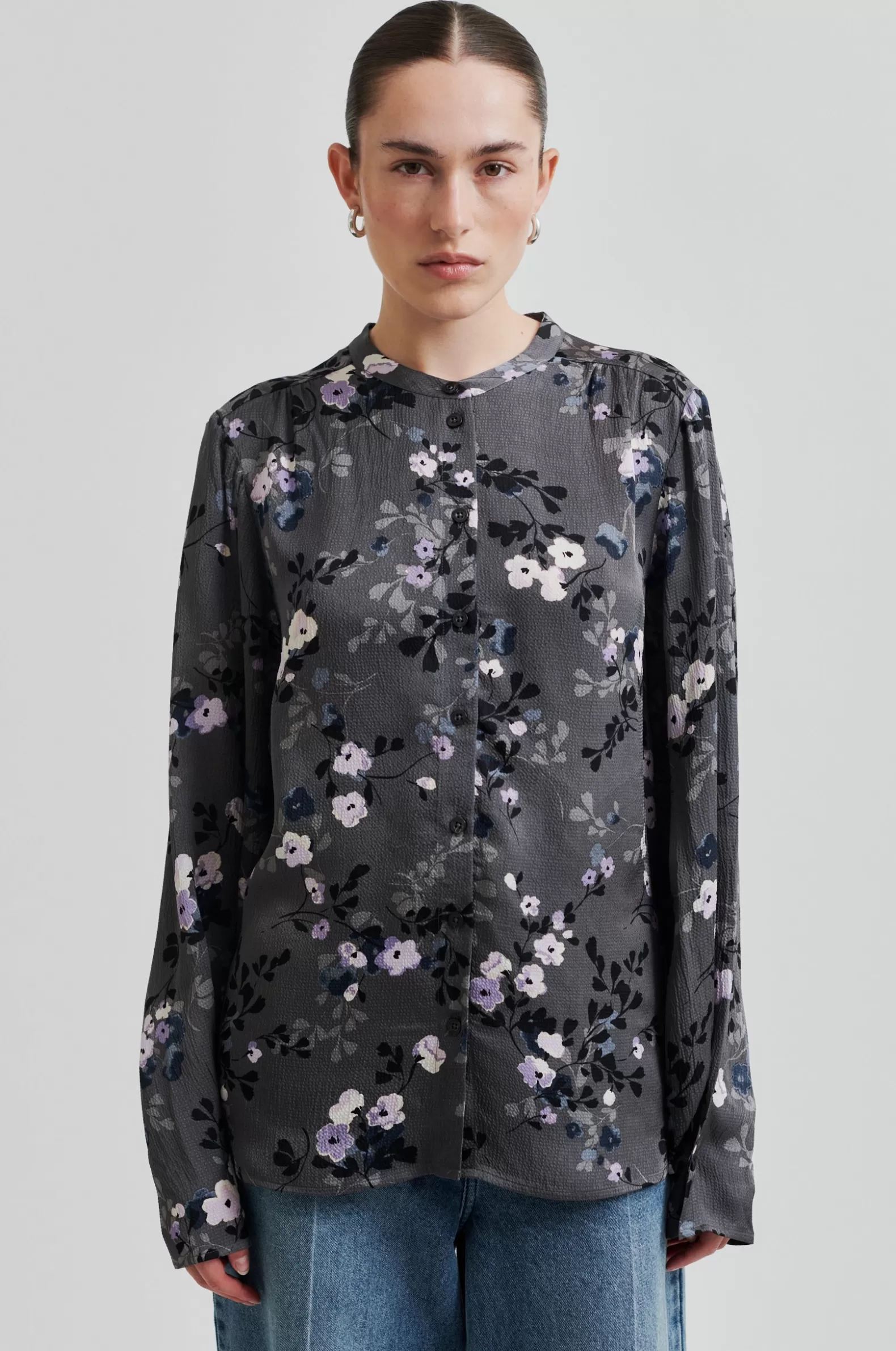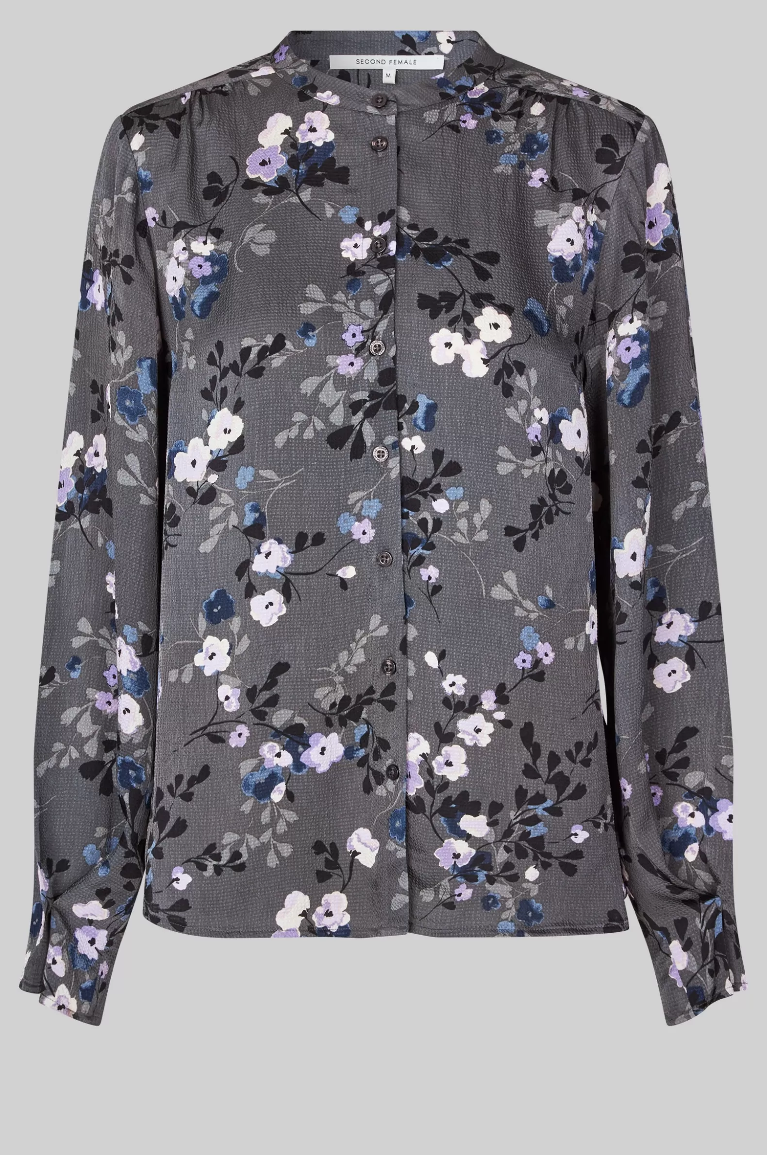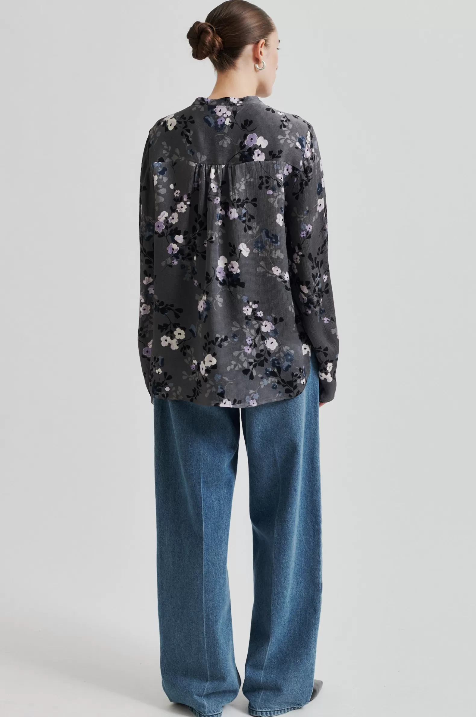 Second Female floral-print shirt. Made in soft hammered viscose with all-over floral print. Featuring a round neckline and button-through fastening at the front. Long sleeves with crossover button detail at cuffs. Small gathers at back yoke. Shaped bottom hem. Loose and fluid fit.