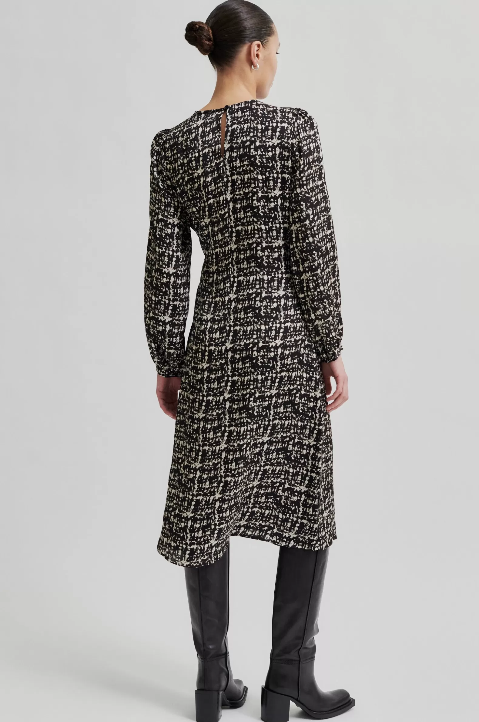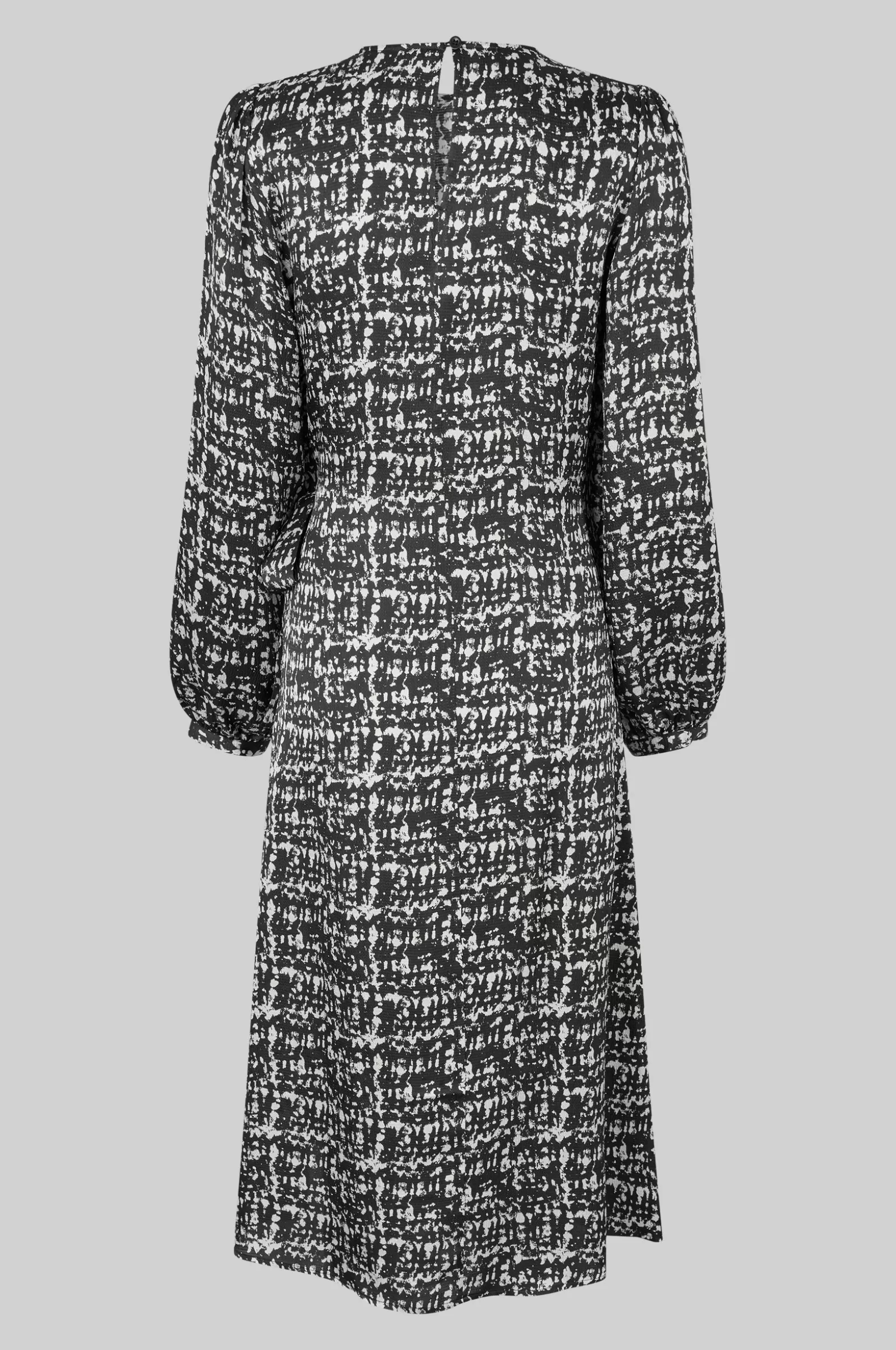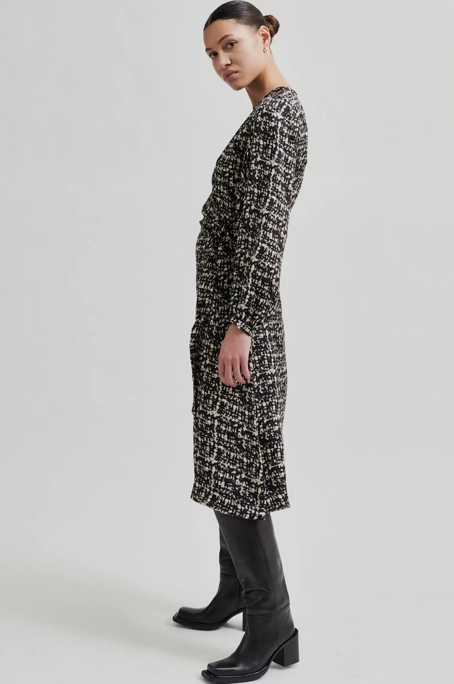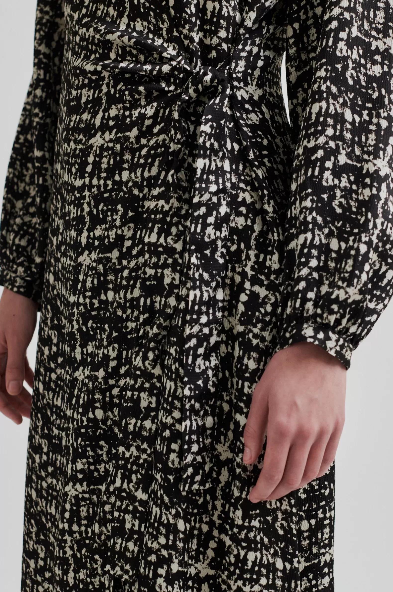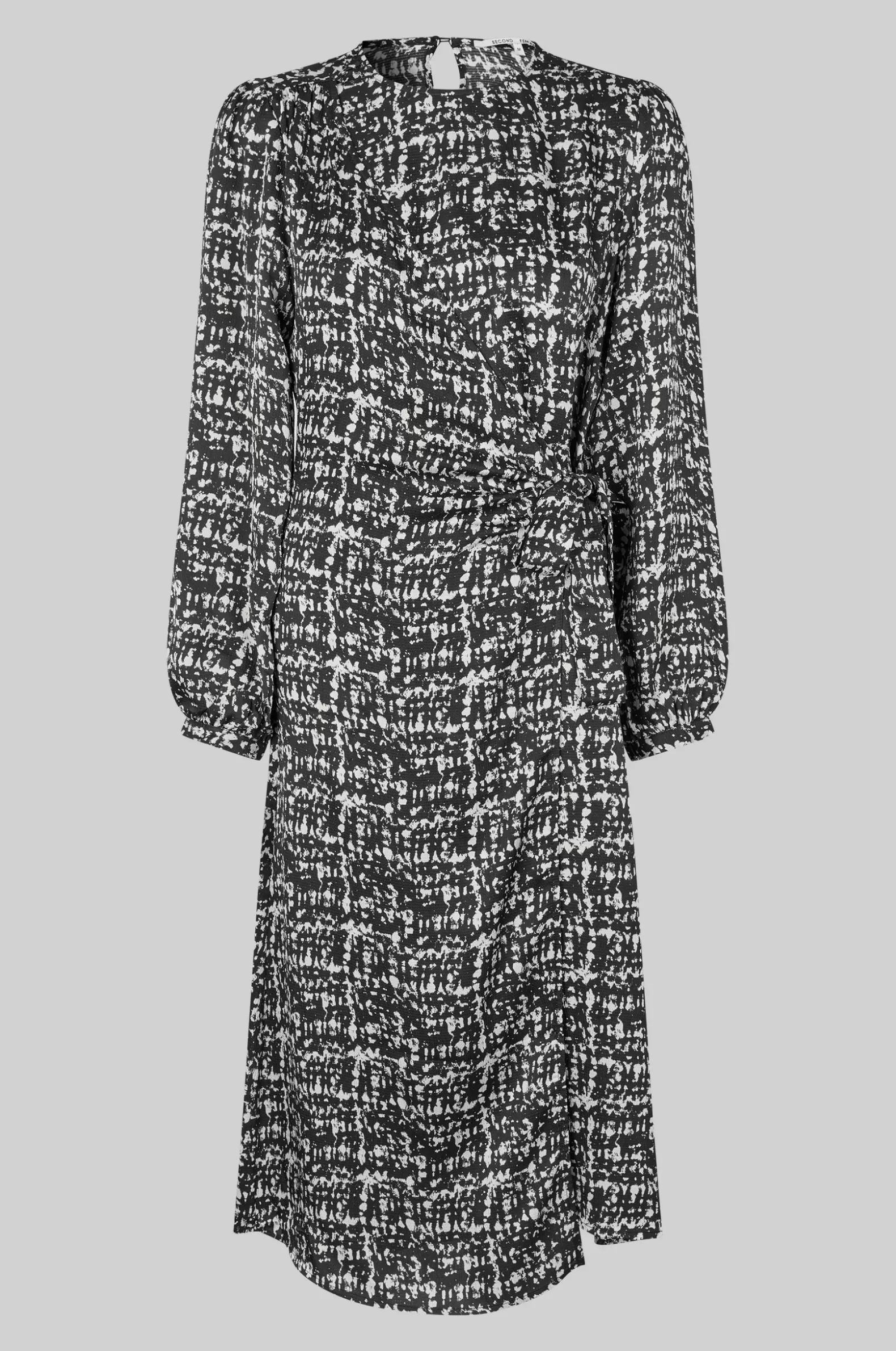 Second Female patterned crossover dress. Made in drapy hammered viscose blend with monochrome print. Featuring a round neckline and diagonal crossover flap at the front that ties at one side. Keyhole opening at back with button and loop fastening. Long sleeves with band cuffs. Slim fit.