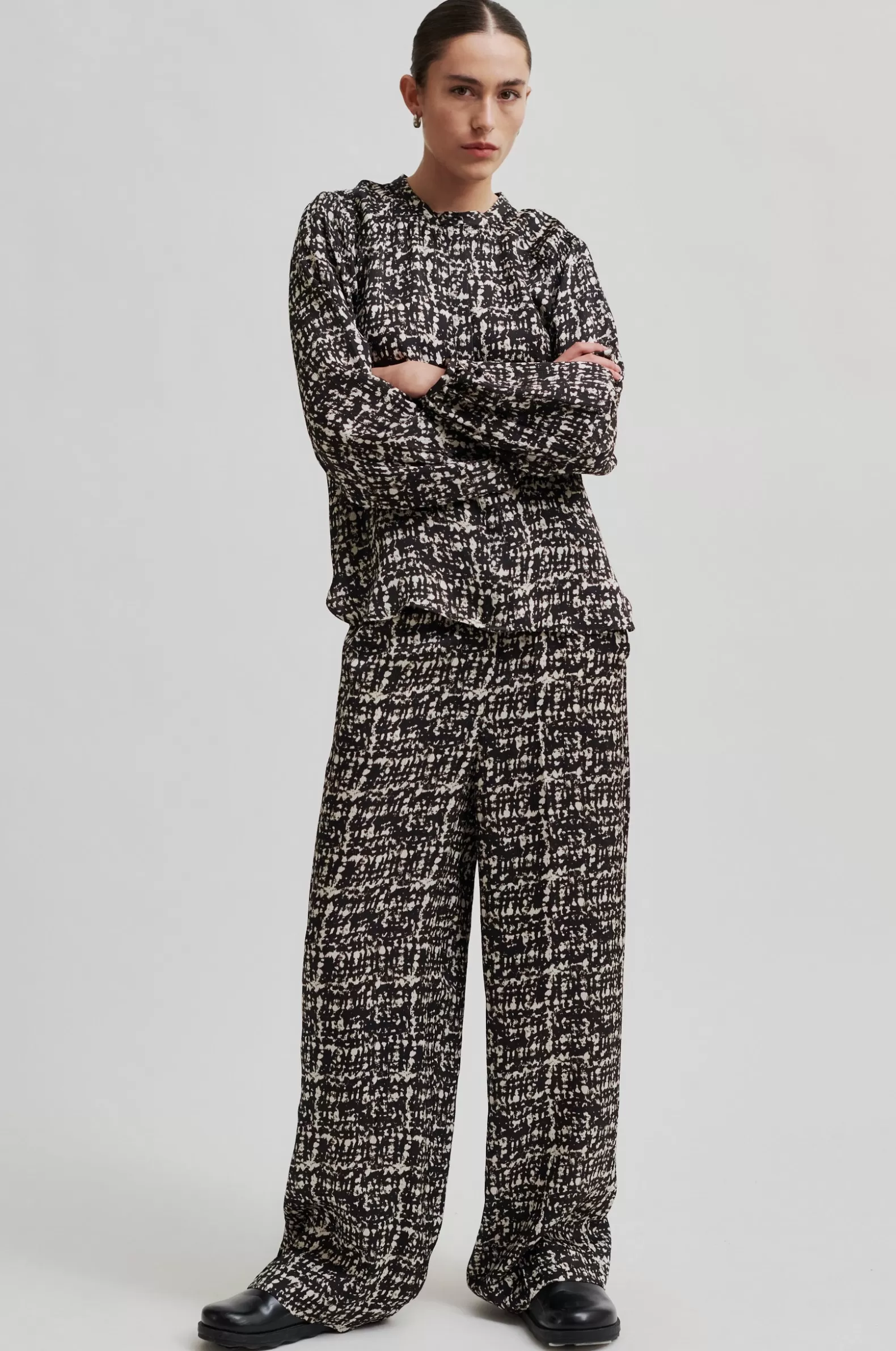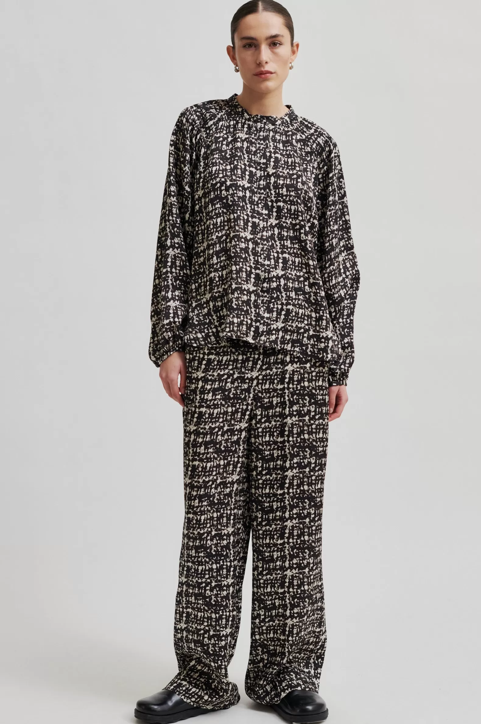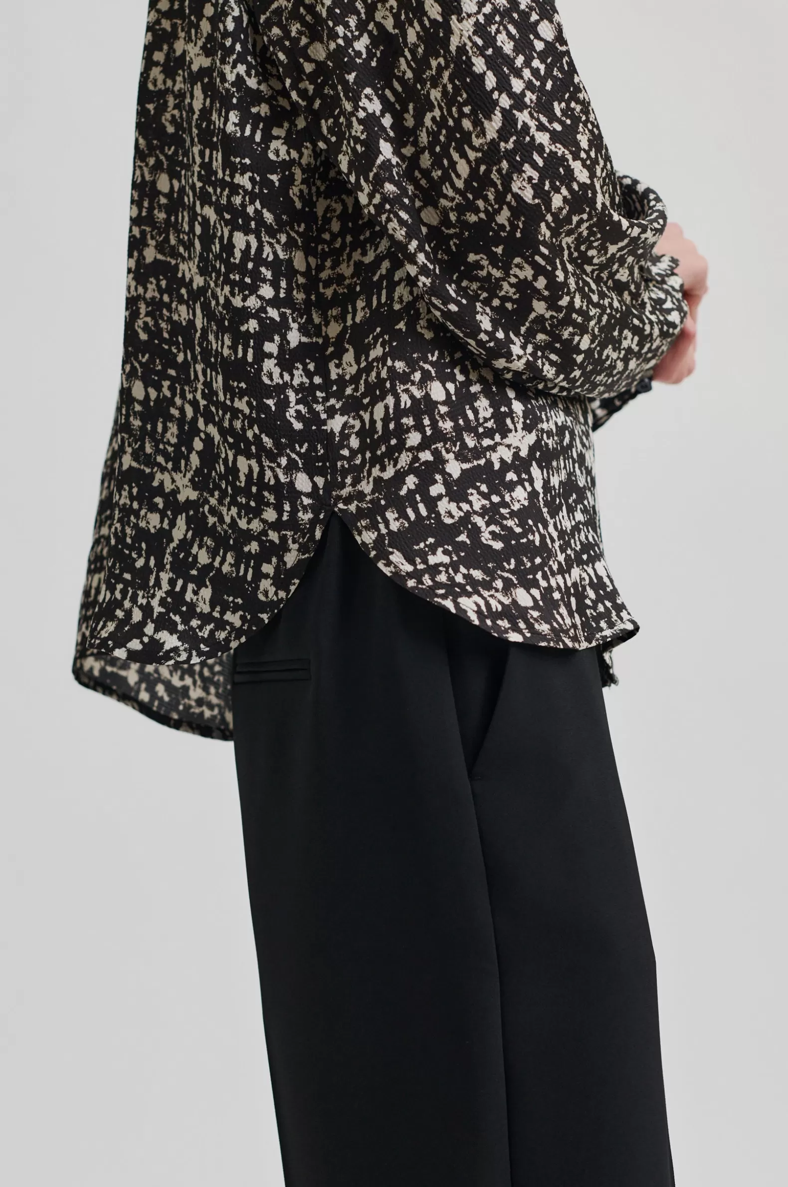 Second Female patterned shirt. Made in drapy hammered viscose blend with monochrome print. Featuring a round neckline an…