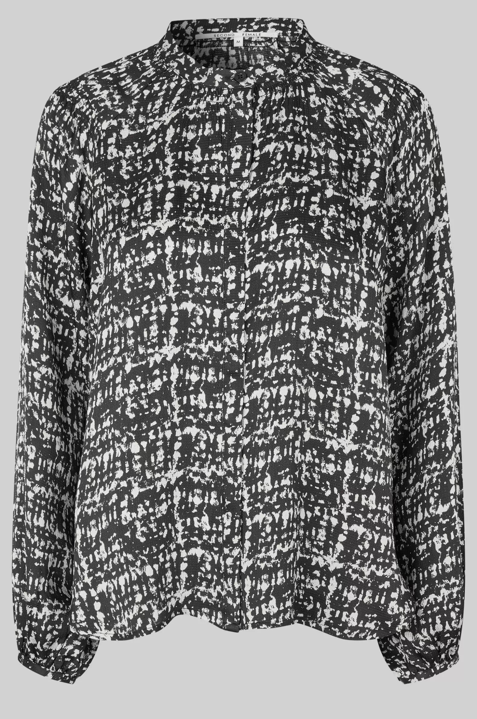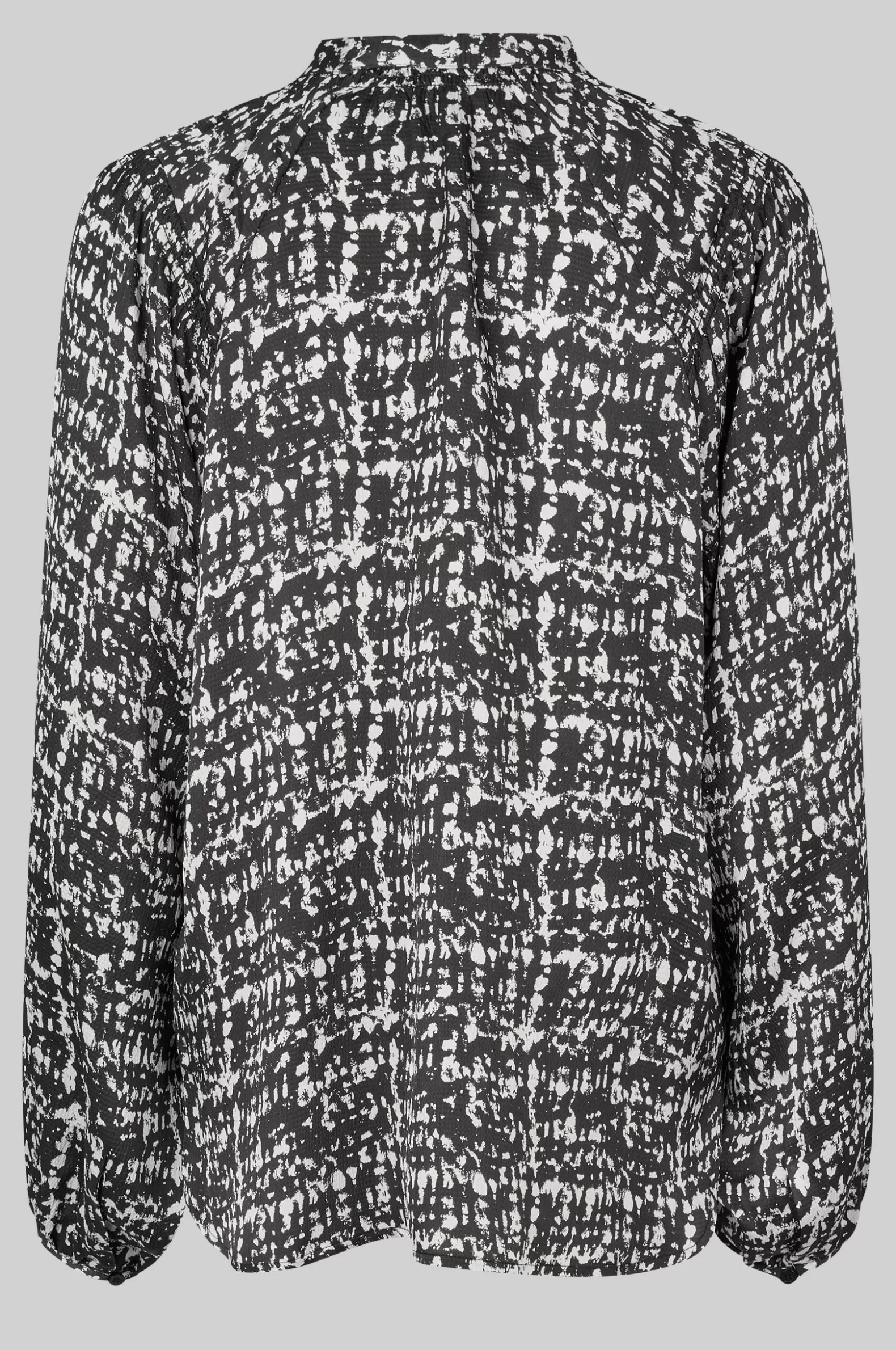 Second Female patterned shirt. Made in drapy hammered viscose blend with monochrome print. Featuring a round neckline and placket with concealed button-through fastening and visible top button. Stitching details at neck and shoulders. Raglan sleeves with band cuffs with button fastening. Relaxed and fluid silhouette.