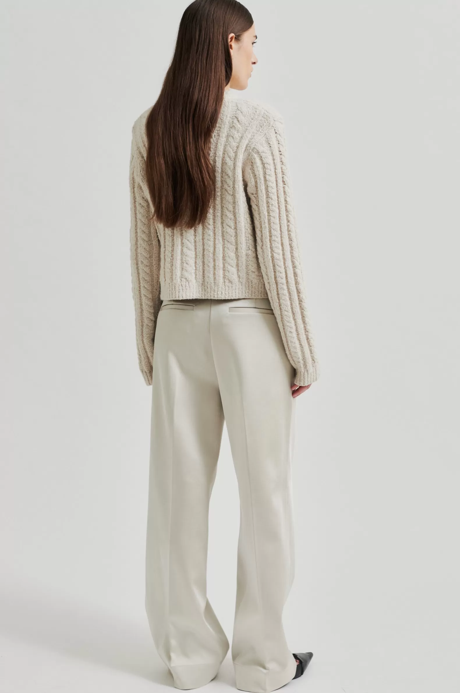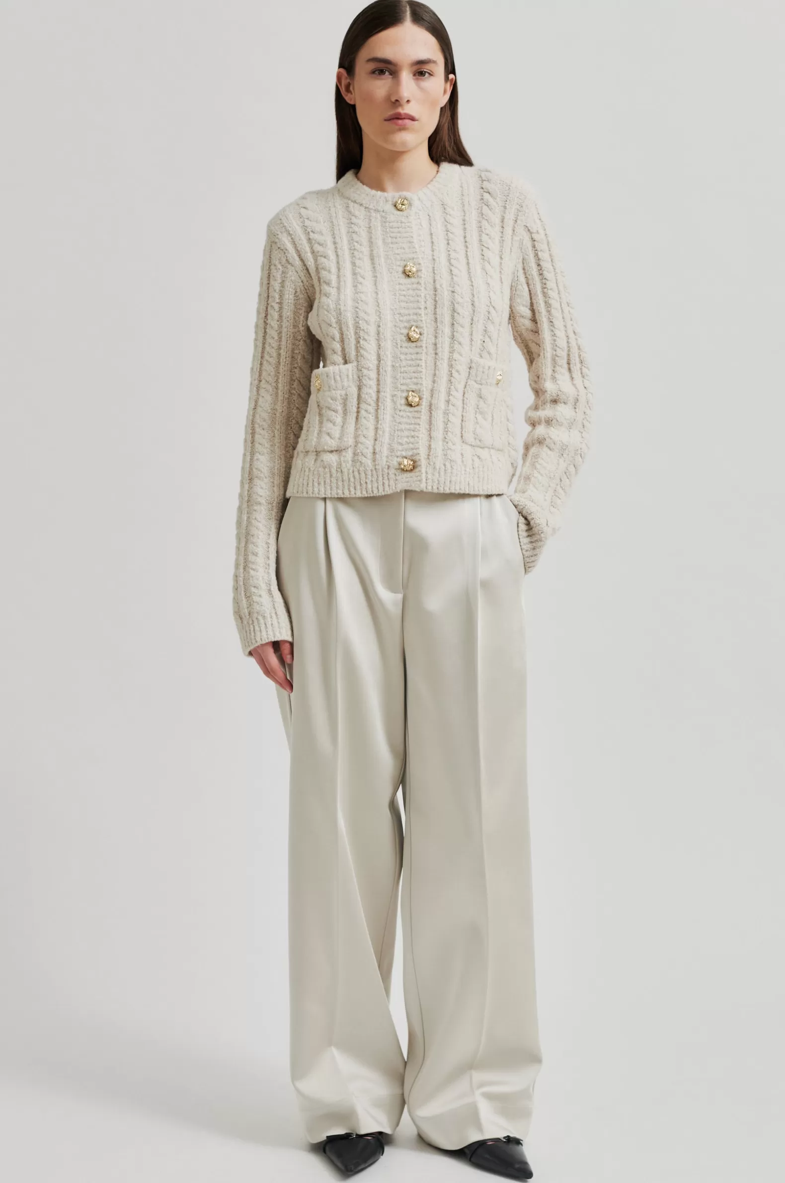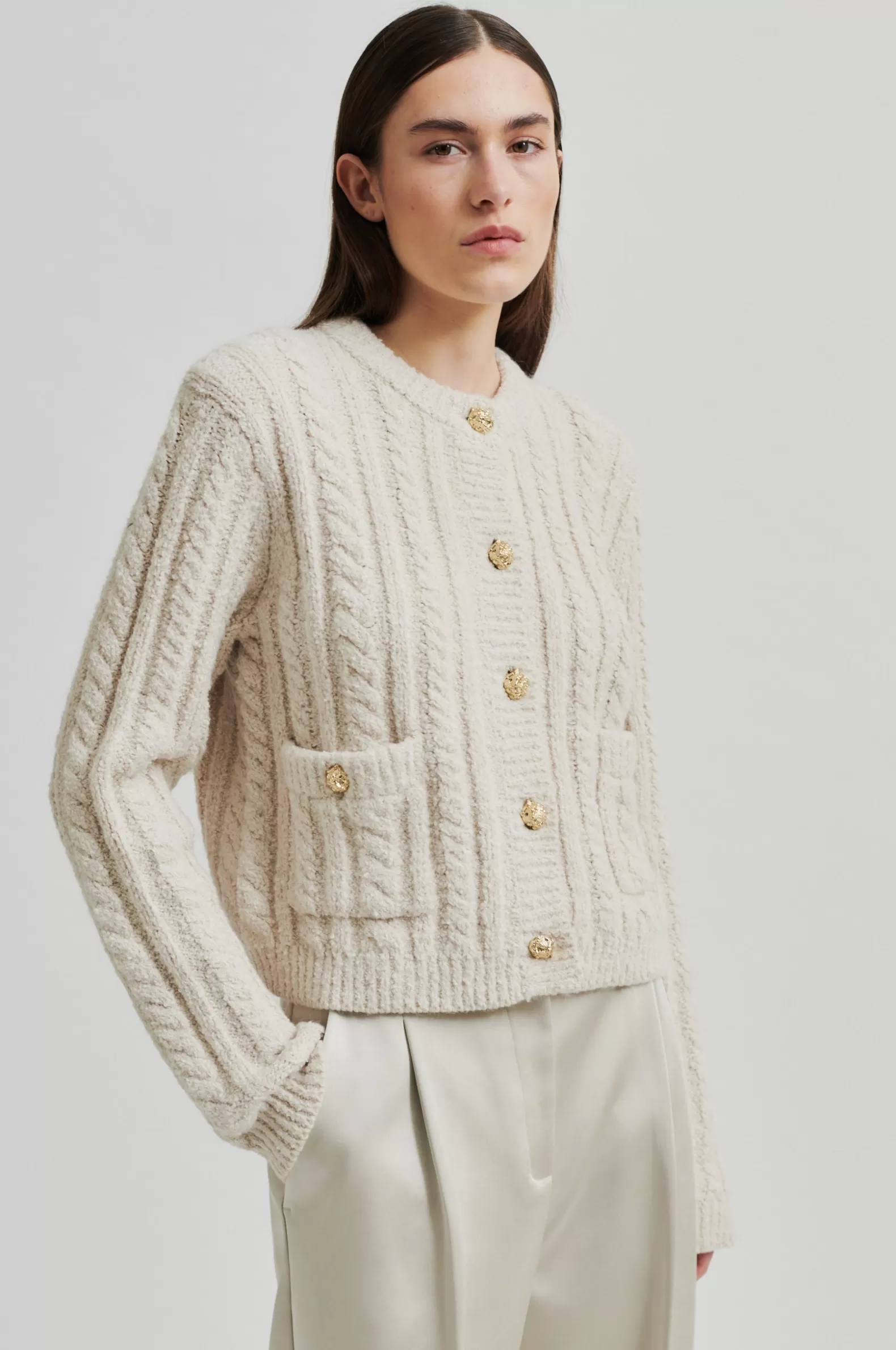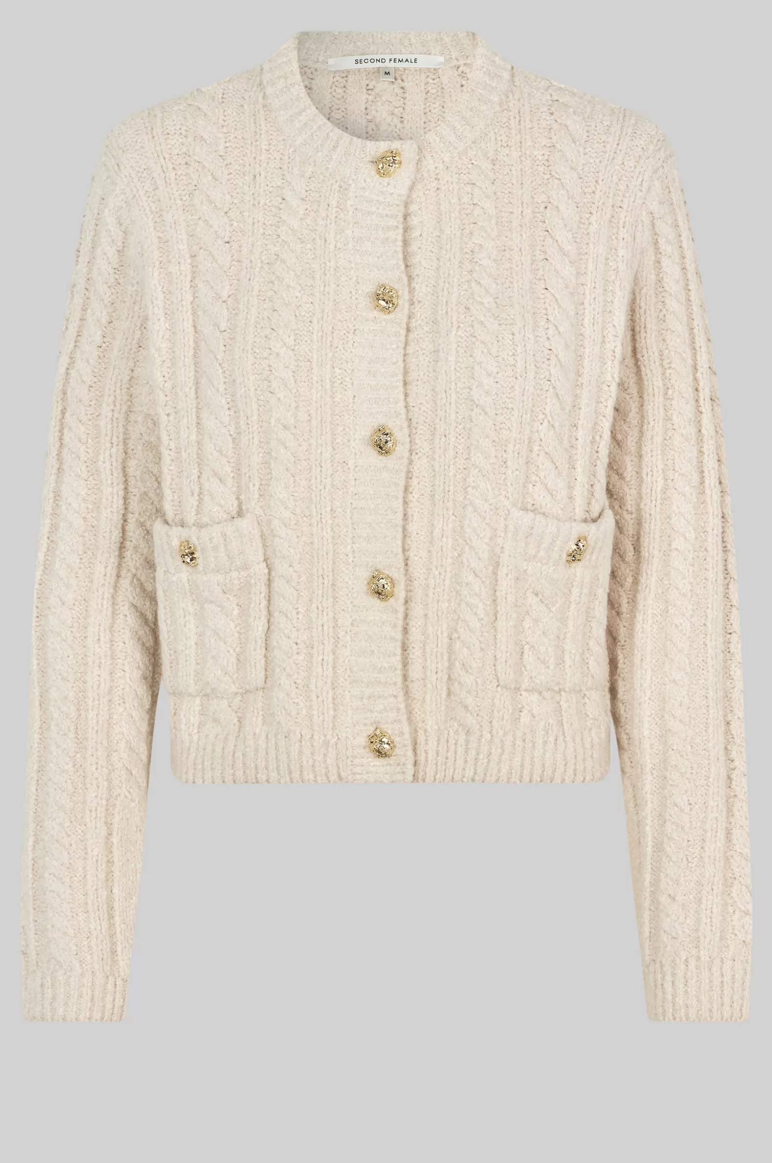 Second Female cardigan with button details. The cardigan is made in a soft and stretchy cotton blend with cable knit structure. Featuring a round neck and button-through fastening with decorative buttons. Two flap pockets with decorative buttons. Padded shoulders with long sleeves. Ribbed neck, placket, cuffs and bottom hem. Boxy, straight fit.