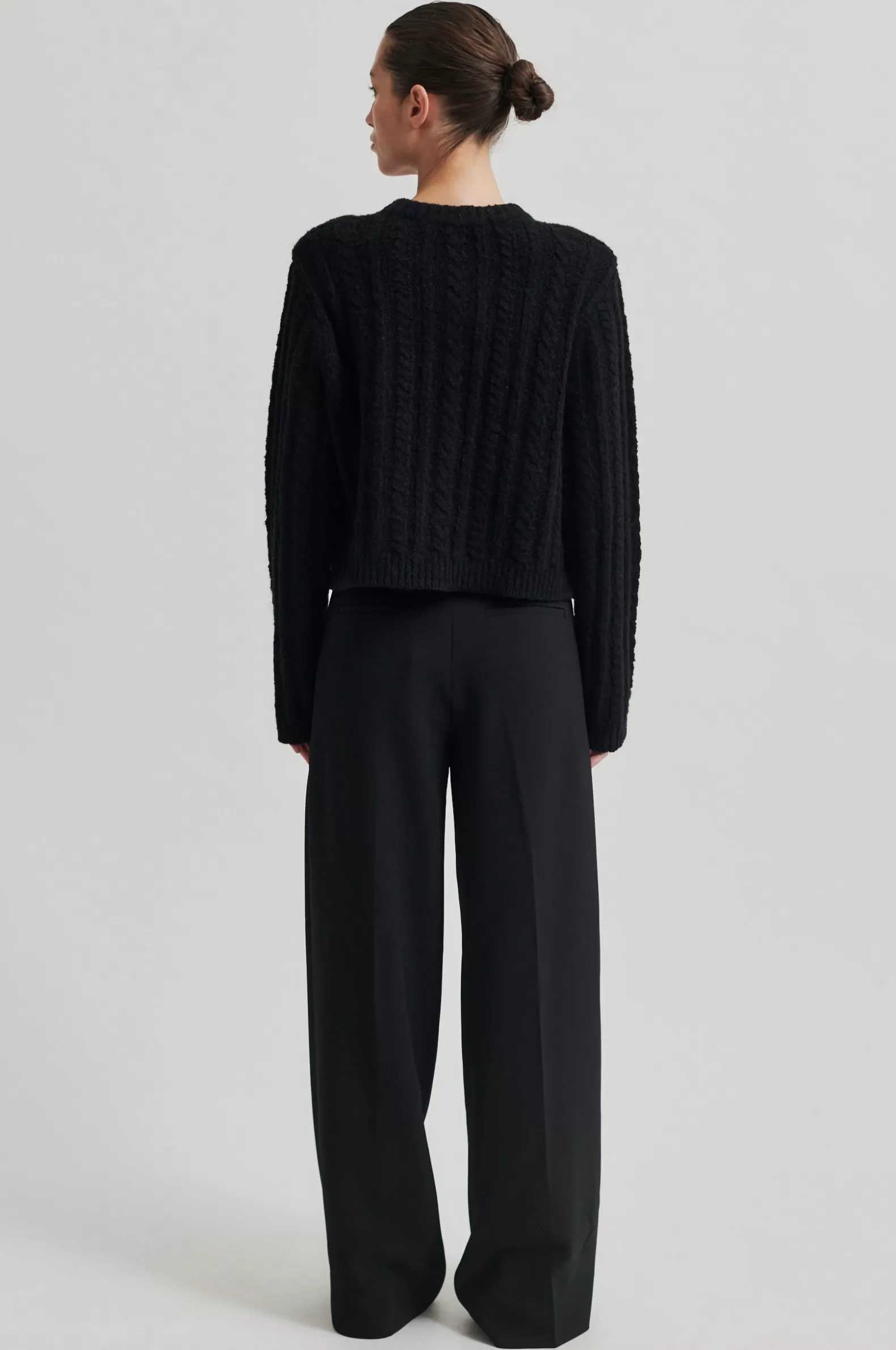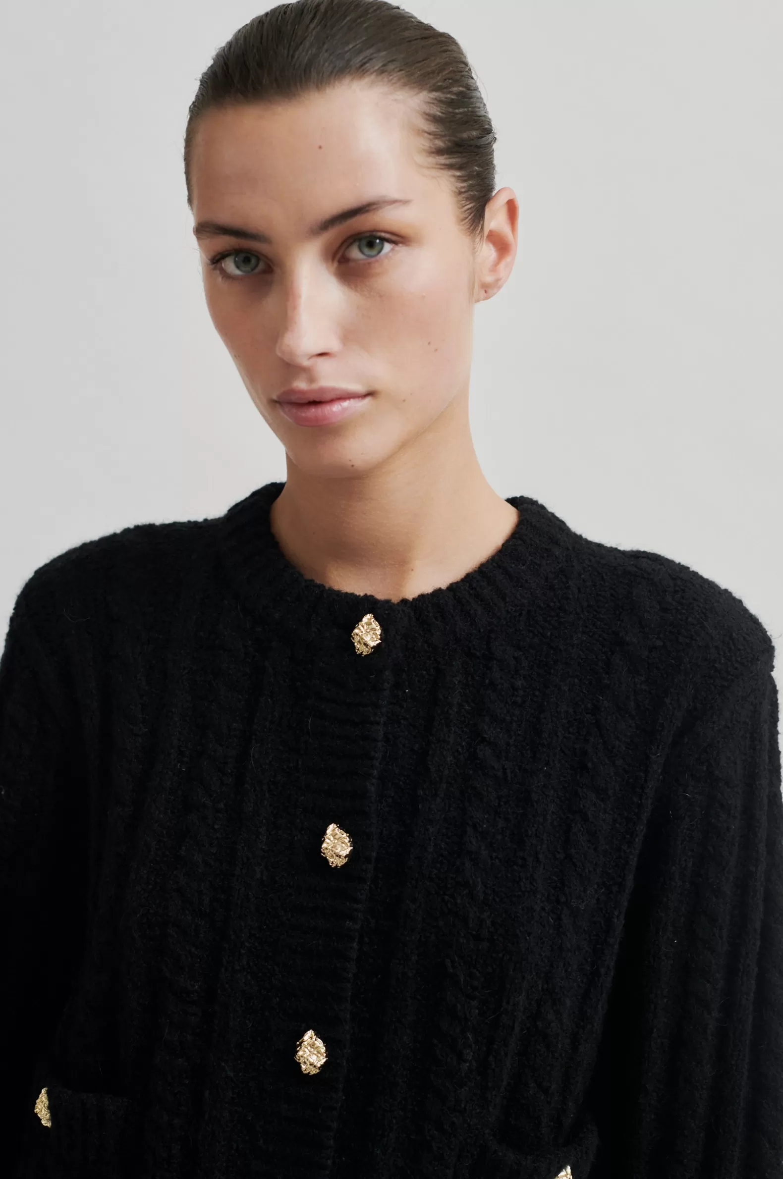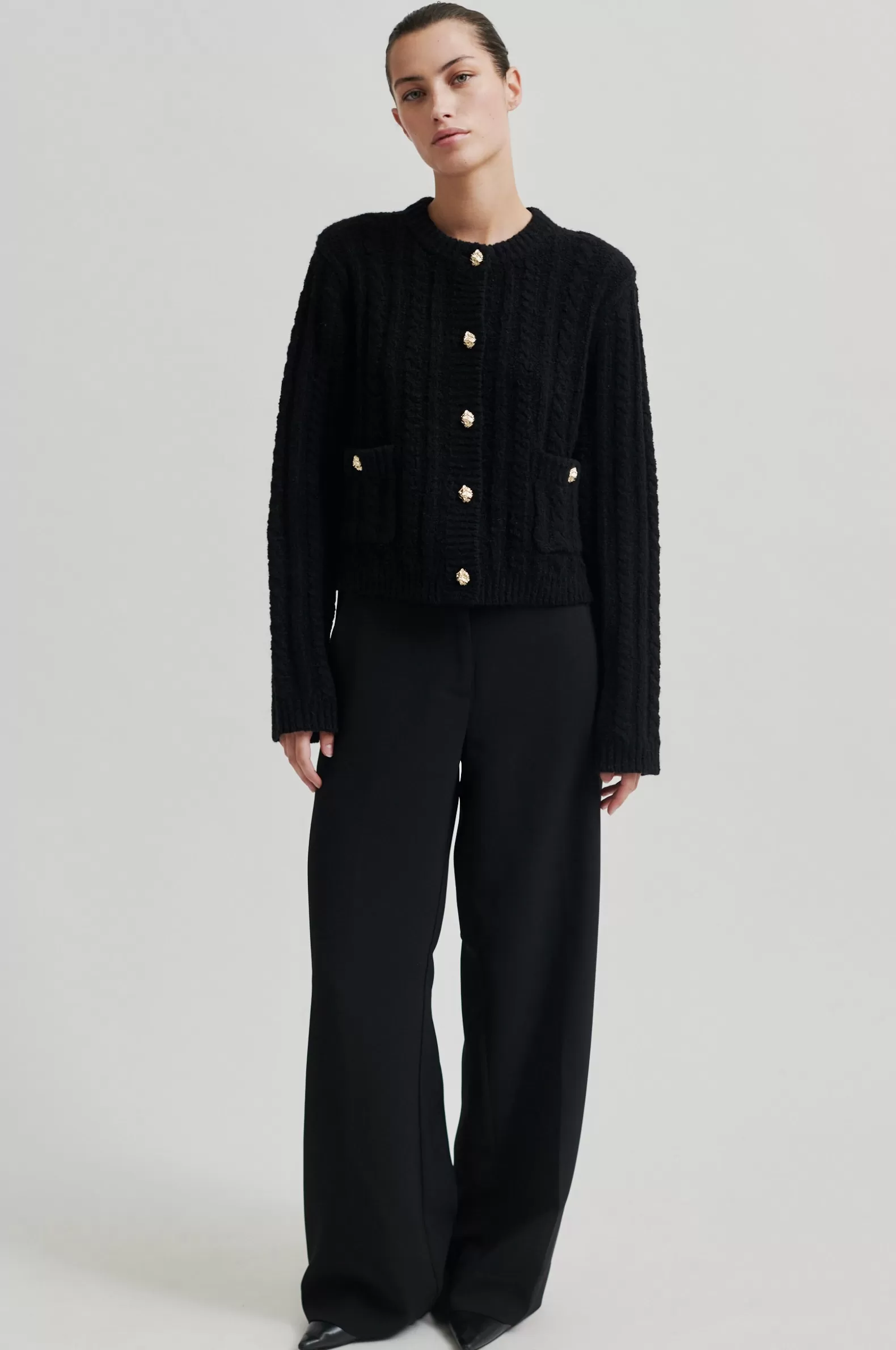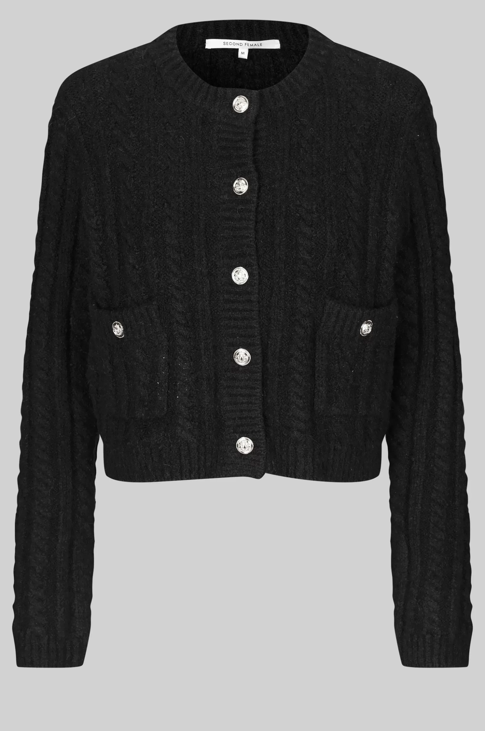 Second Female cardigan with button details. The cardigan is made in a soft and stretchy cotton blend with cable knit structure. Featuring a round neck and button-through fastening with decorative buttons. Two flap pockets with decorative buttons. Padded shoulders with long sleeves. Ribbed neck, placket, cuffs and bottom hem. Boxy, straight fit.