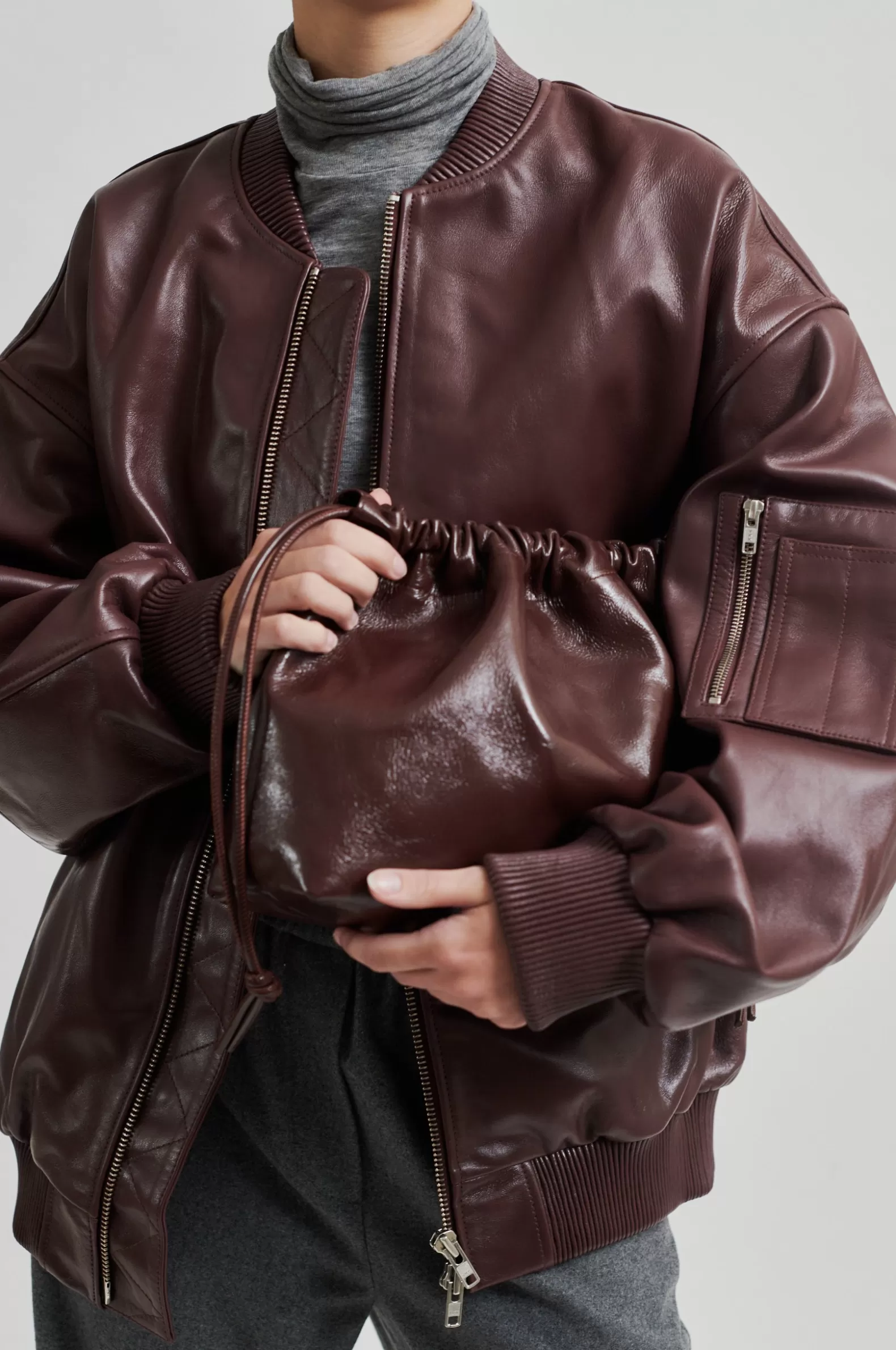 Second Female drawstring bag. The bag is made in smooth, lustrous leather. Featuring a drawstring opening at the top with ties at each end. Detachable shoulder strap and inside zip pocket. Fully lined.