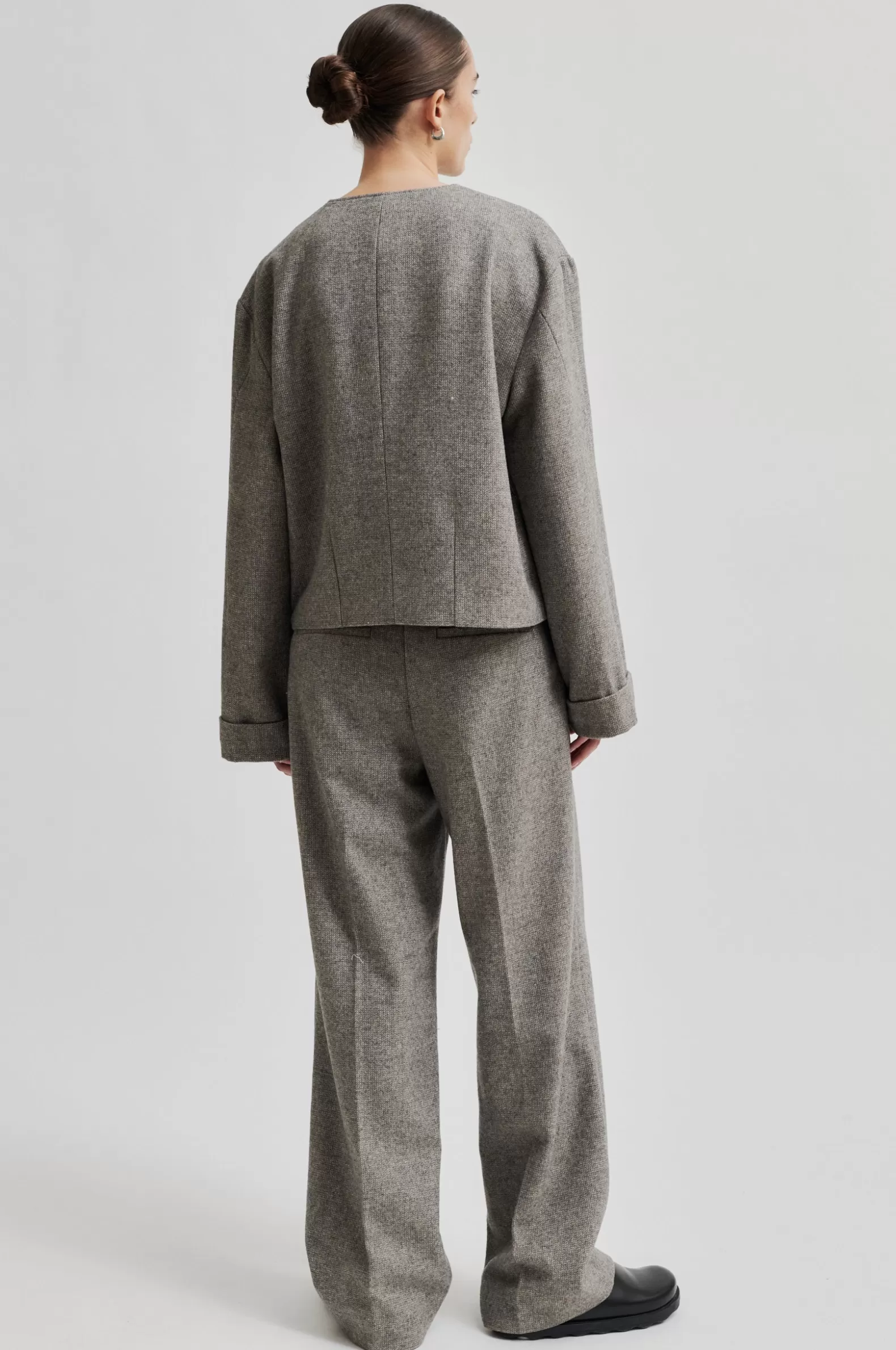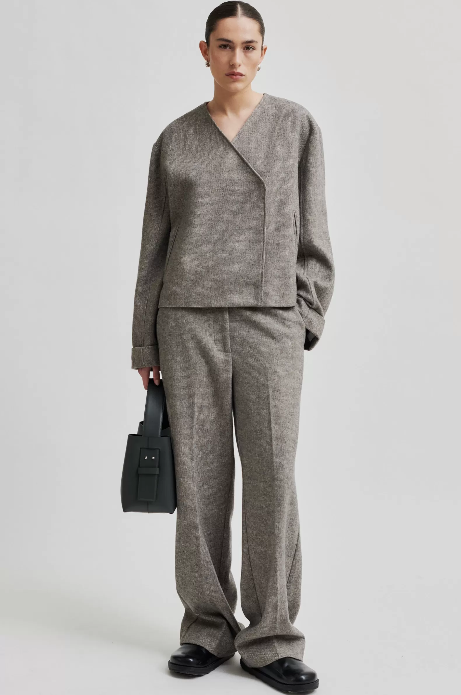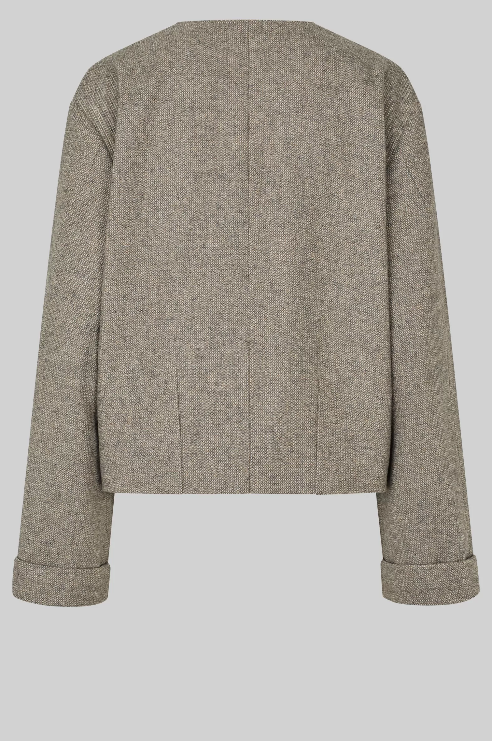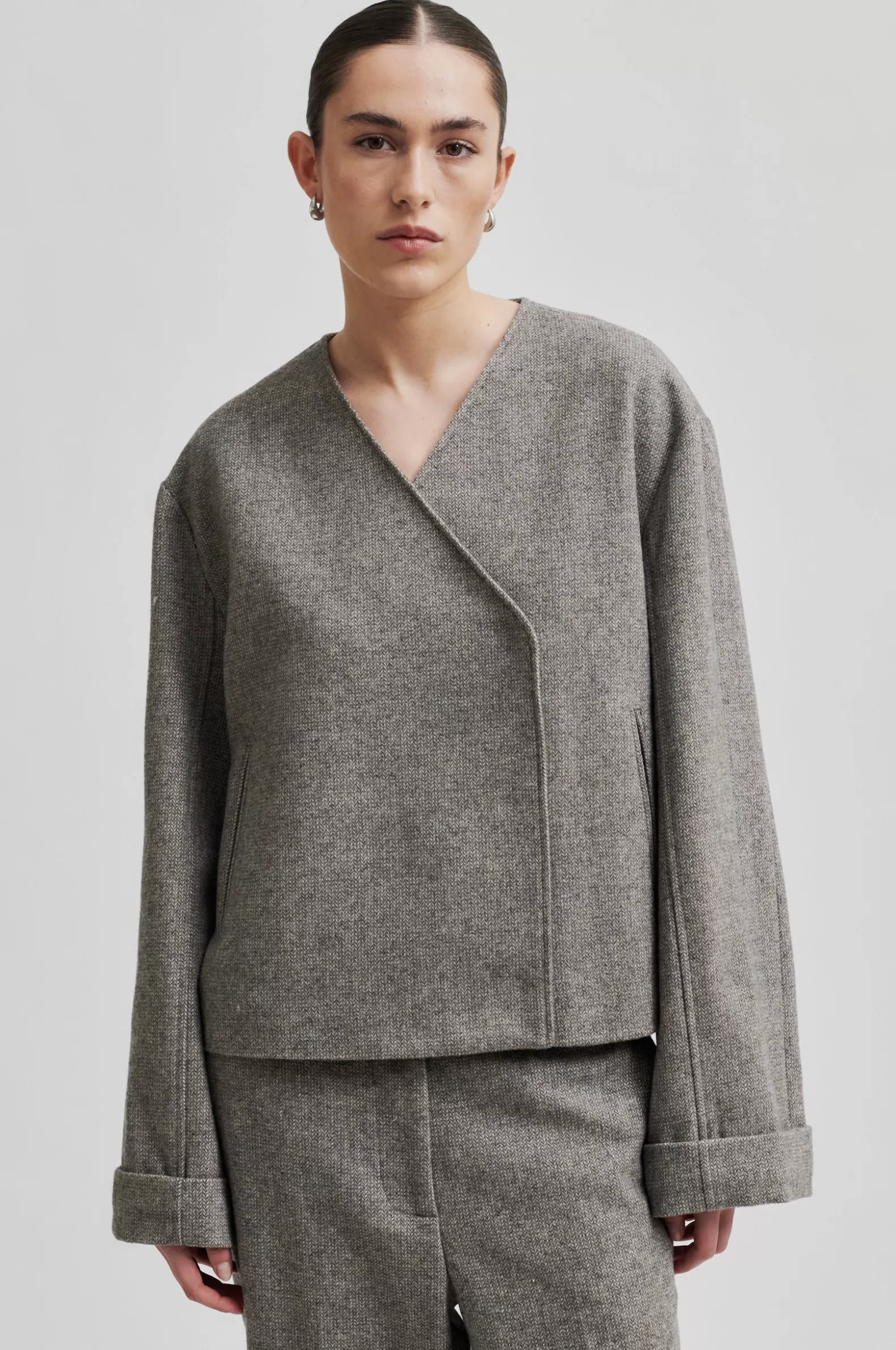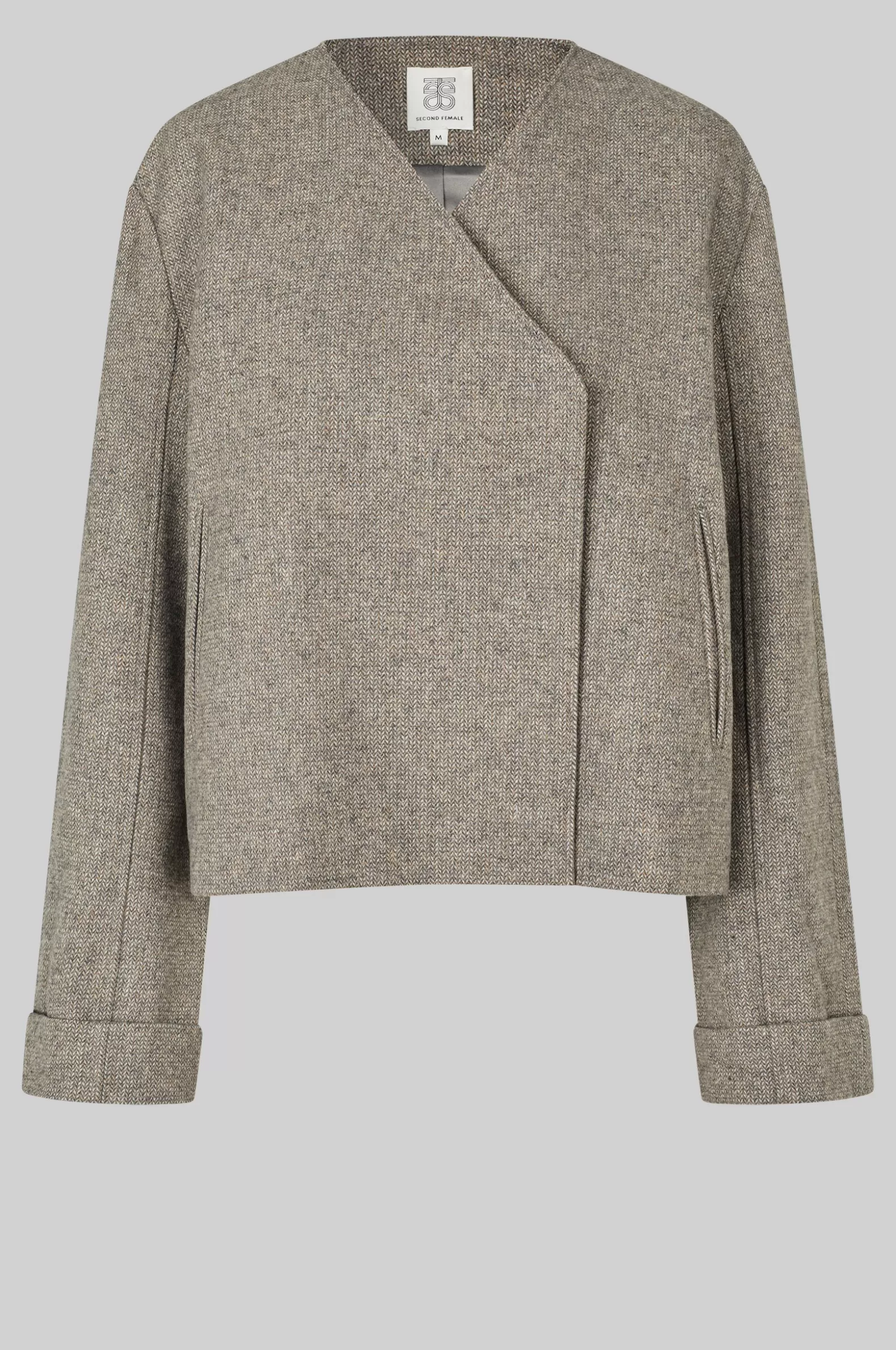Second Female crossover blazer. Made in a light wool blend with miniature herringbone pattern. Featuring crossover neckline that fastens on one side with concealed press studs. Two side pockets. Dropped shoulders with long sleeves with double hems at cuffs. Fully lined. Regular, straight fit.