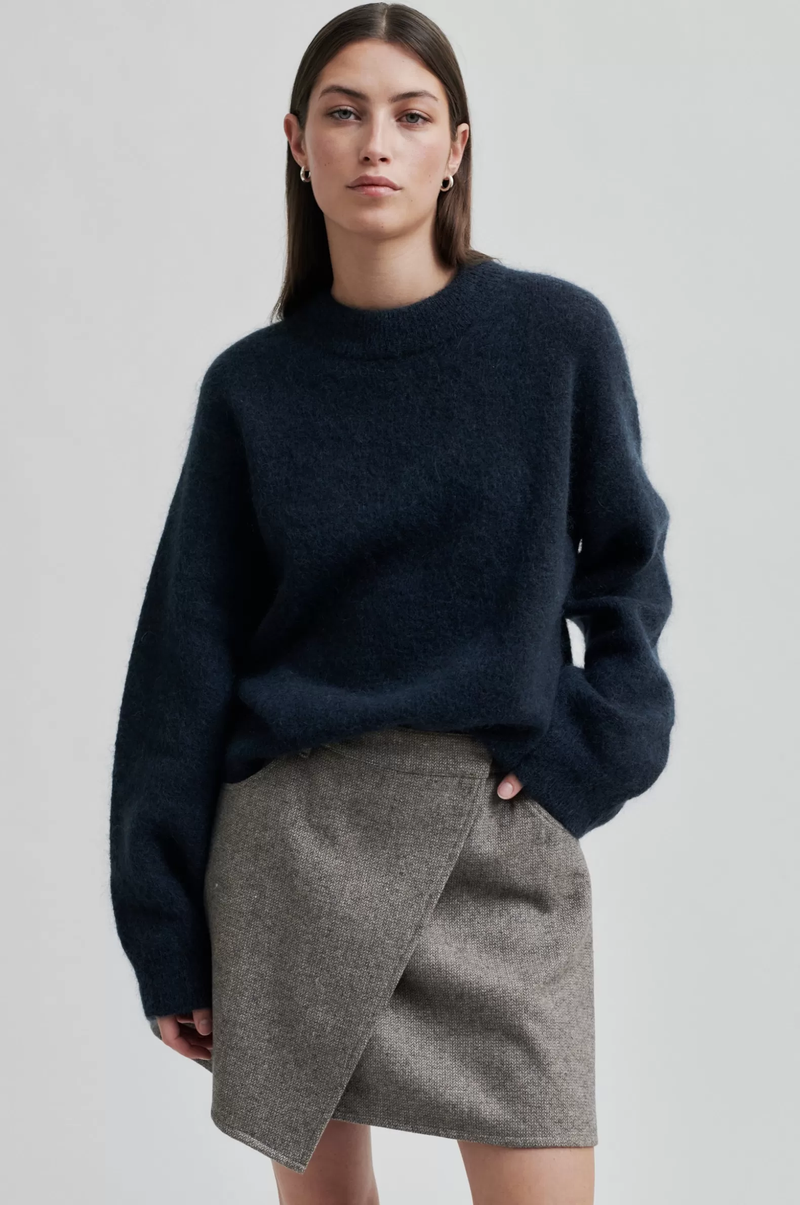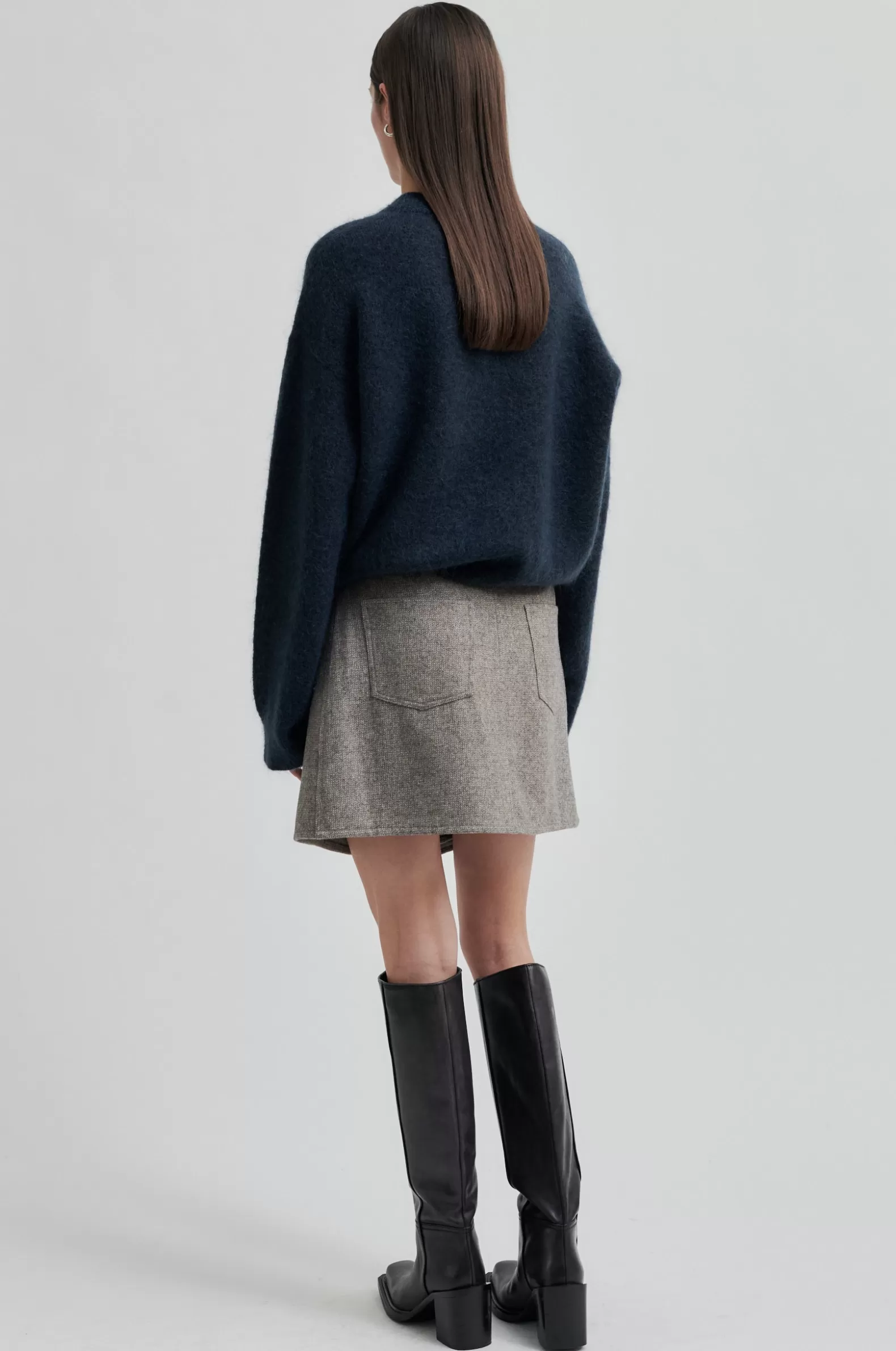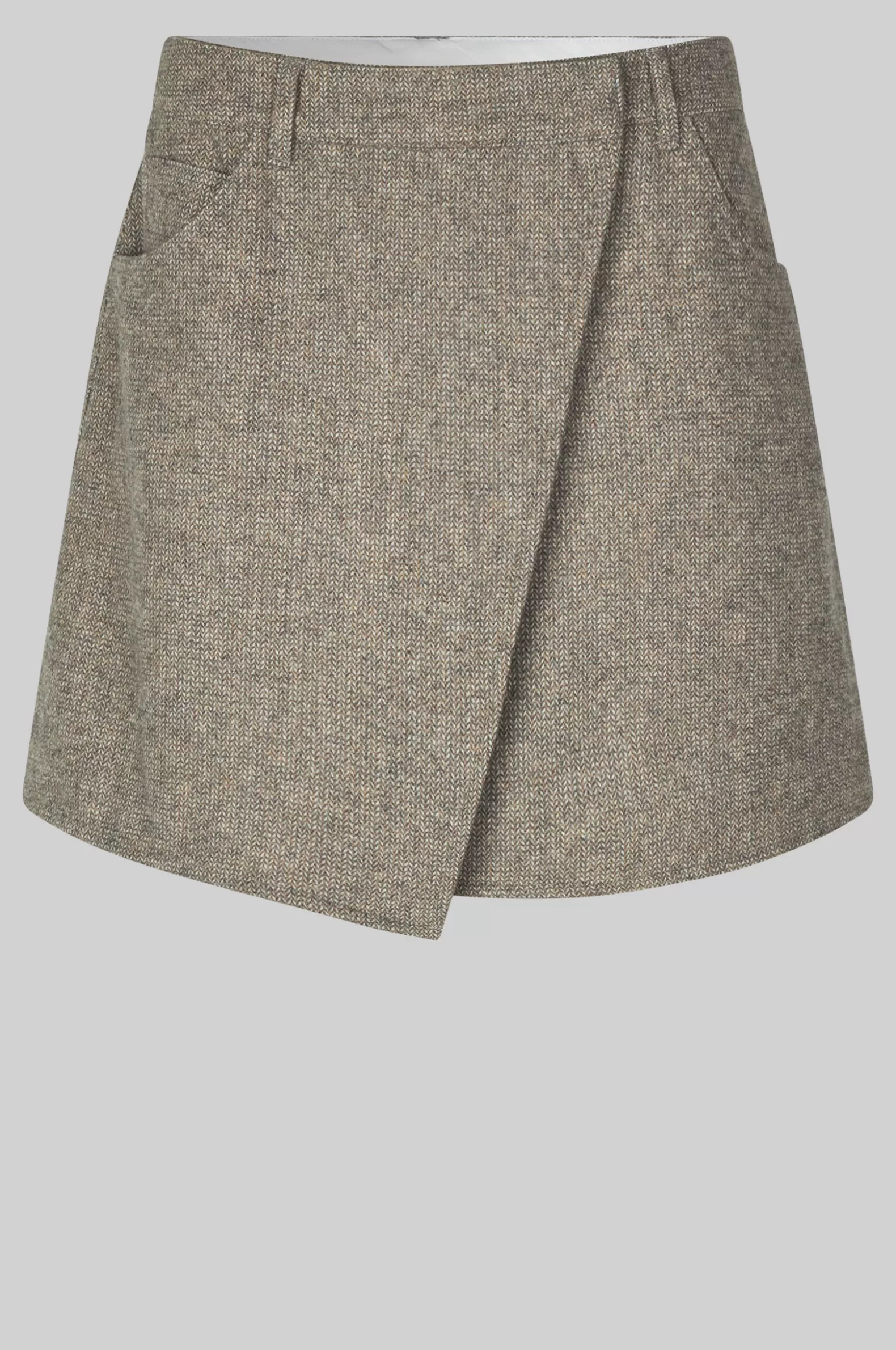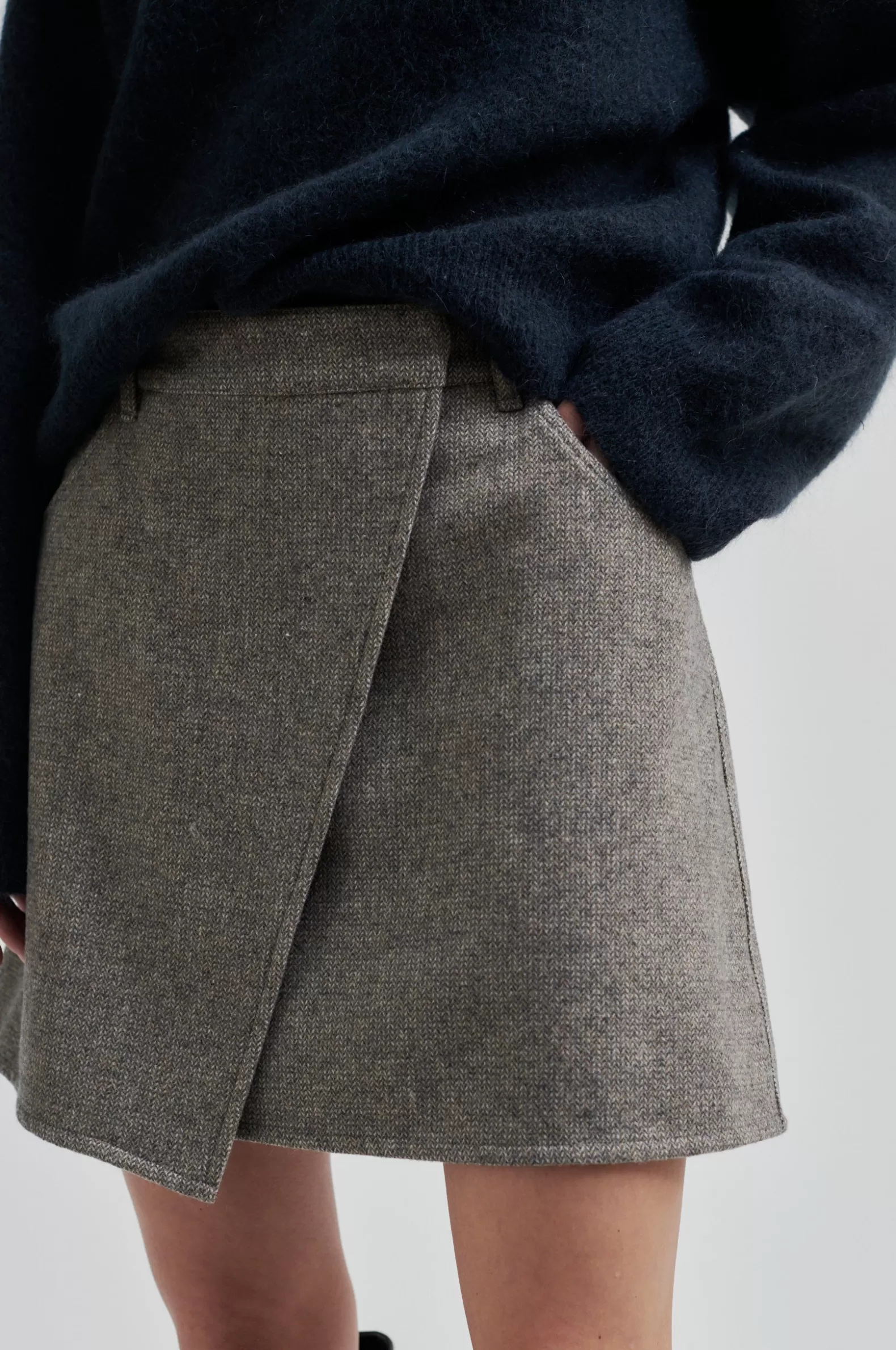 Second Female crossover skirt. Made in a light wool blend with miniature herringbone pattern. Featuring crossover flap at front that fastens on one side with concealed hook. Small coin pocket, two front pockets and two patch pockets at the back. Fully lined. Slim, short fit.