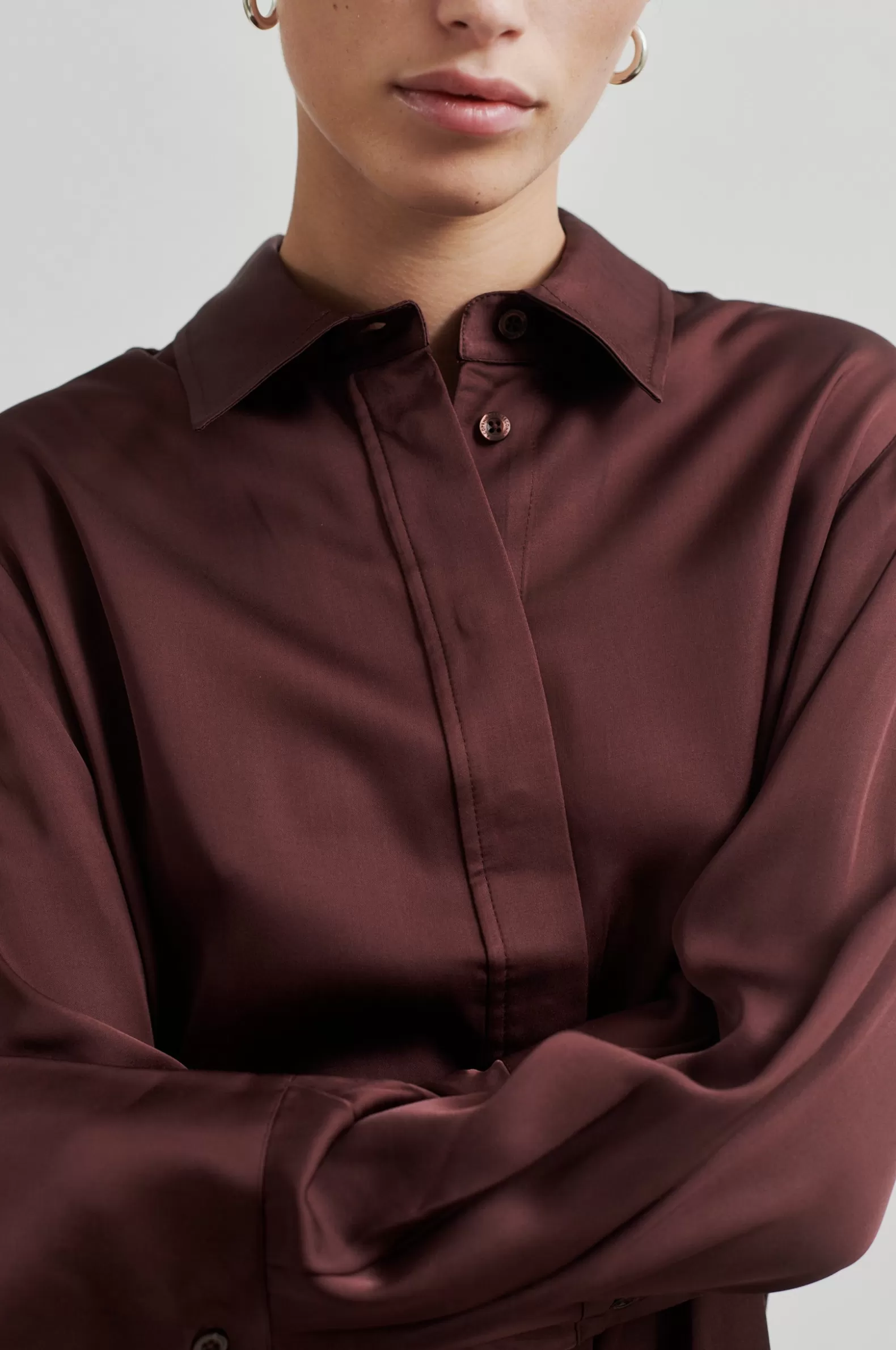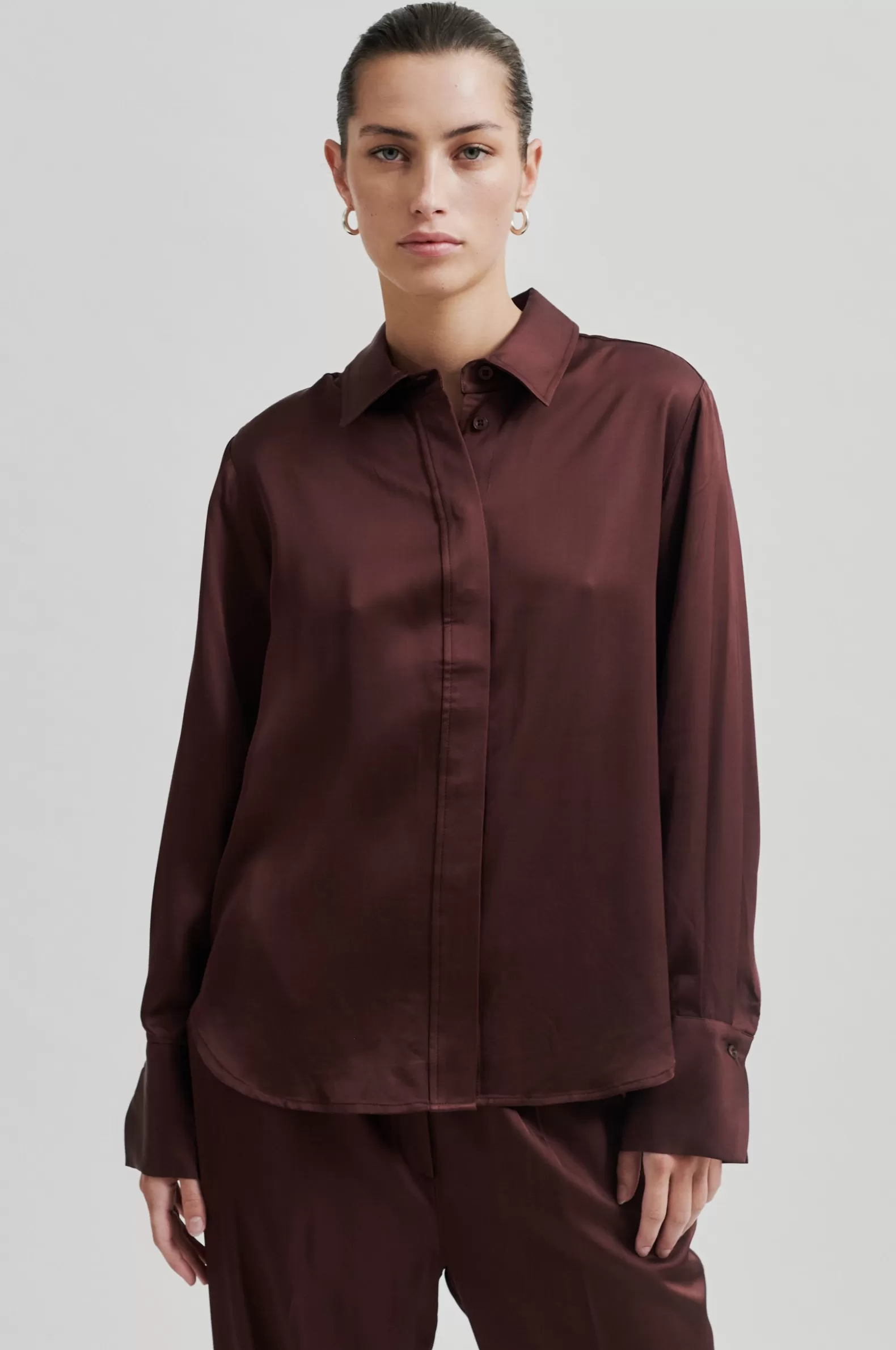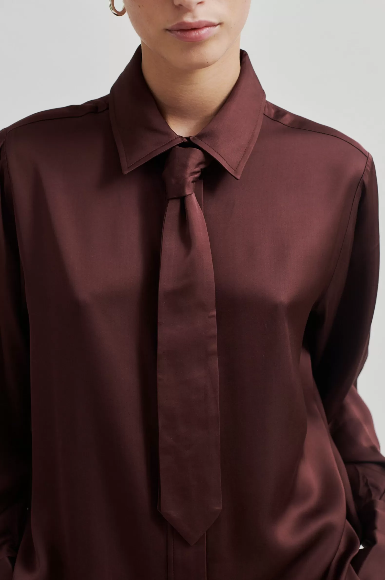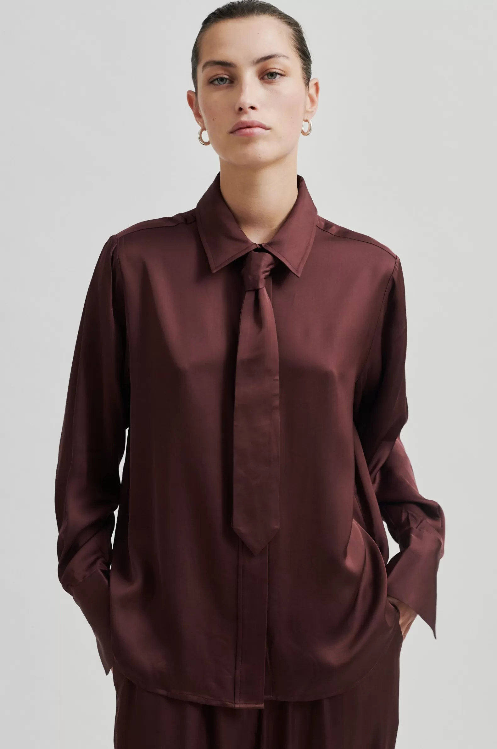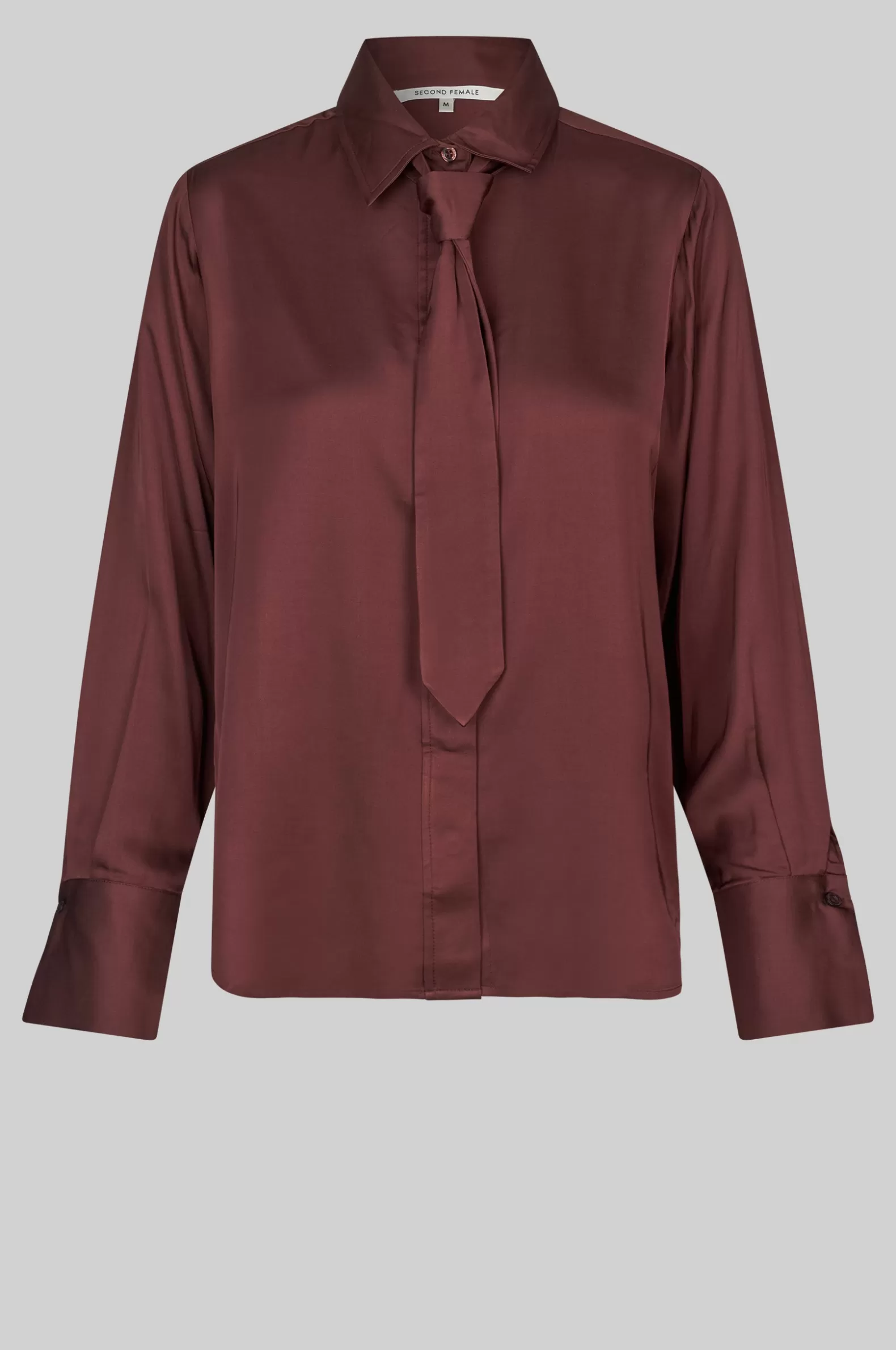 Second Female shirt with tie. The shirt is made in soft and drapy viscose with a lustrous quality. Featuring a regular collar and concealed button-through fastening with visible top button and a detachable tie. Long sleeves with buttoned cuffs. Regular fit.