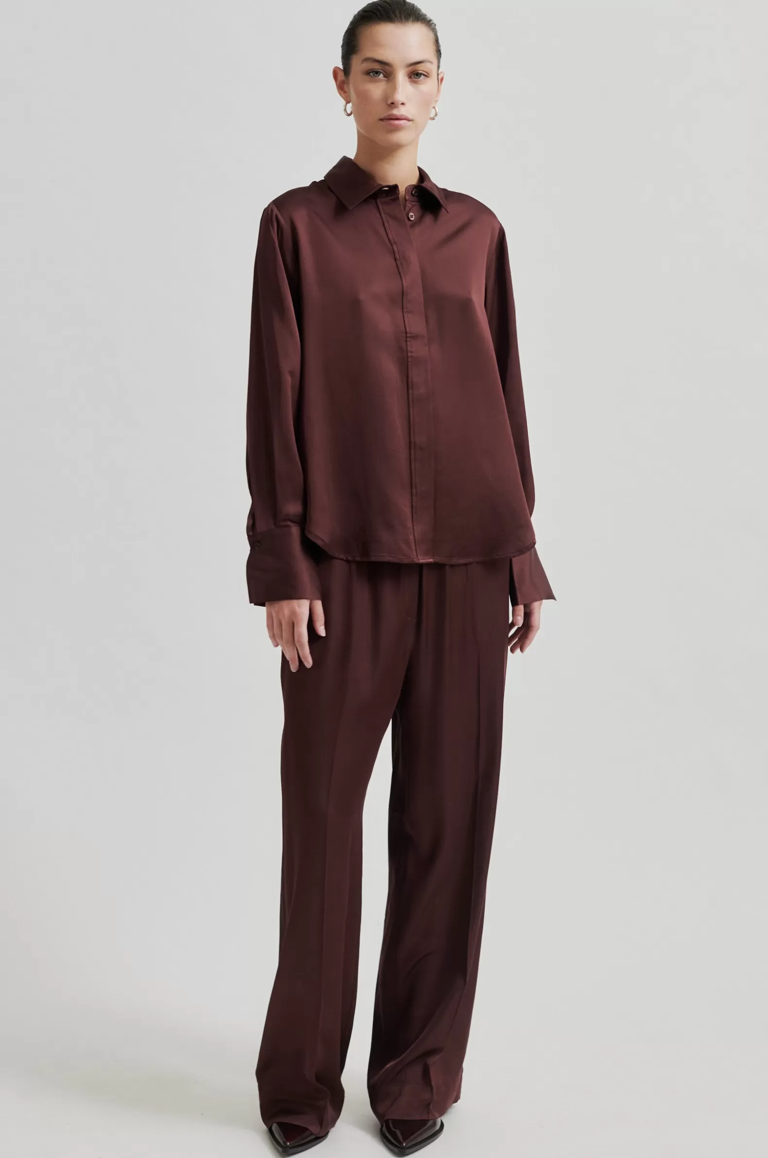 Second Female shirt with tie. The shirt is made in soft and drapy viscose with a lustrous quality. Featuring a regular c…