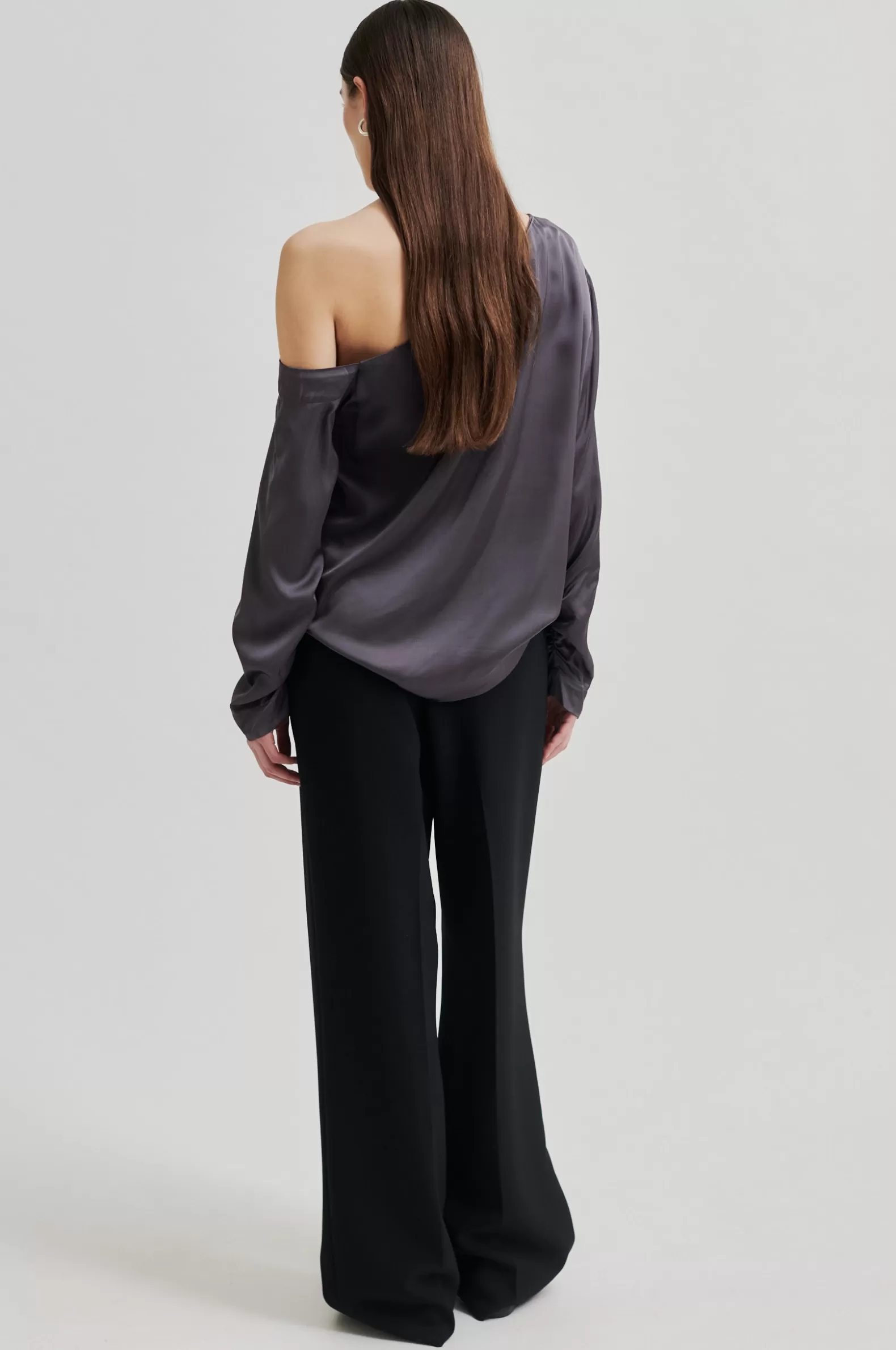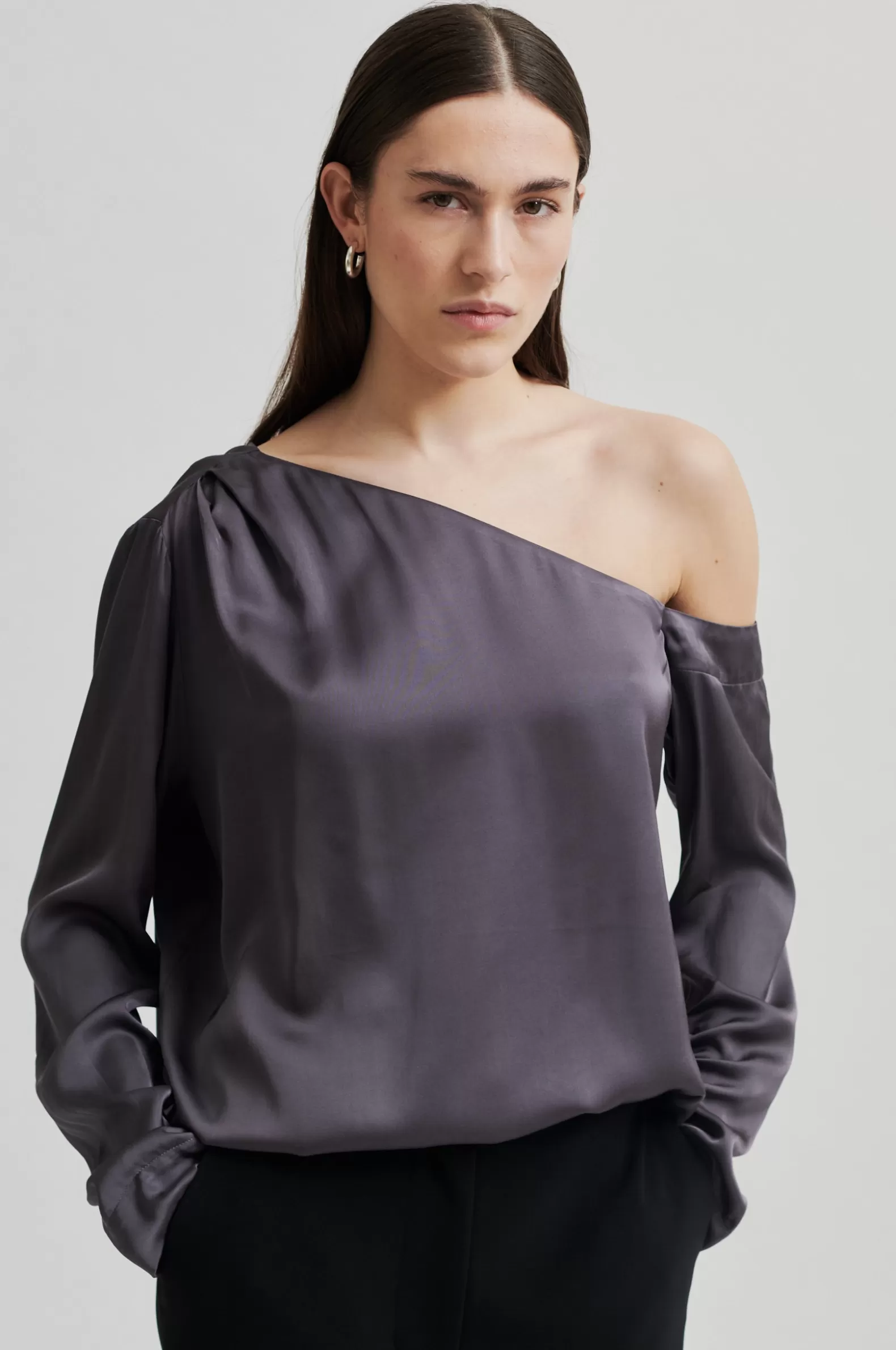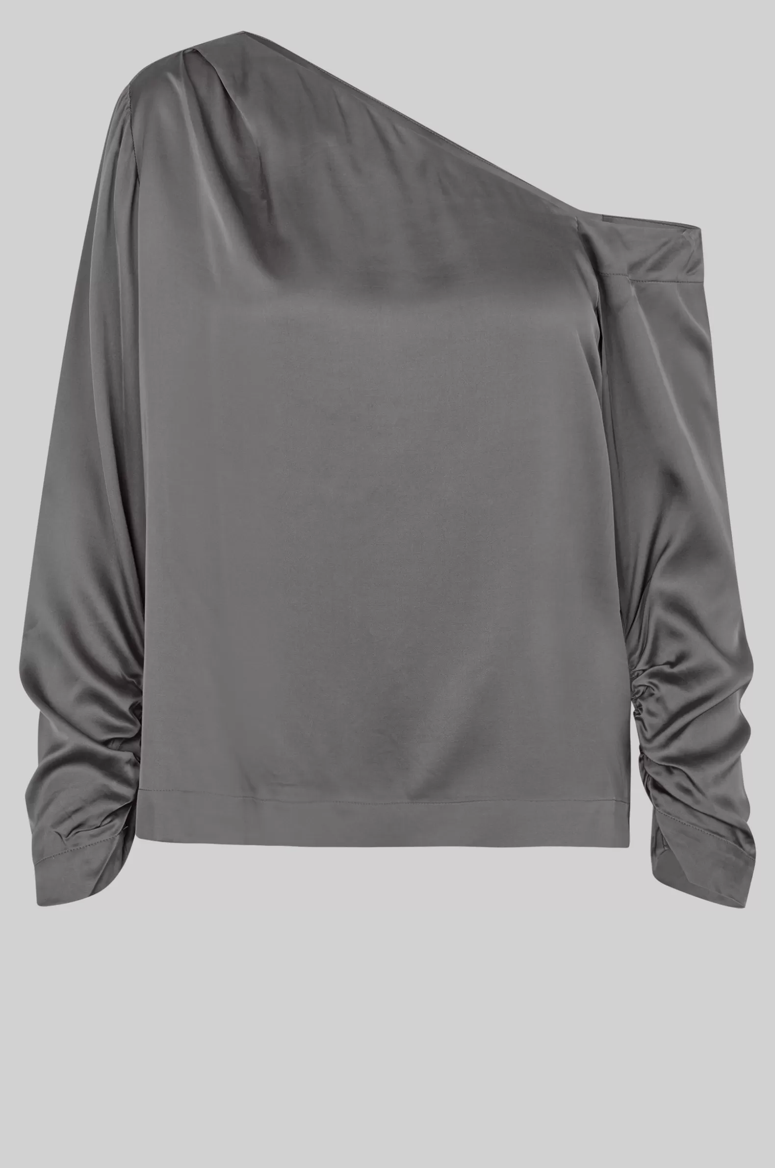 Second Female silky one-shoulder top. The top is made in soft and drapy viscose with a lustrous quality. Featuring a diagonal neckline that leaves one shoulder bare. Long sleeves with gathers at cuffs. Regular, straight fit.