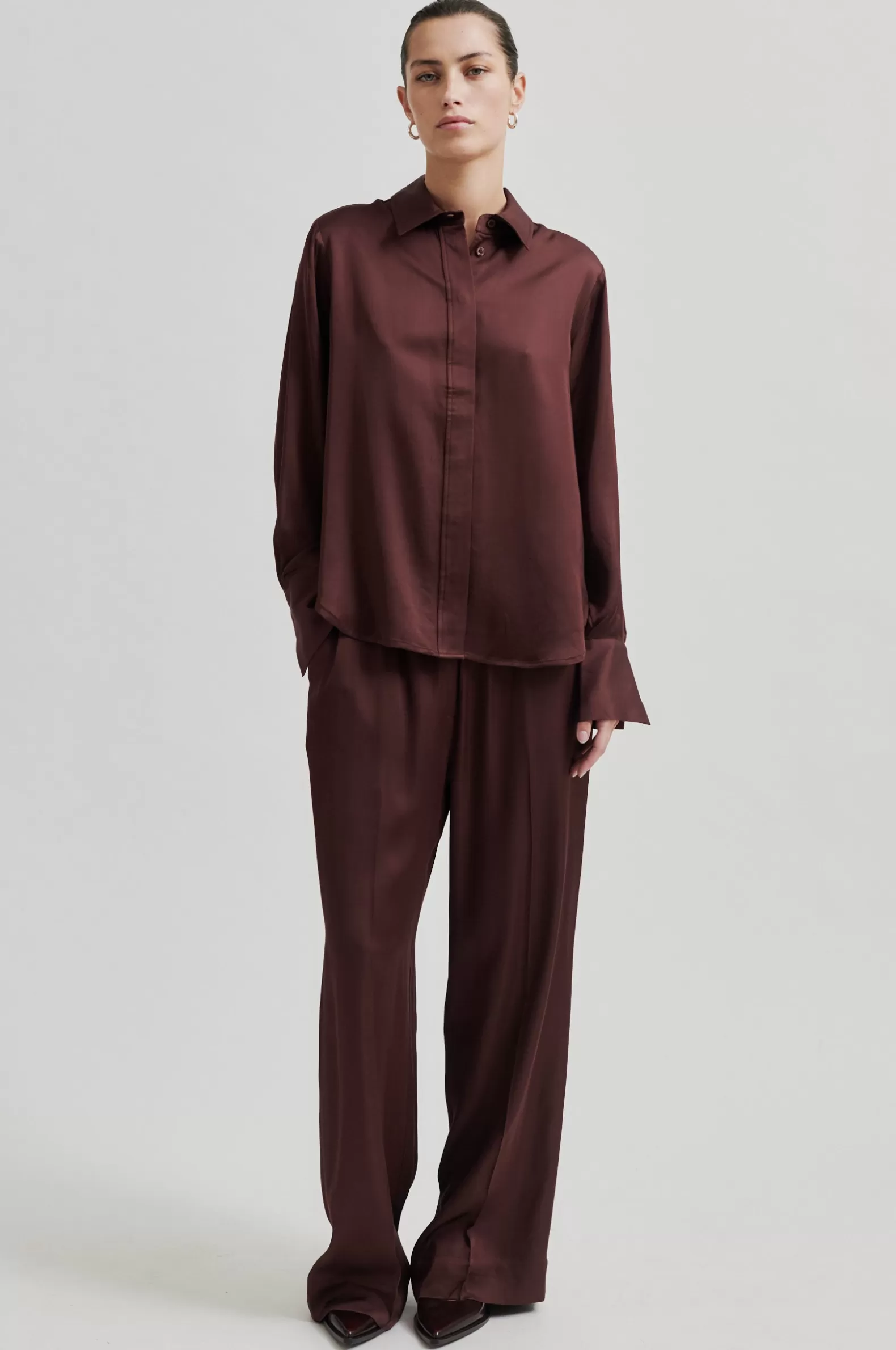 Second Female silky trousers. The trousers are made in a soft and drapy viscose with a lustrous quality. Featuring a covered elasticated waistband and decorative fly at the front. Two slanted pockets at the front and two decorative pockets at the back. Regular waist with straight, wide leg.
