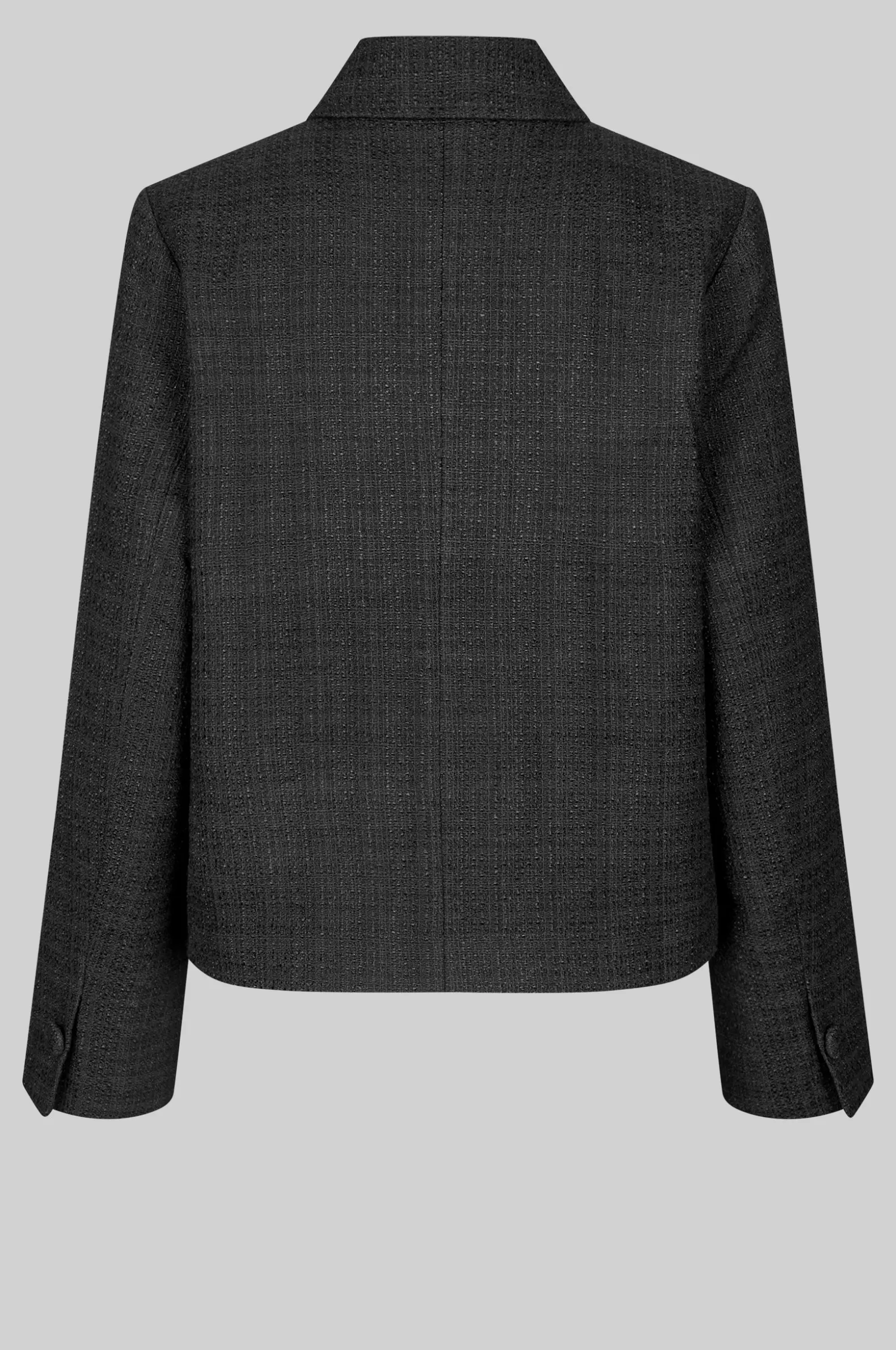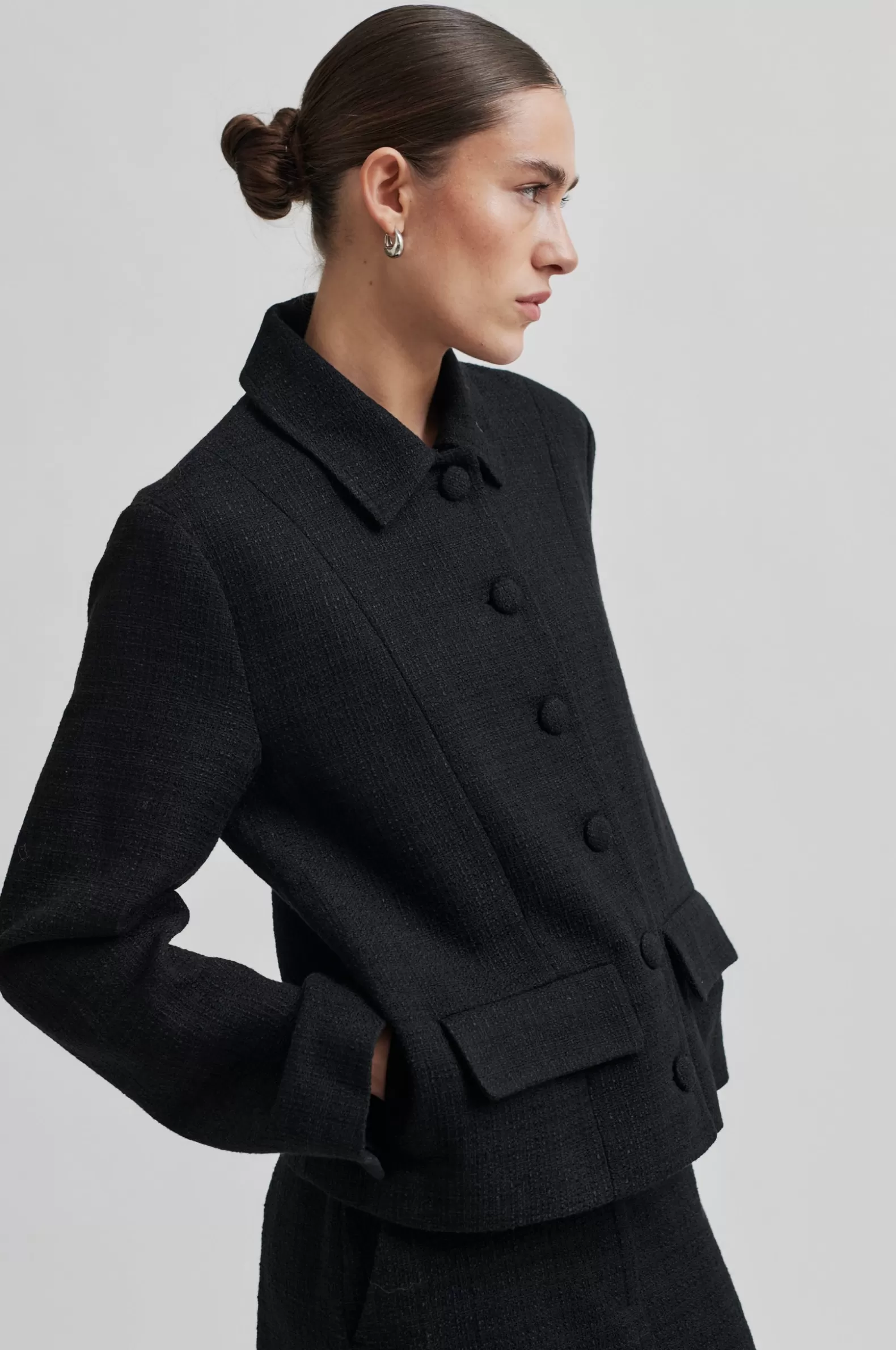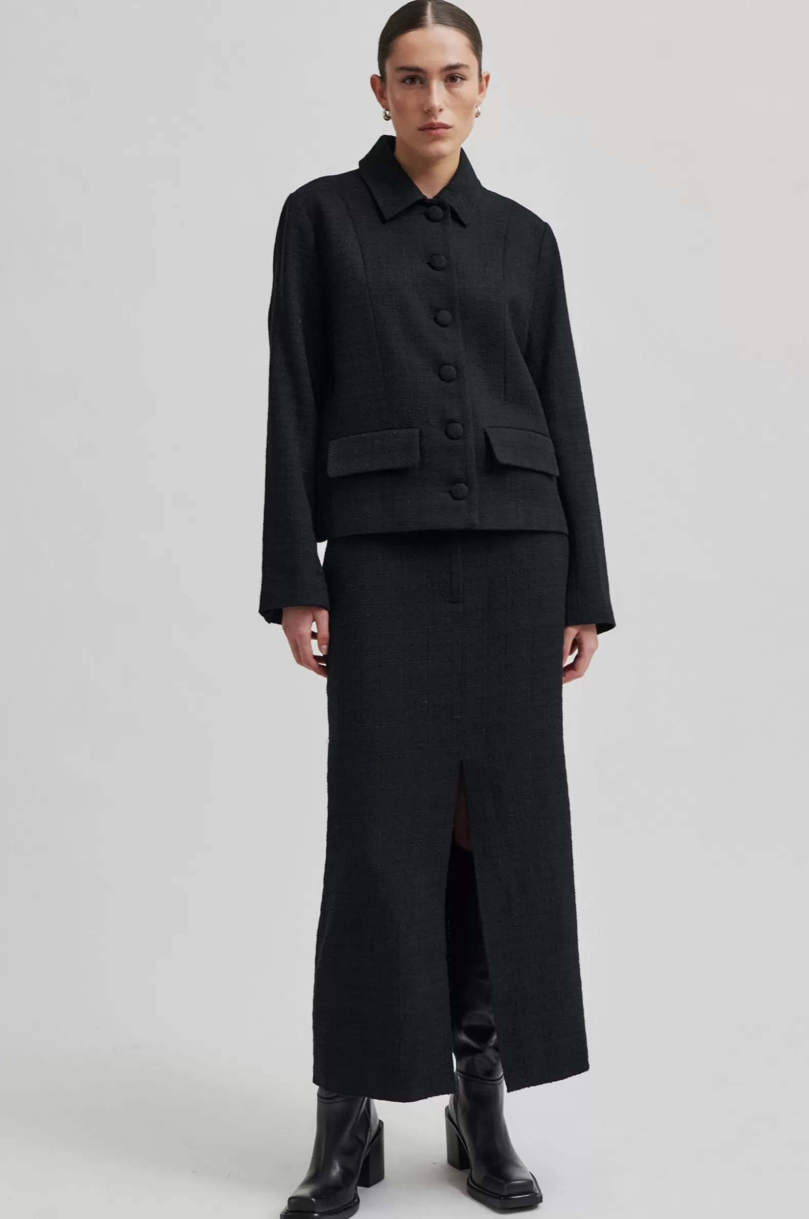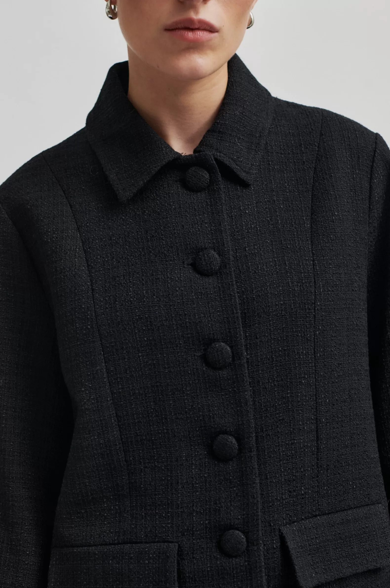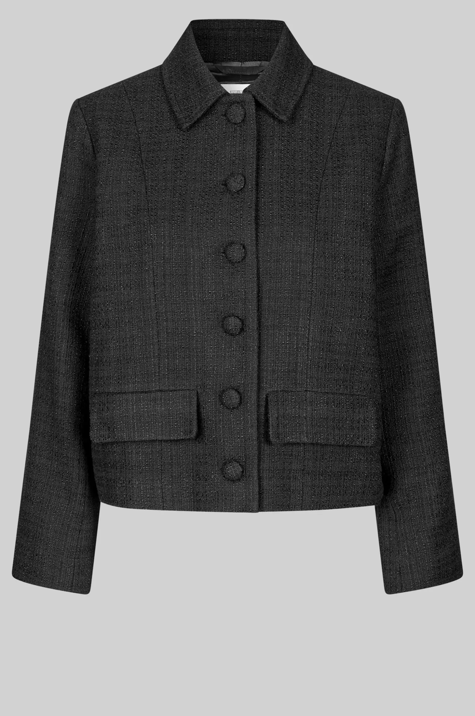 Second Female buttoned jacket. Made in a thick fabric blend with slightly structured finish. Featuring a regular collar and fastening with covered buttons at the front. Long sleeves with slits and buttoned cuffs. Two flap pockets. Shaped seams at front. Single slit at back. Fully lined. Straight, slightly boxy fit.
