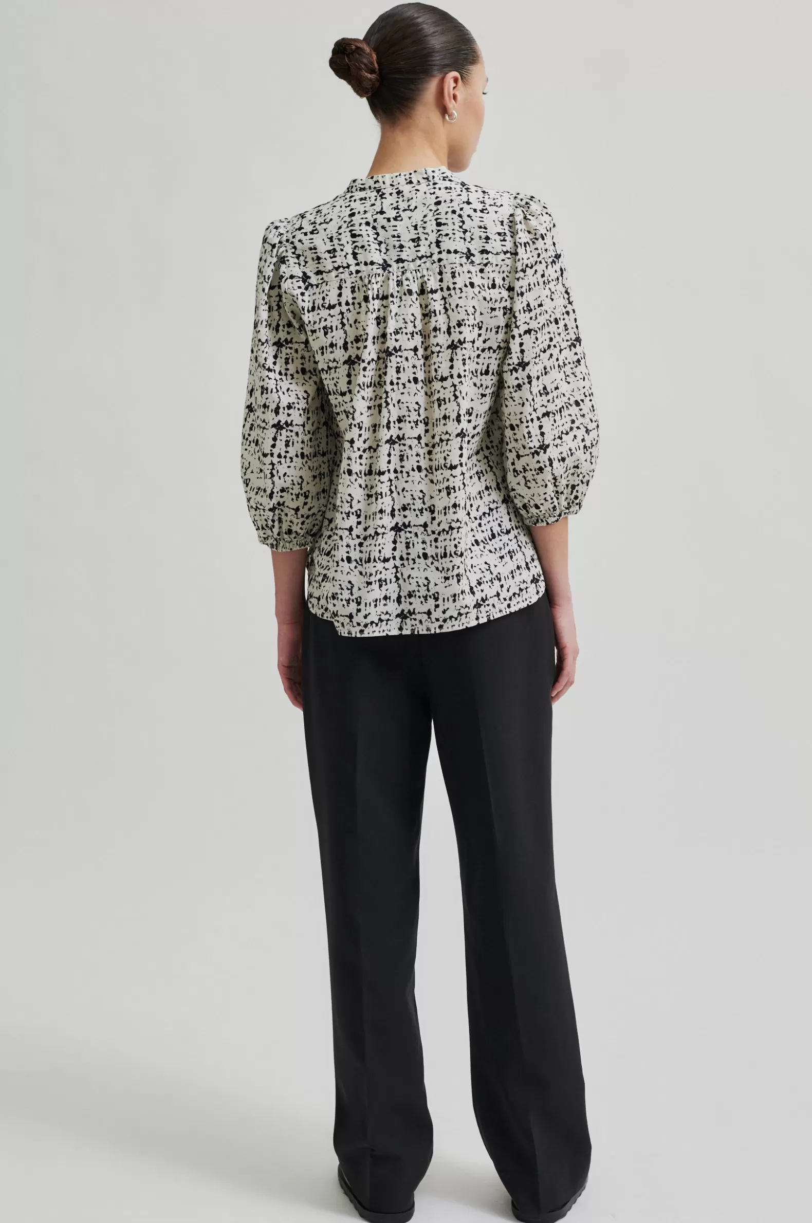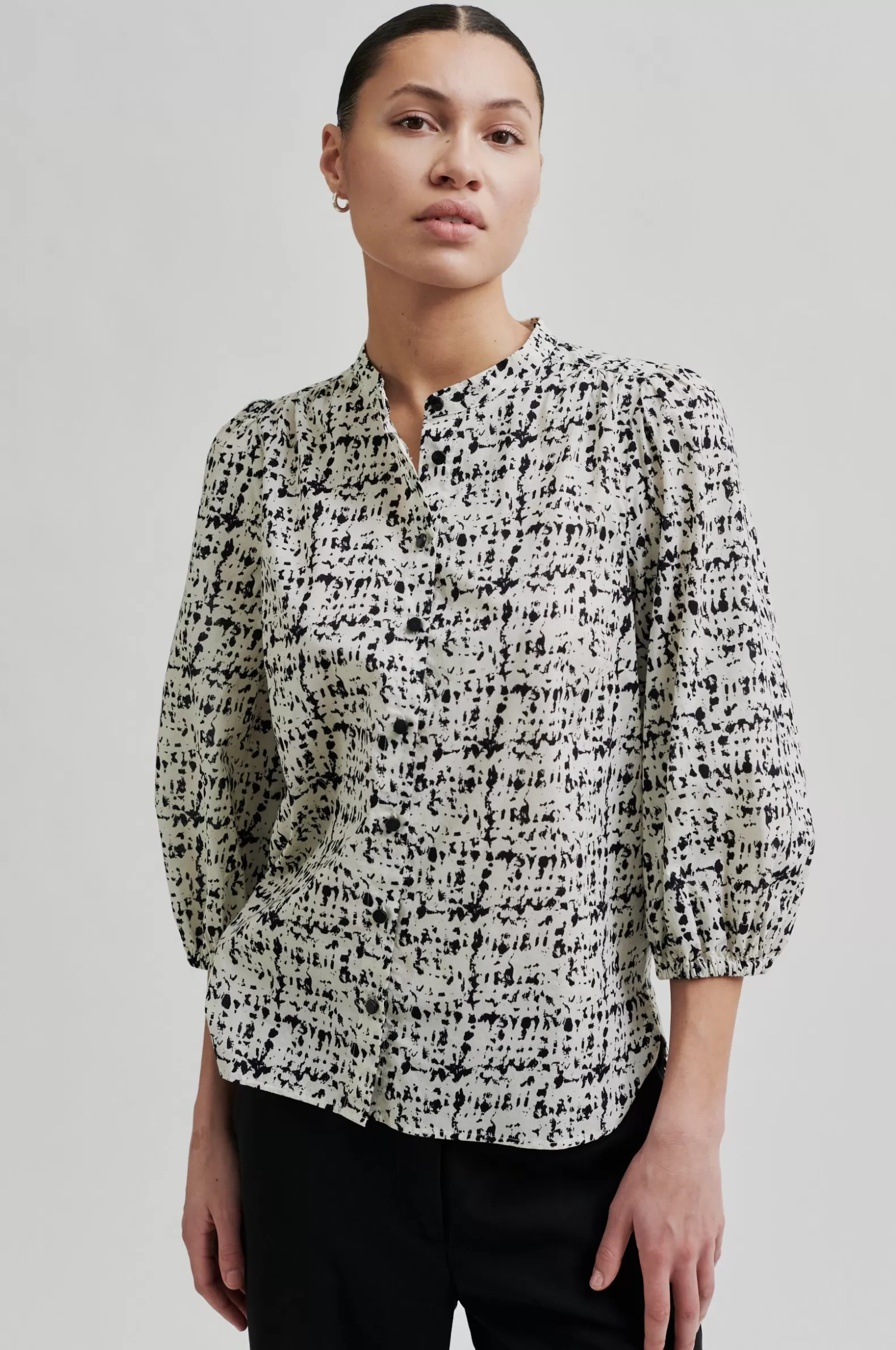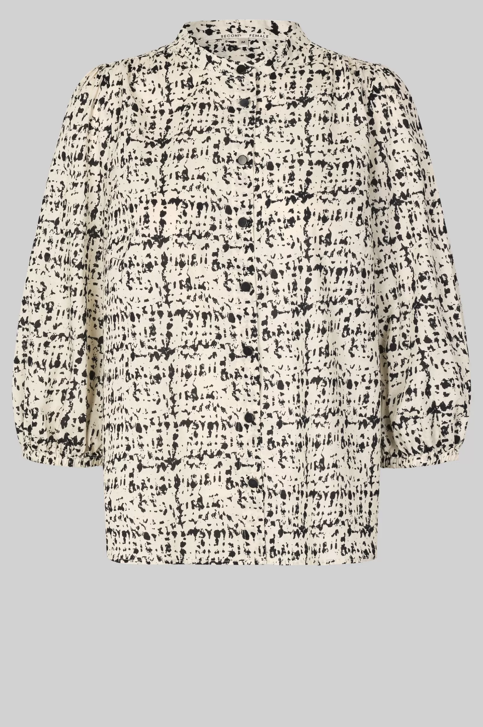 Second Female short-sleeved patterned blouse. Made in lightweight and smooth organic cotton with all-over graphic pattern. Featuring a round neck and button through fastening with contrast buttons. Slightly puffed shoulders and cropped sleeves with elasticated cuffs. Bust darts and gathers at back yoke. Shaped bottom hem. Regular fit.