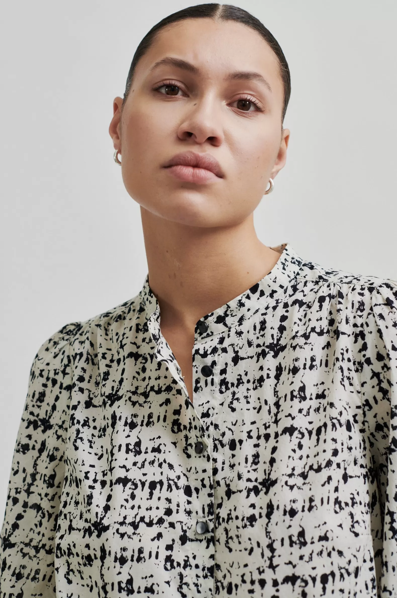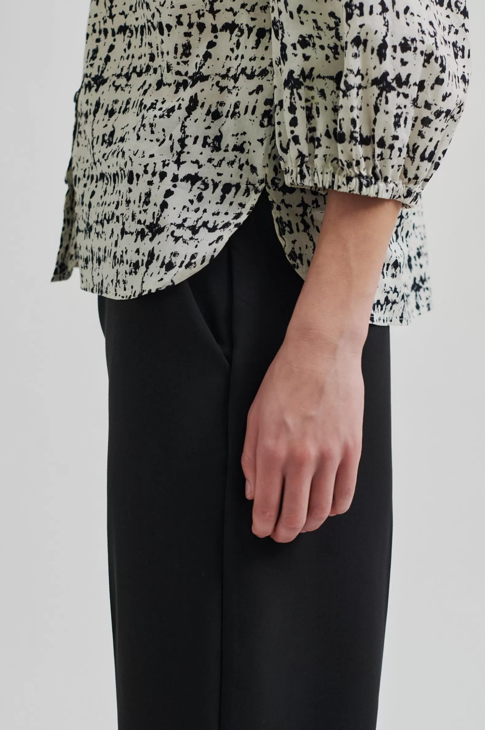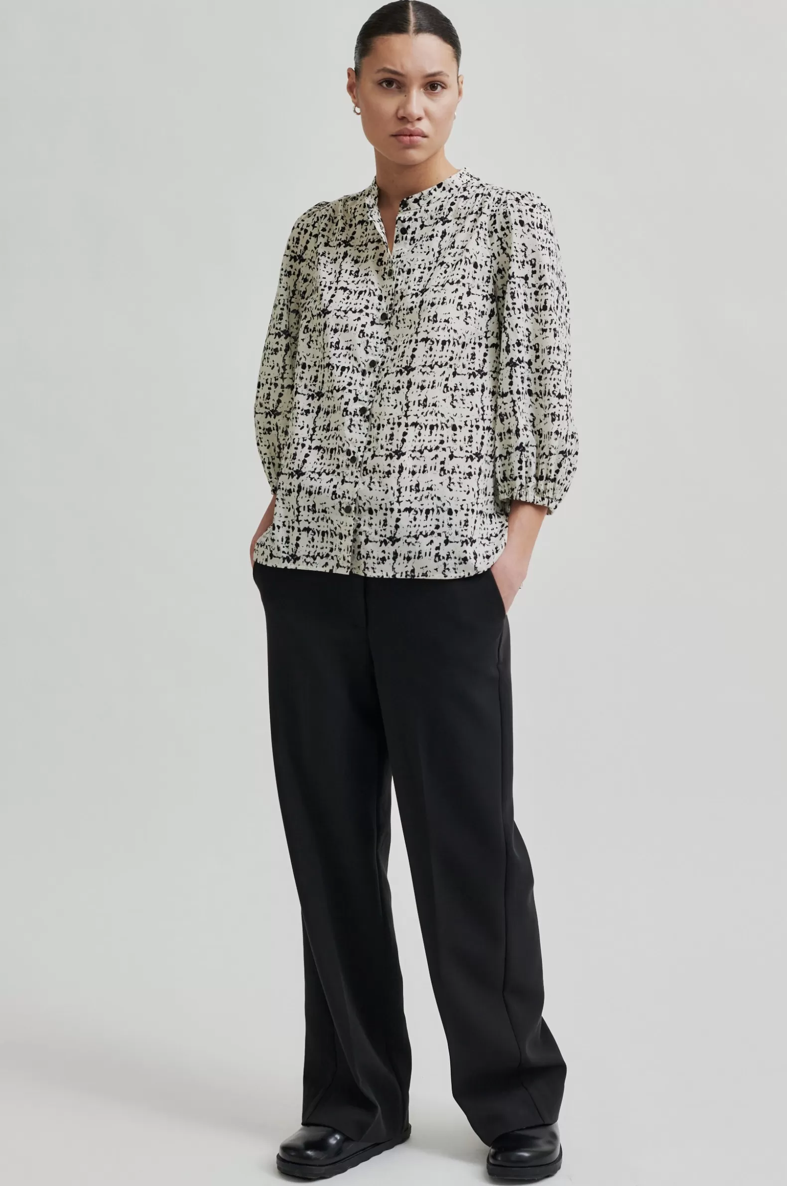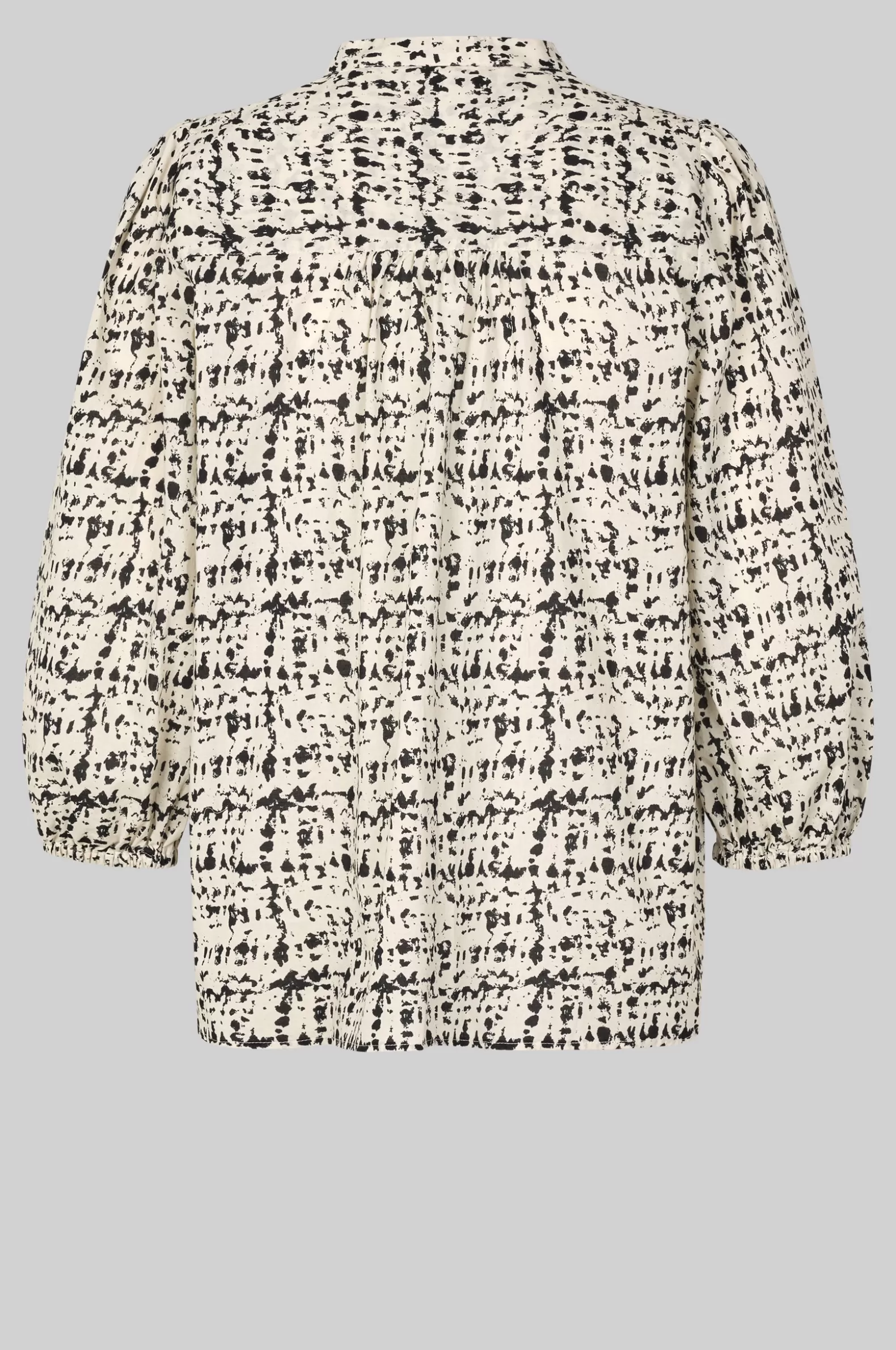 Second Female short-sleeved patterned blouse. Made in lightweight and smooth organic cotton with all-over graphic pattern. Featuring a round neck and button through fastening with contrast buttons. Slightly puffed shoulders and cropped sleeves with elasticated cuffs. Bust darts and gathers at back yoke. Shaped bottom hem. Regular fit.