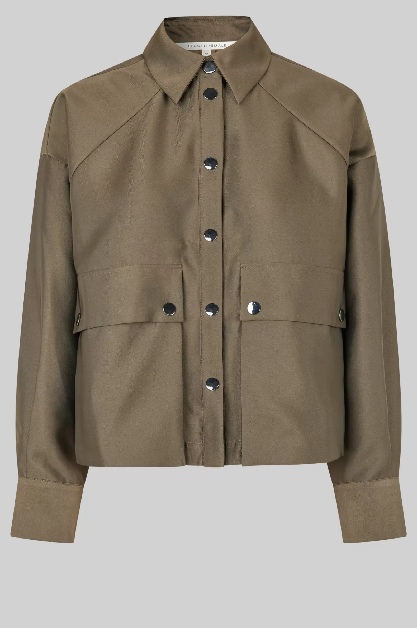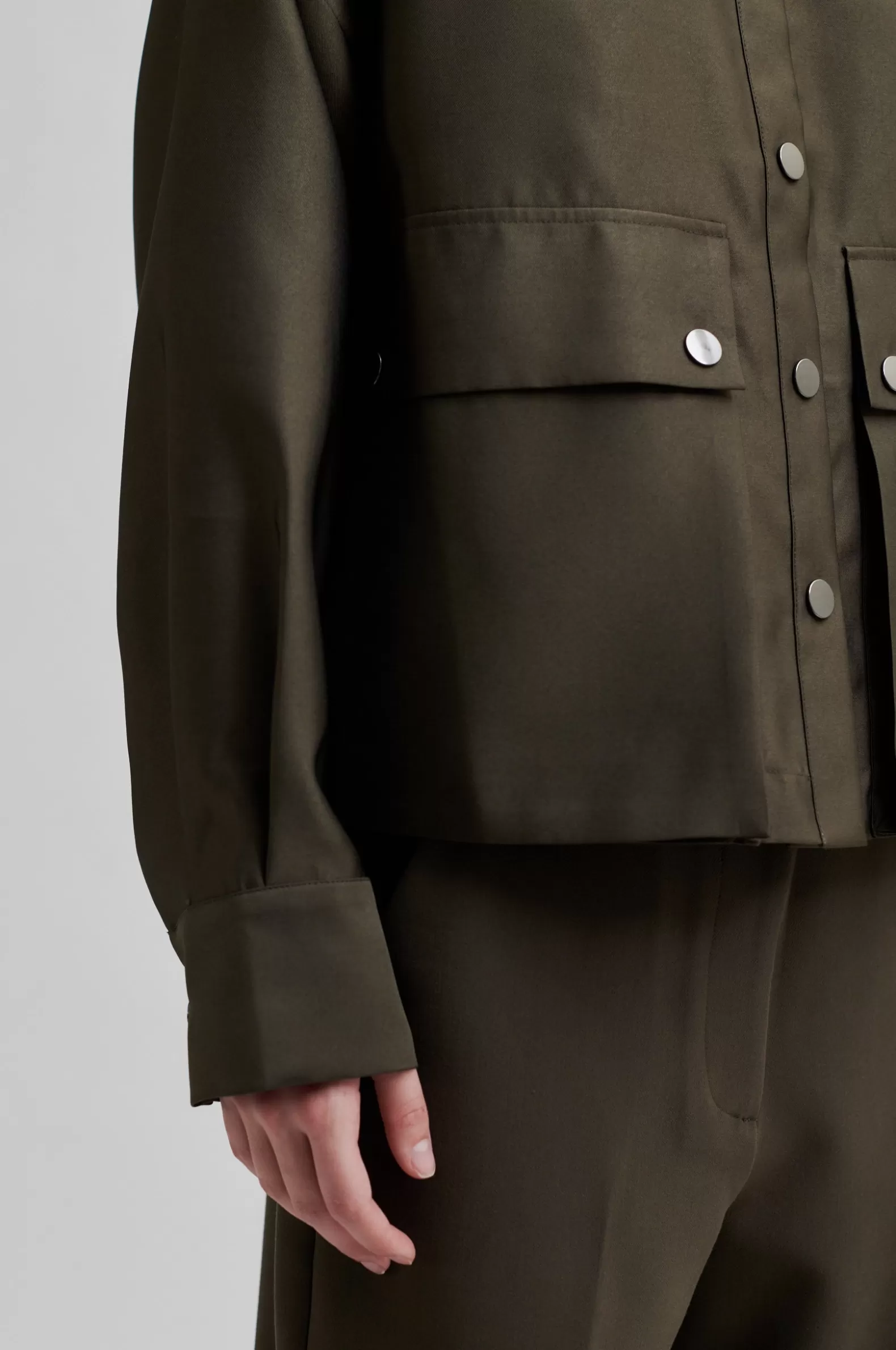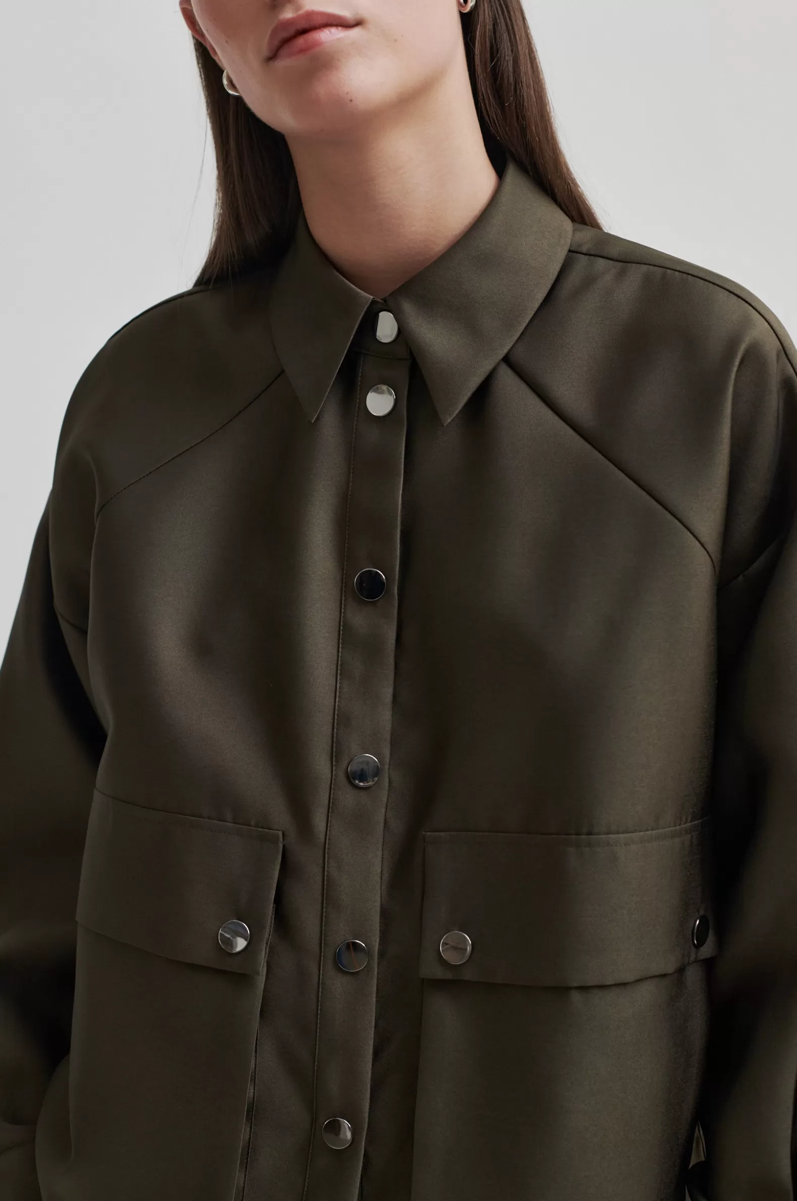 Second Female utility shirt. Made in light, smooth fabric with slight lustrous finish. Featuring a regular collar and placket with press stud fastening. Long sleeves with press stud fastening at cuffs. Two large flap pockets with press studs. Raglan sleeves with press button fastening. Inverted pleat at back. Loose, wide and boxy fit.