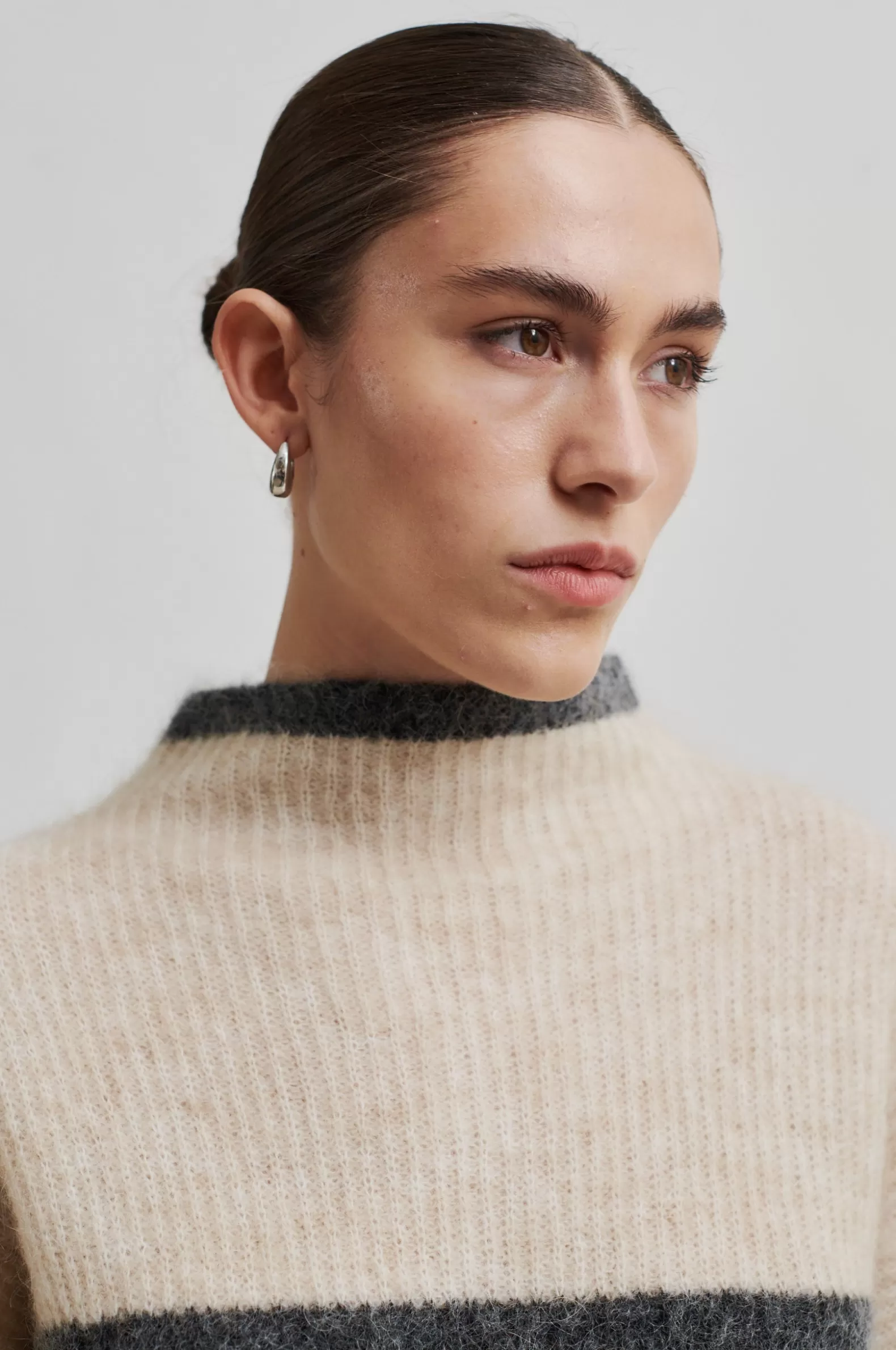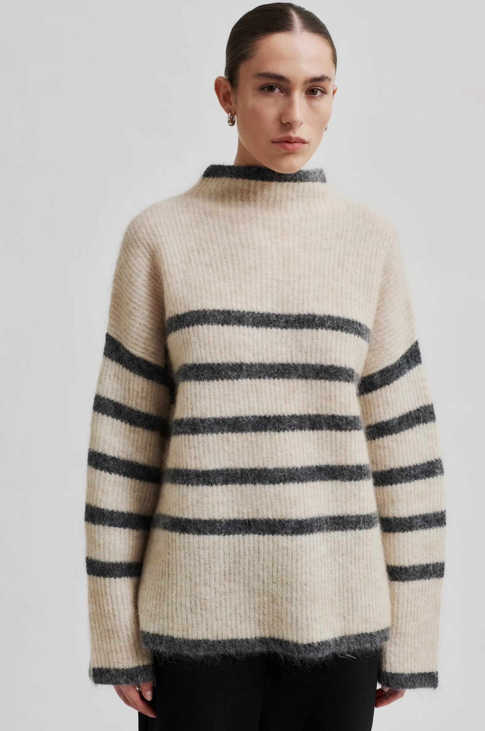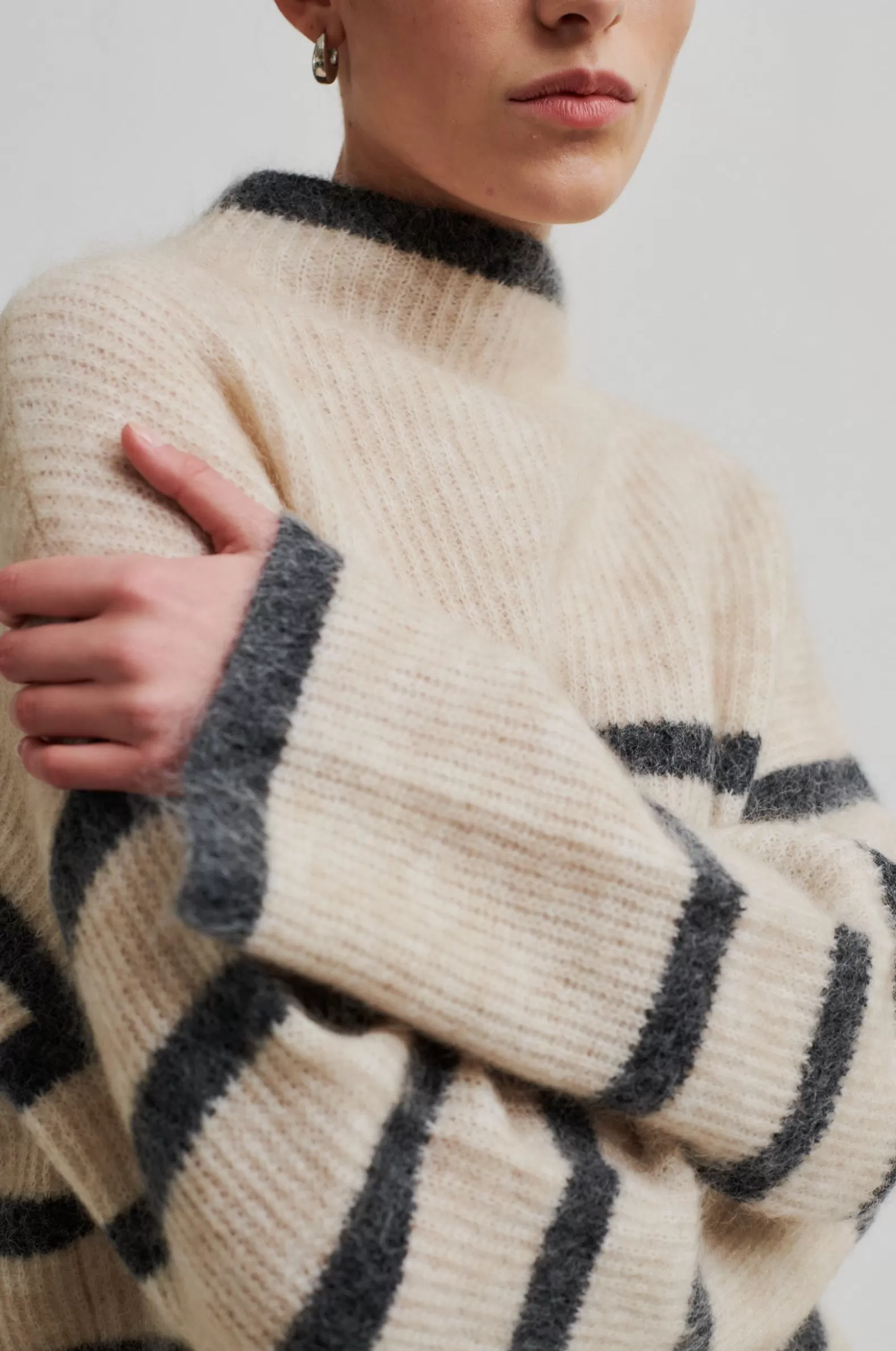 Second Female striped turtleneck pullover. The cardigan is made in soft and lightweight wool-mohair blend with contrast horizontal stripes. Featuring a turtle neck and dropped shoulders with extra long sleeves. Slits at sides. Loose and slouchy fit. Knit with an oversize fitHigh neckShort slitsStriped patternMohair/wool mixPart of our Sustainable Choice