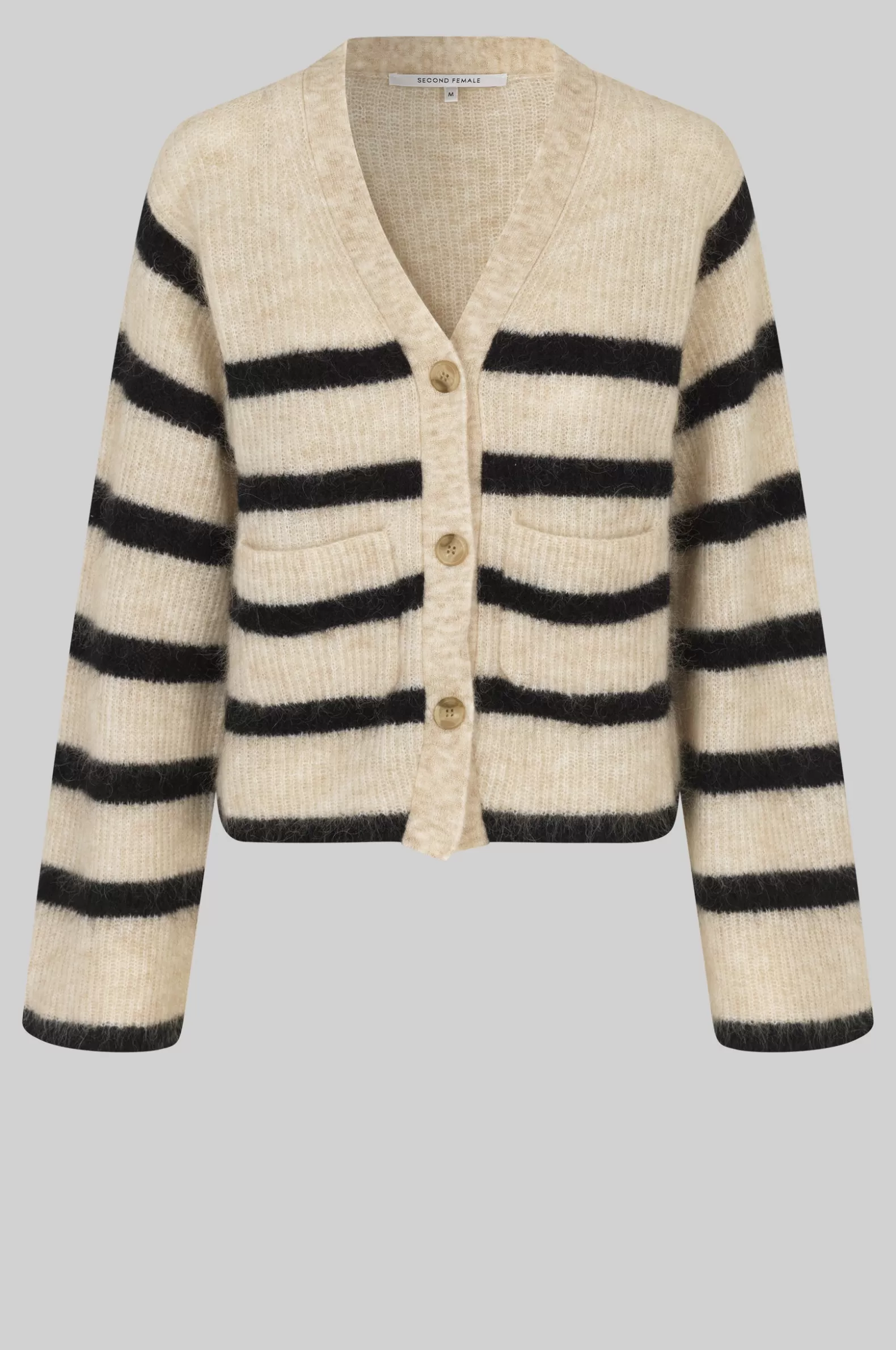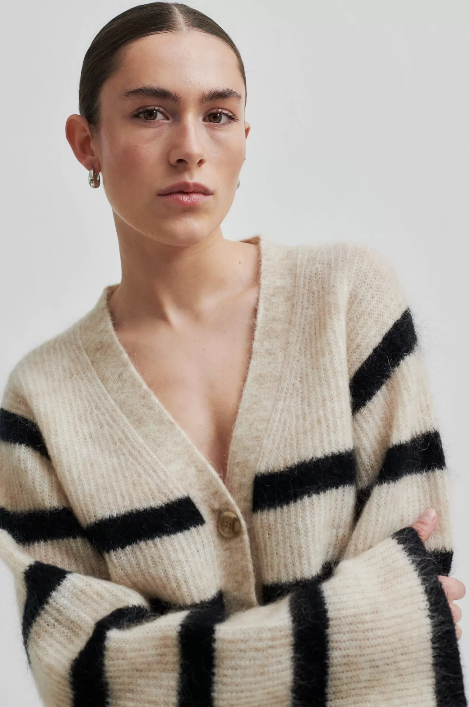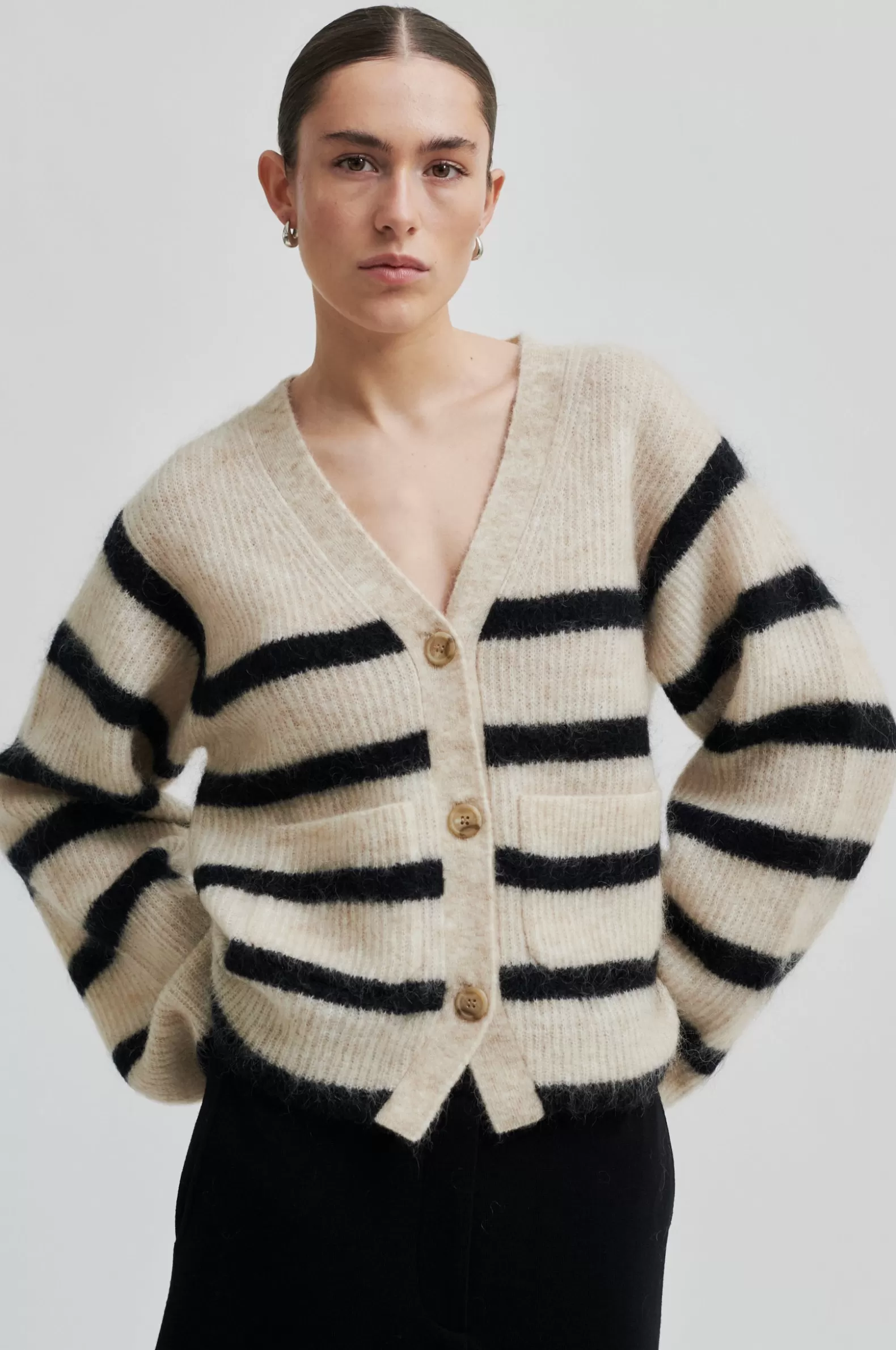 Second Female striped cardigan. Made in soft and lightweight wool-mohair blend with contrast horizontal stripes. Featuring a V-neckline and button-through fastening. Long sleeves that flare at ends. Two small patch pockets. Regular fit.