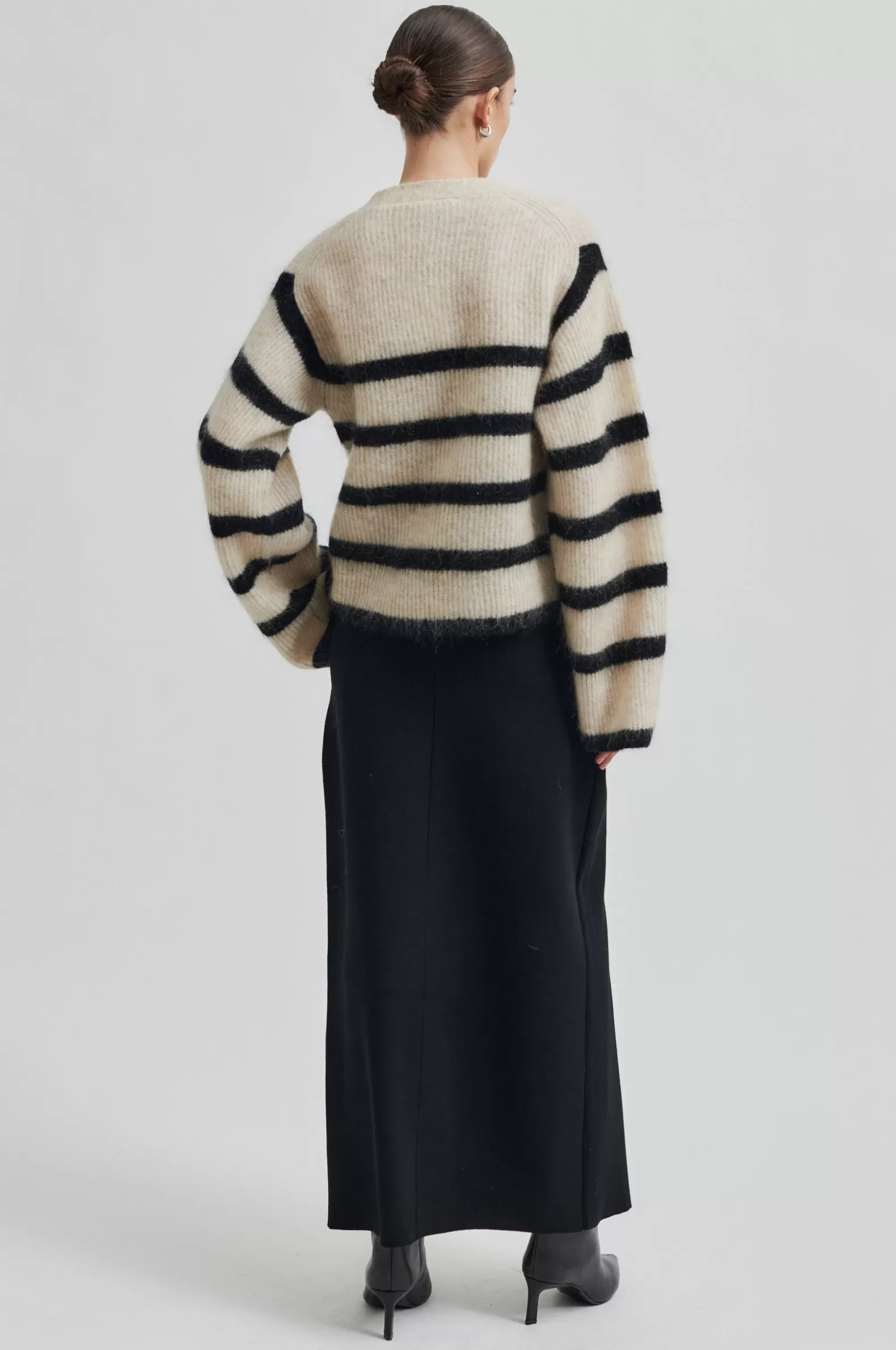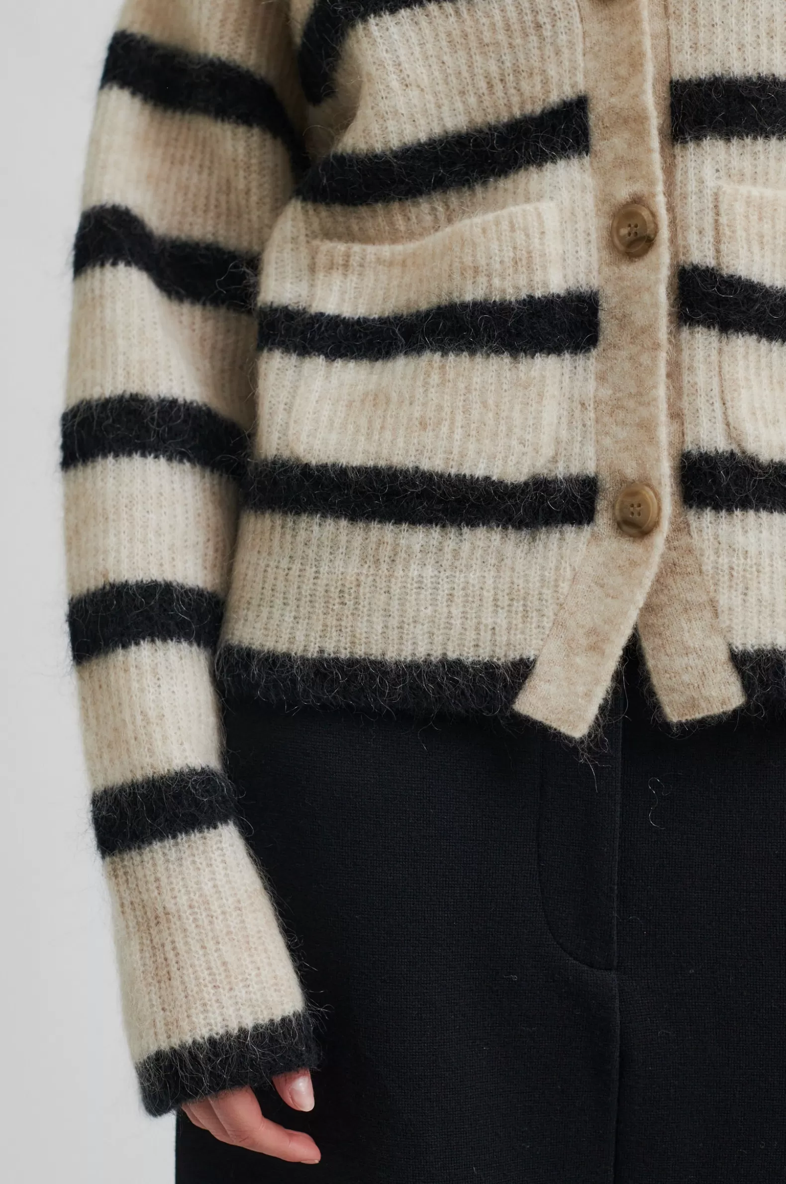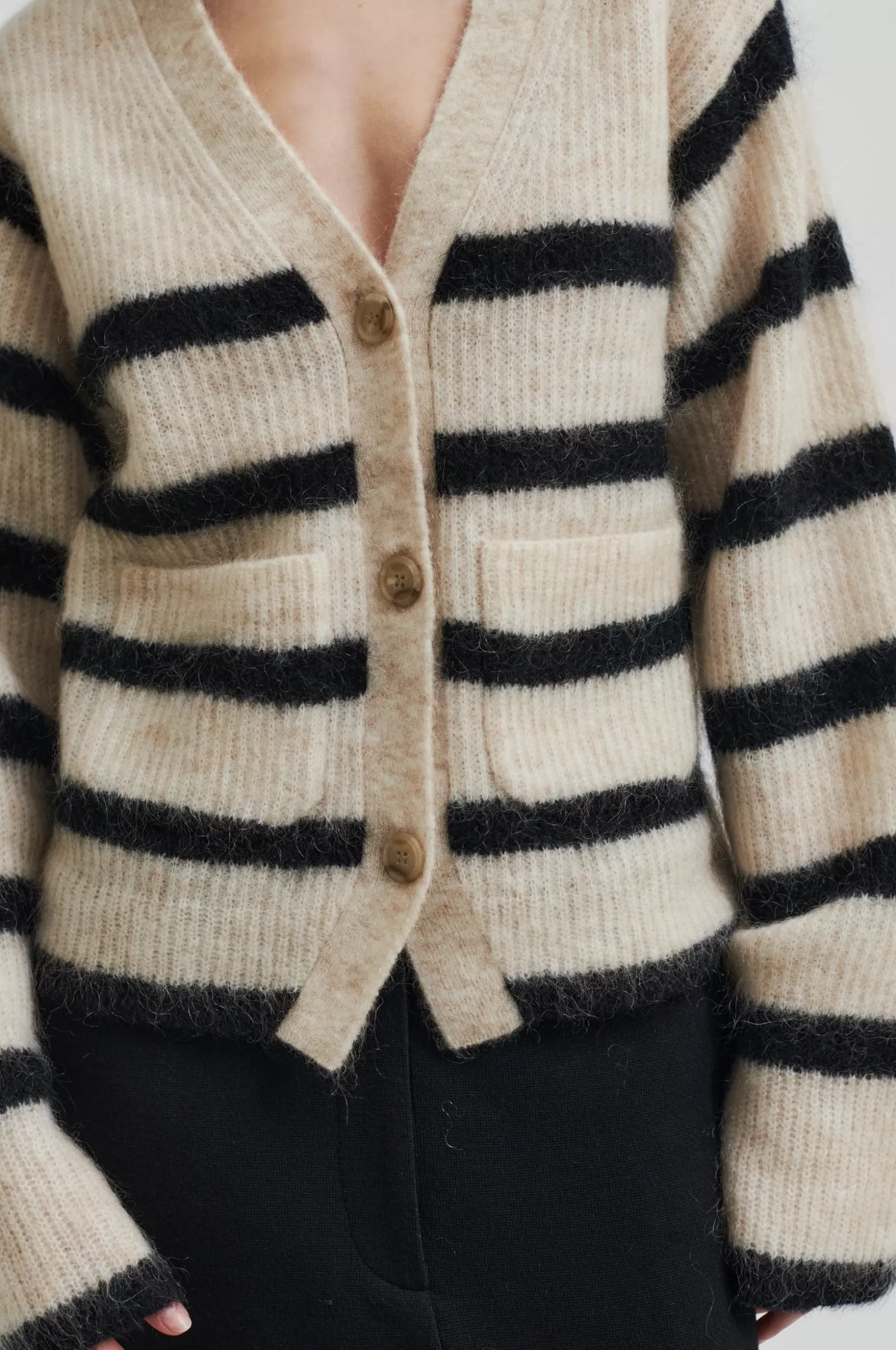Second Female striped cardigan. Made in soft and lightweight wool-mohair blend with contrast horizontal stripes. Featuring a V-neckline and button-through fastening. Long sleeves that flare at ends. Two small patch pockets. Regular fit.