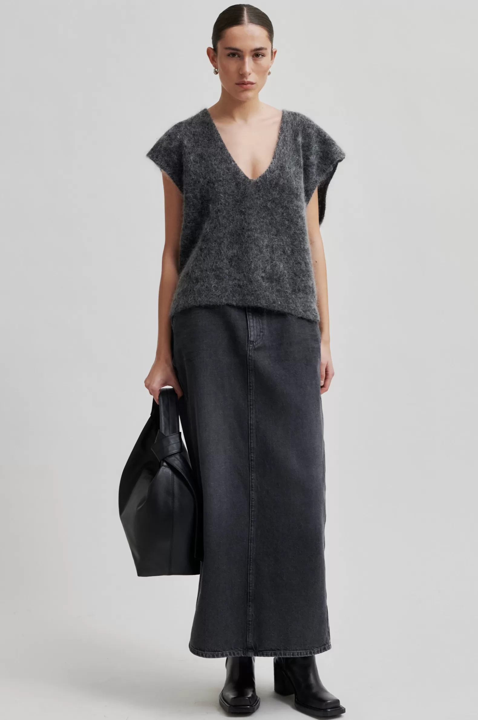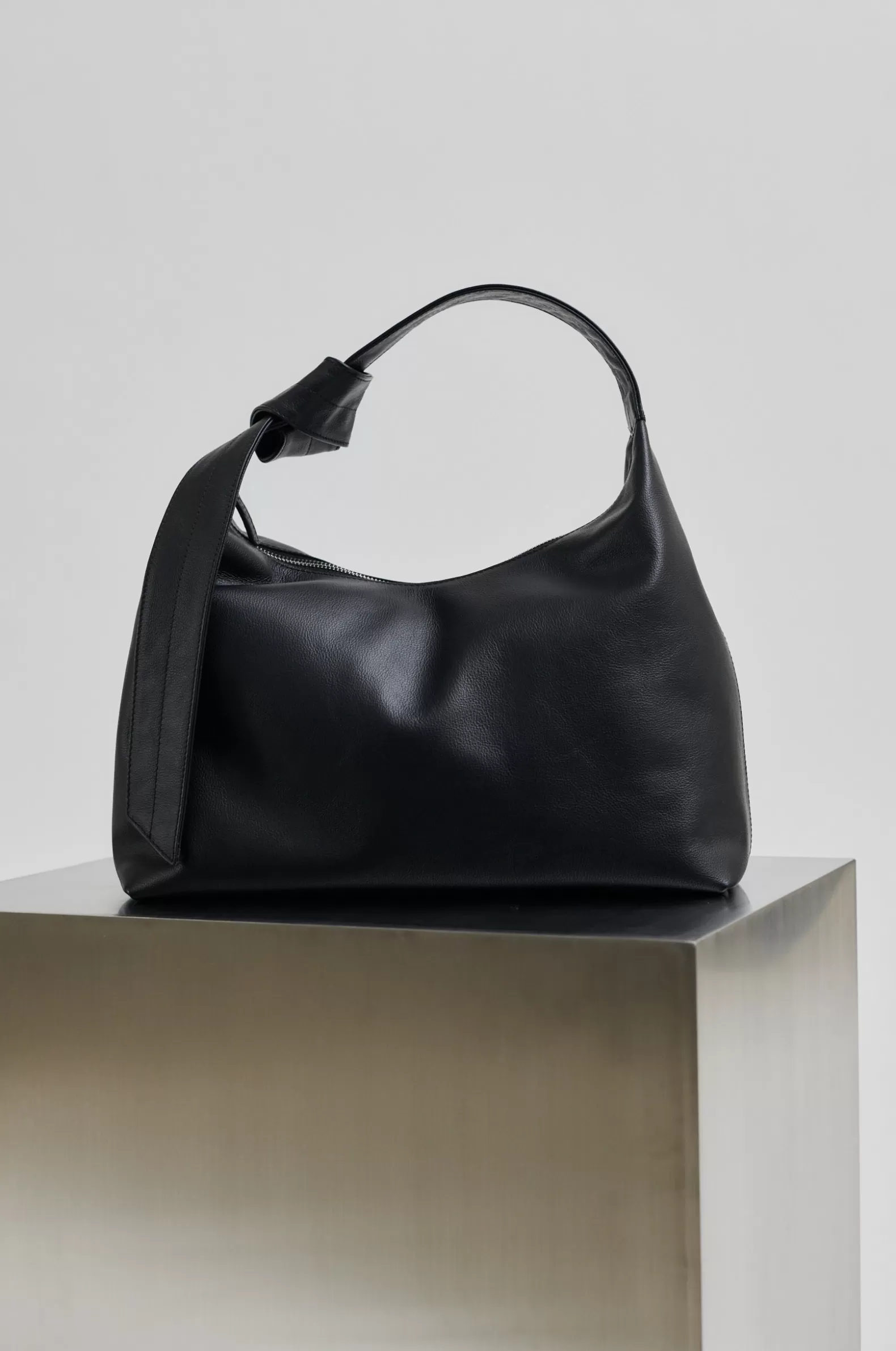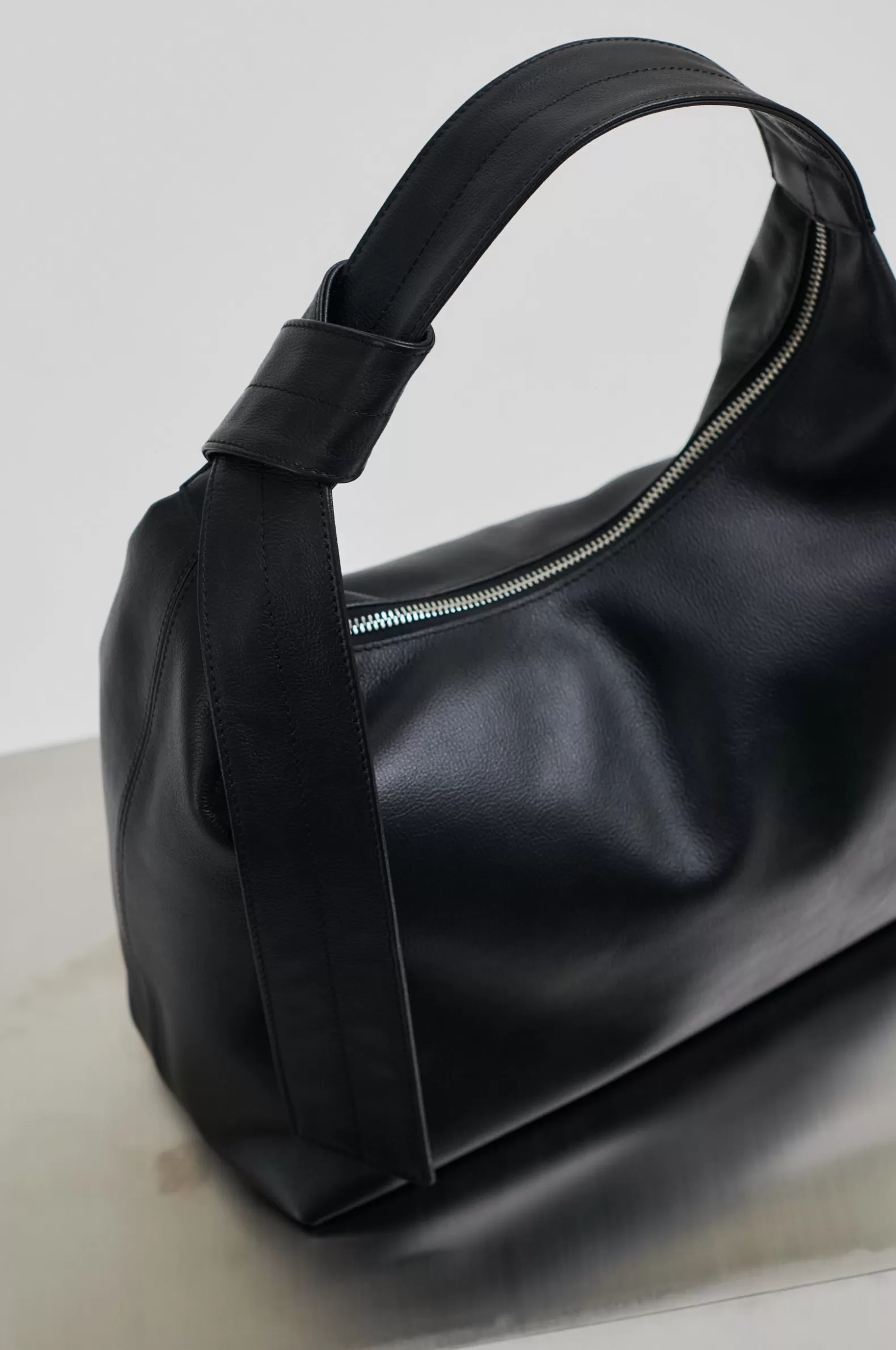 Second Female shoulder bag in leather. Made in smooth, slightly grainy leather with tonal stitching. Opening at top with metal zip and puller. Shoulder strap at top with knot detail at one side. Zip pocket at inside. Reinforced bottom. Fully lined.