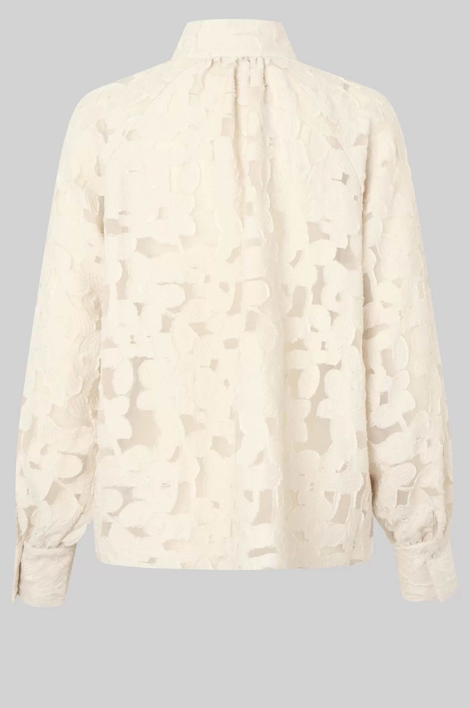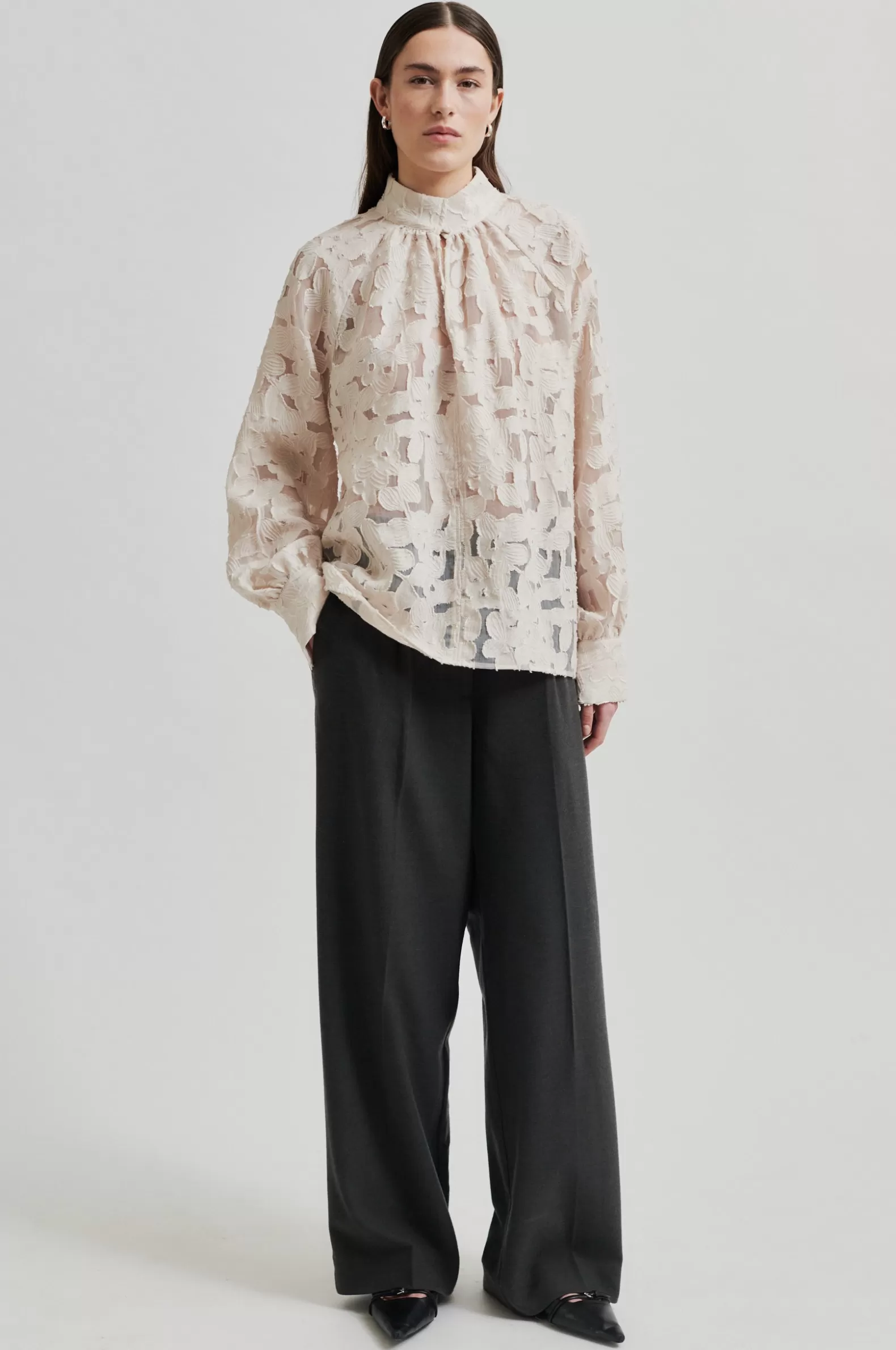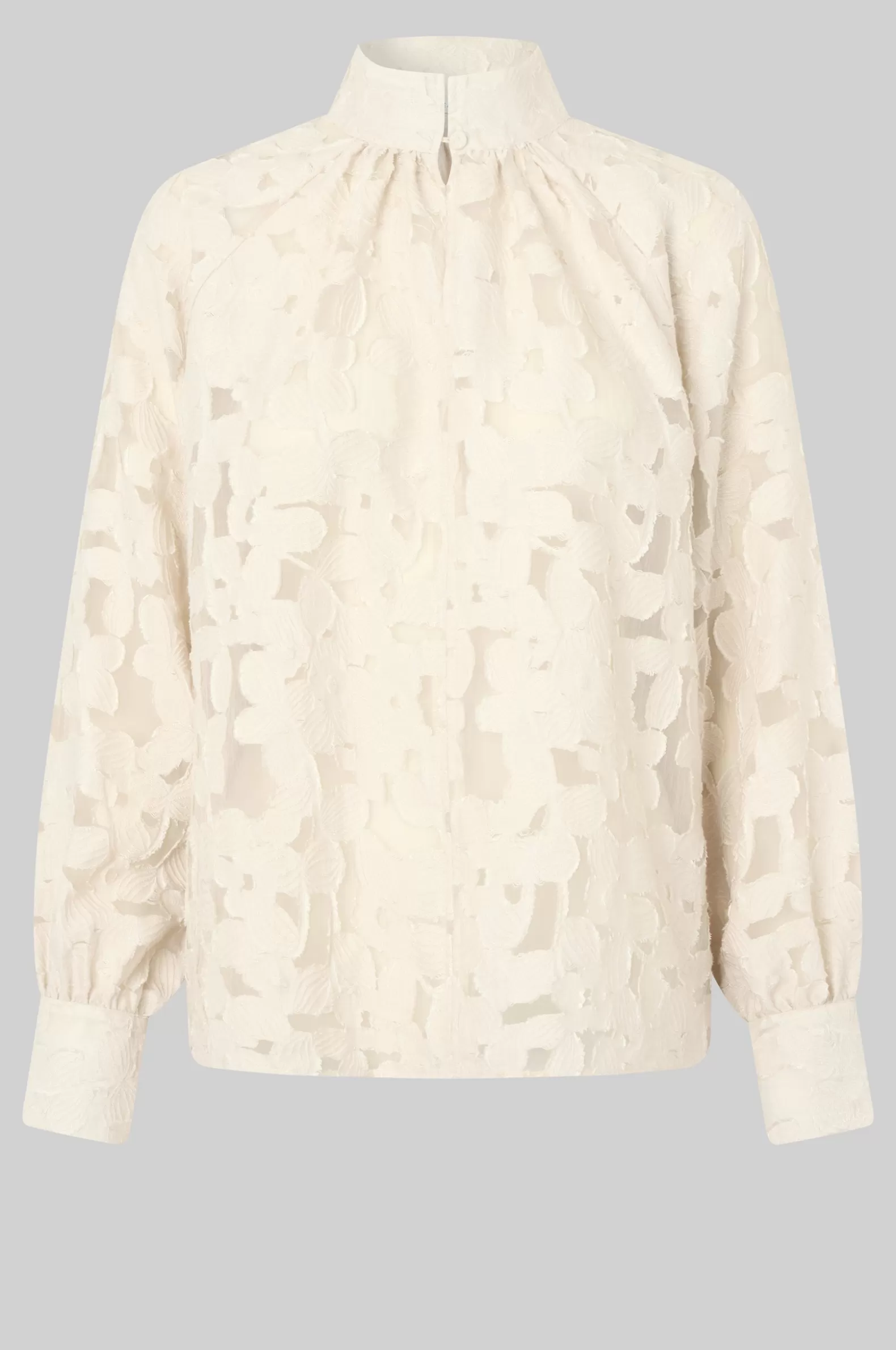 Second Female floral lace blouse. The blouse has floral lace on a sheer tonal background. Featuring a high neck with open front with button and loop fastening at the top with fabric covered buttons. Raglan sleeves with button fastening at the cuffs. Loose fit.