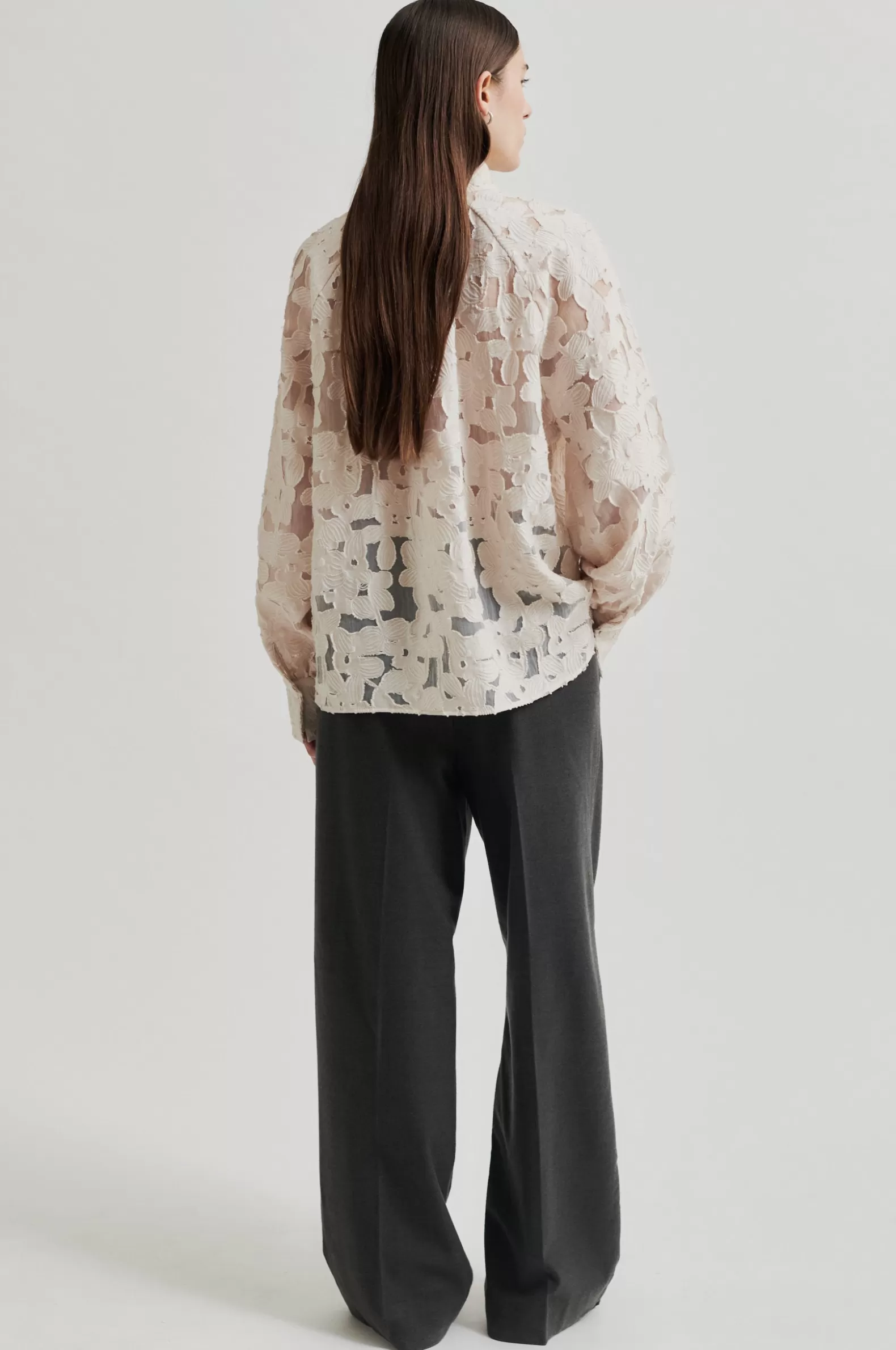 Second Female floral lace blouse. The blouse has floral lace on a sheer tonal background. Featuring a high neck with ope…