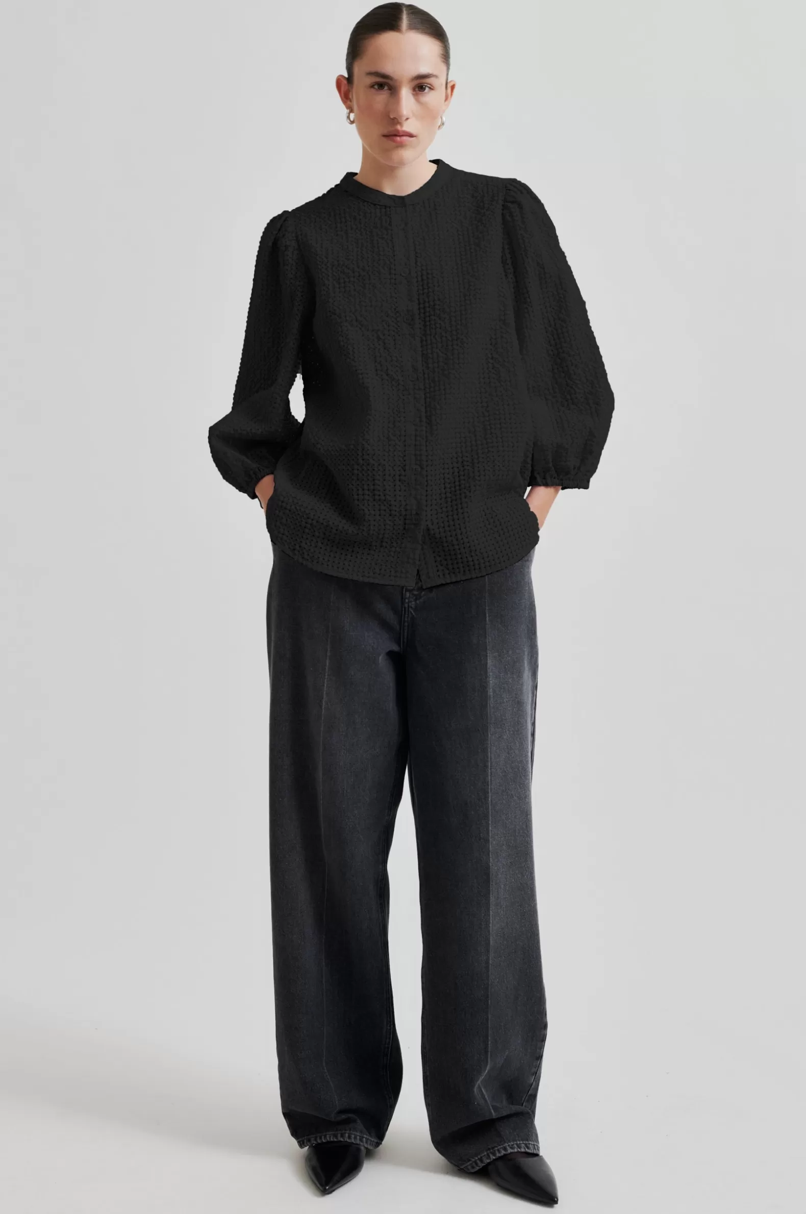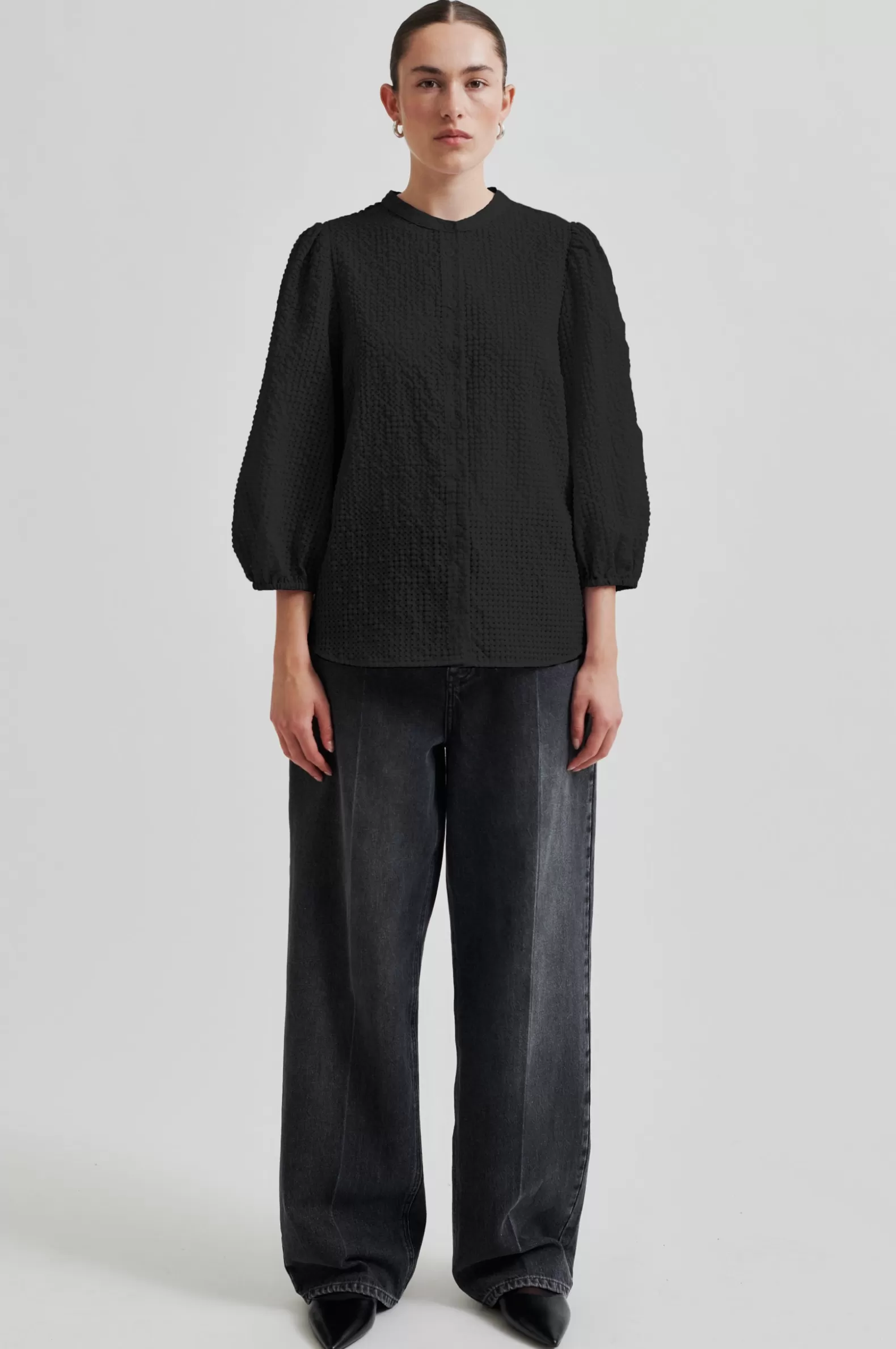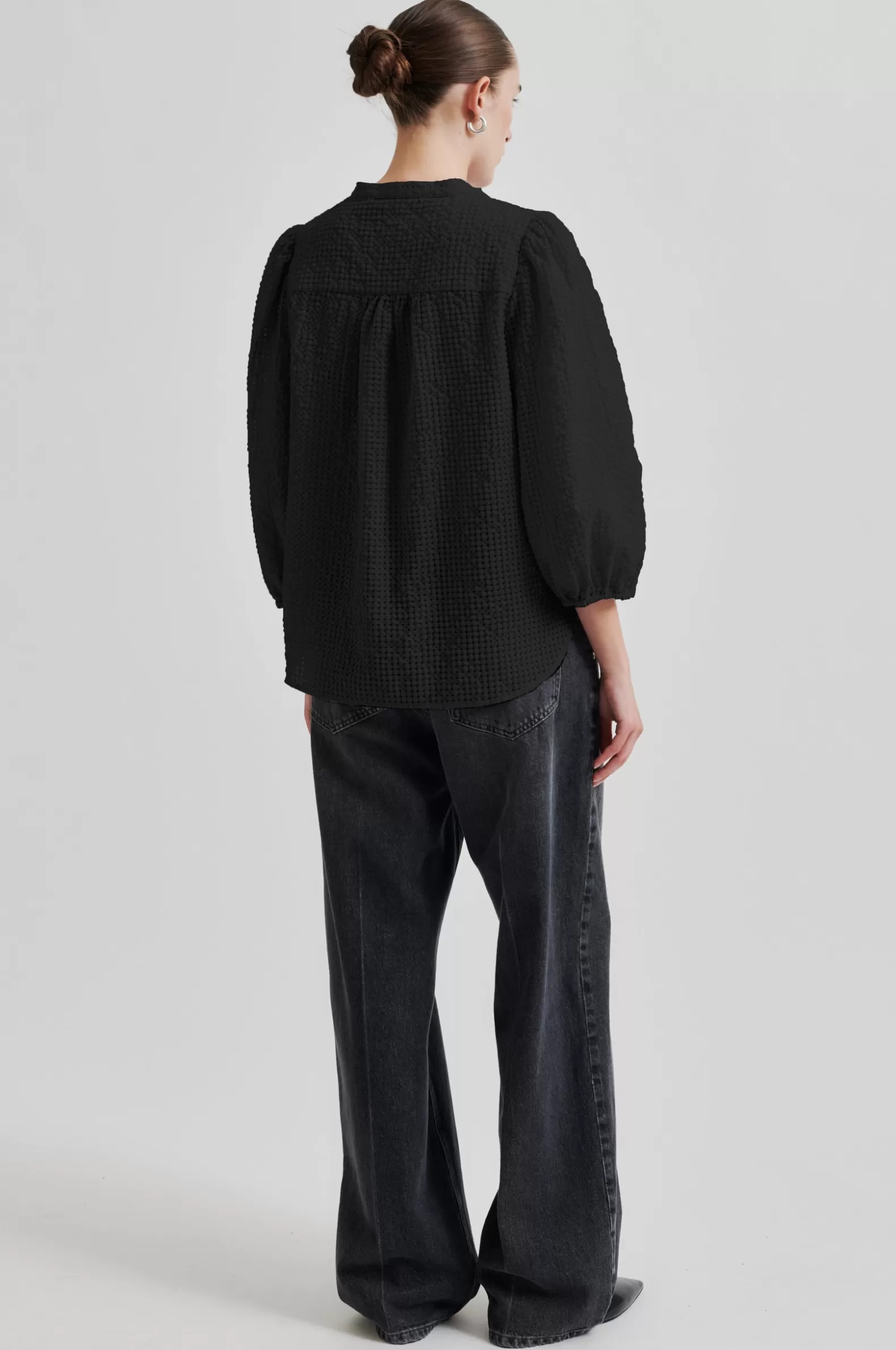 Second Female seersucker shirt. Made in a lightweight cotton blend with seersucker structure and checked sheer pattern. Featuring a round neckline and button-through fastening at the front. Raglan sleeves with elasticated cuffs. Shaped bottom hem. Relaxed fit.
