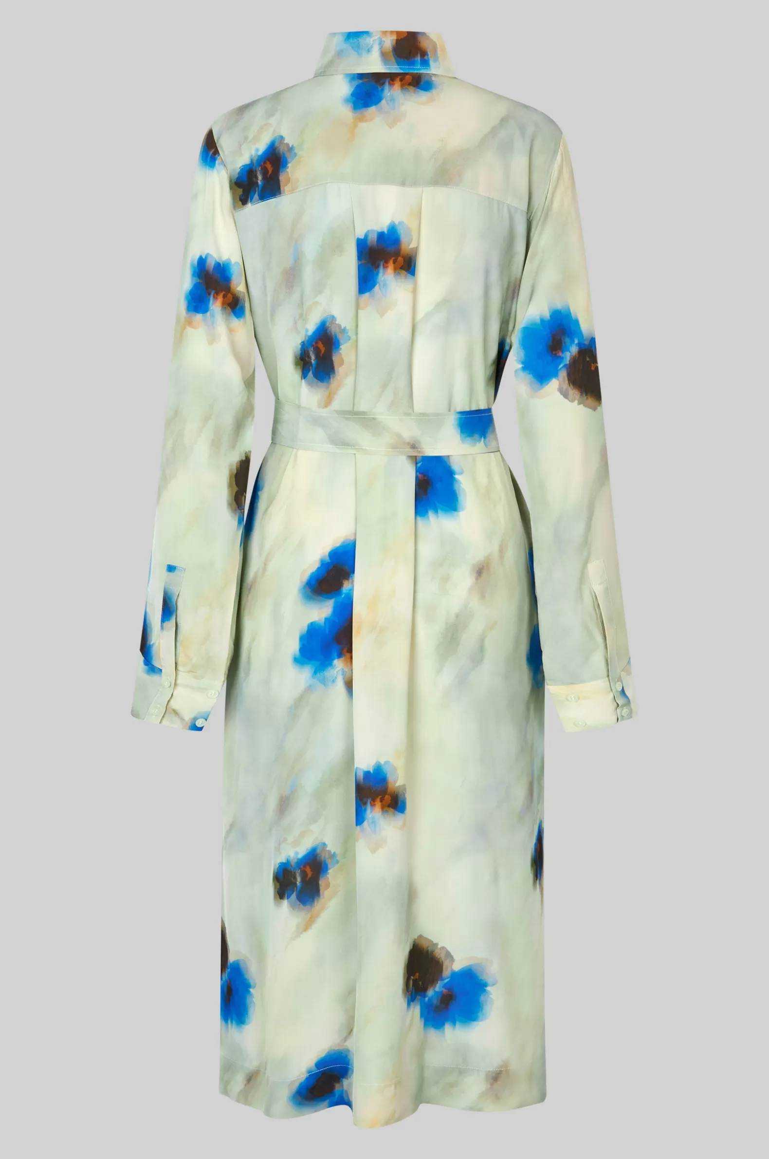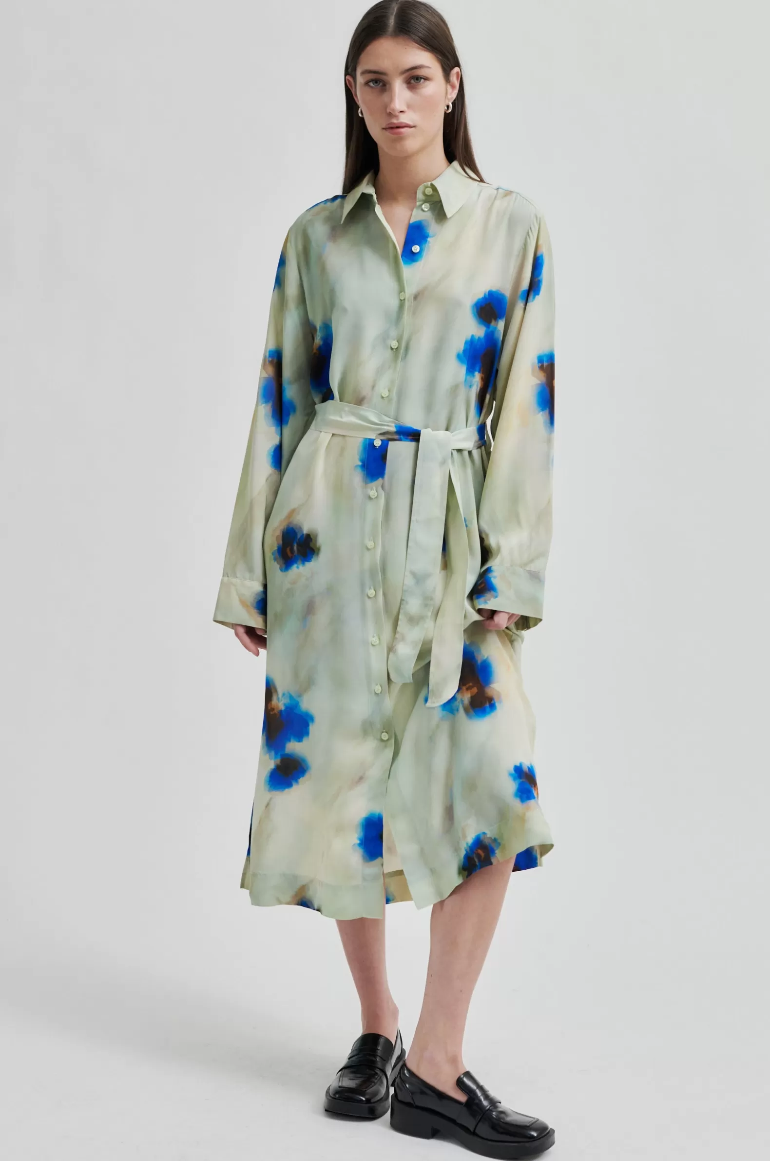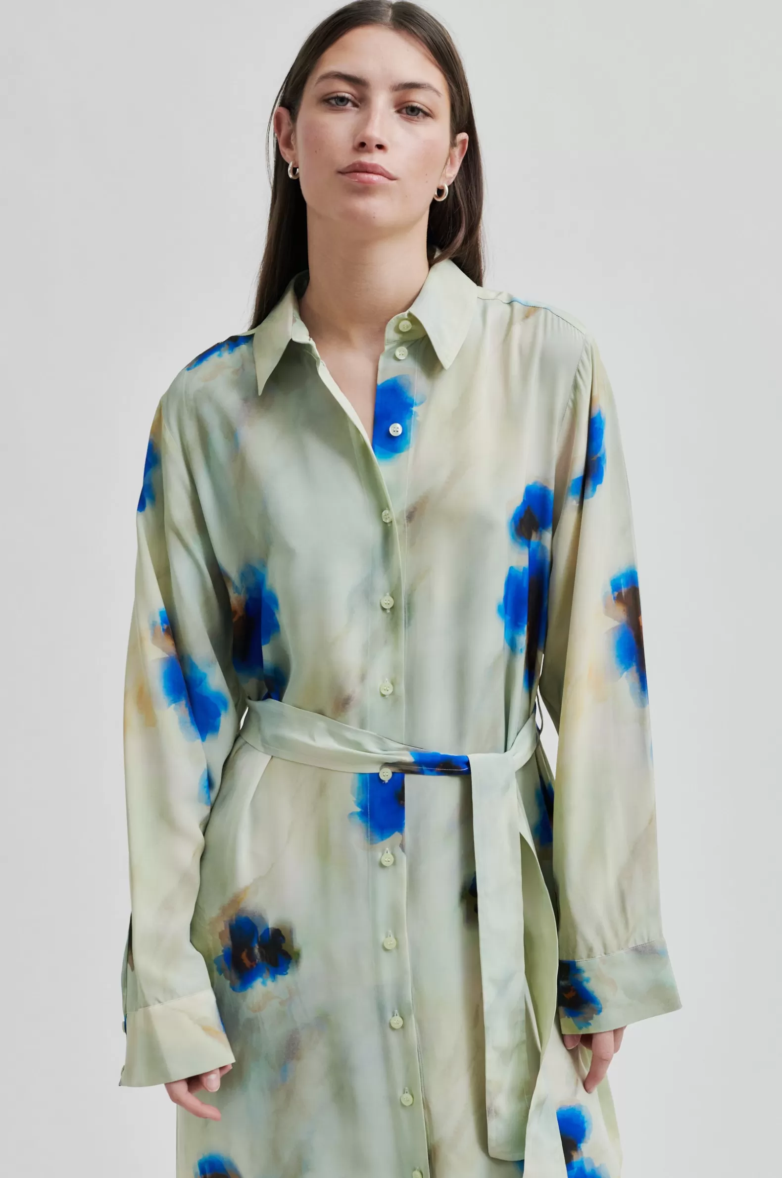Second Female patterned shirt dress. Made in soft and silky viscose with graphic floral print. Features a regular collar and button-through fastening. Tie belt at waist and pockets in side seams. Long sleeves with wide cuffs with adjustable button fastening. Slits at sides. Regular fit.