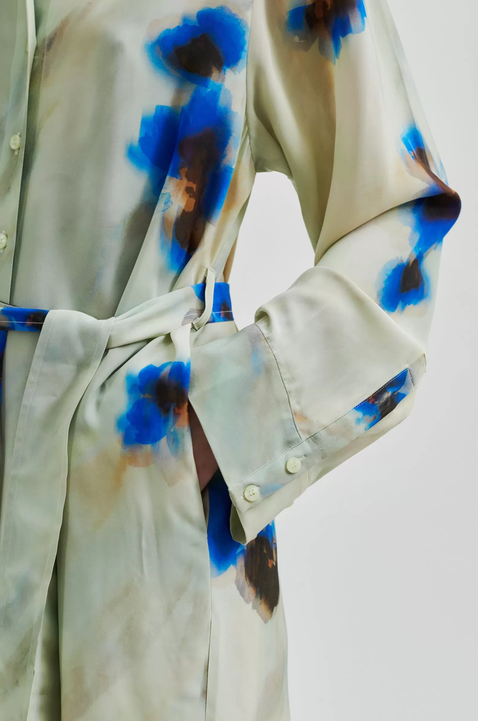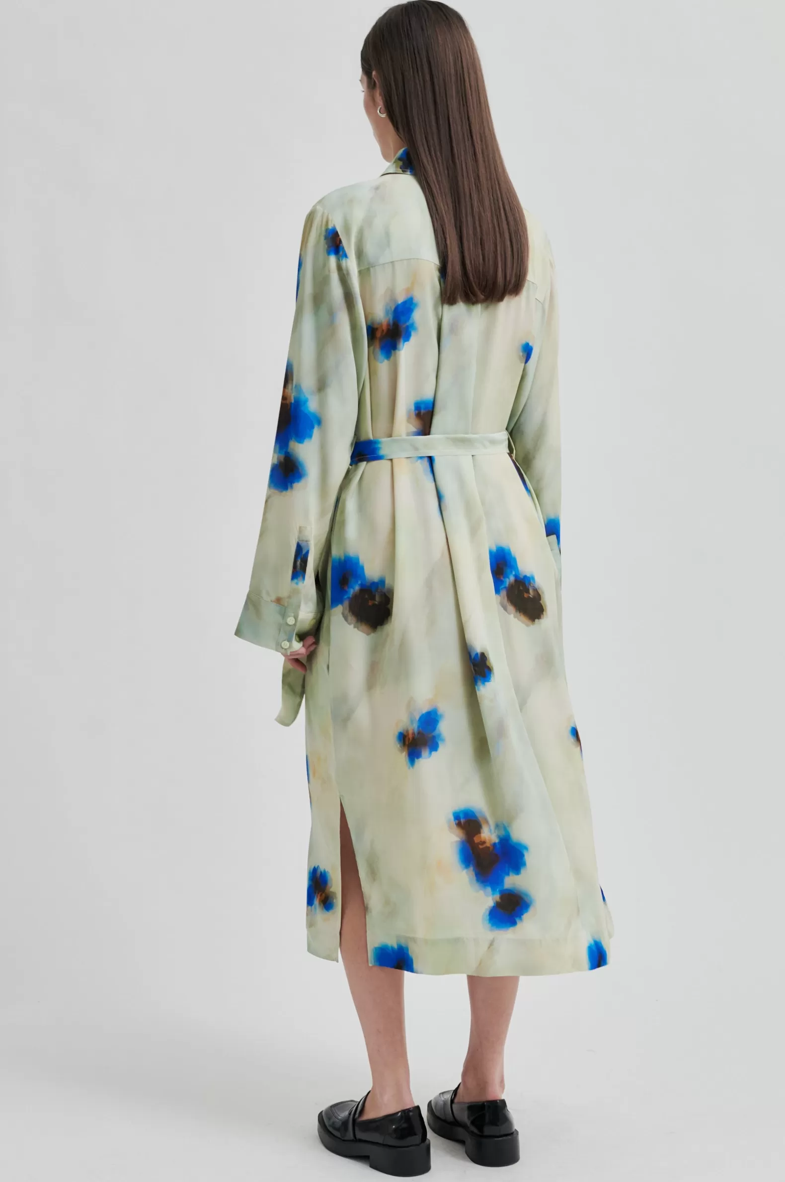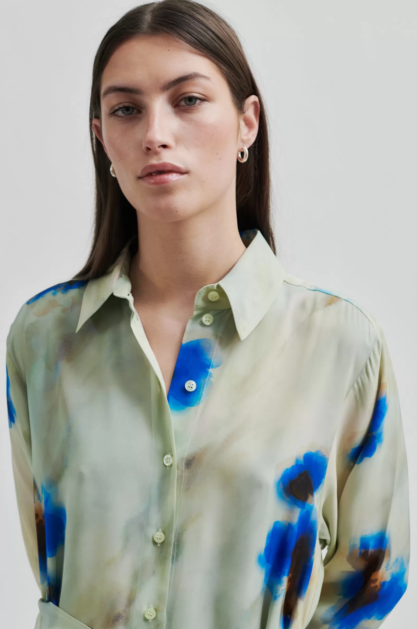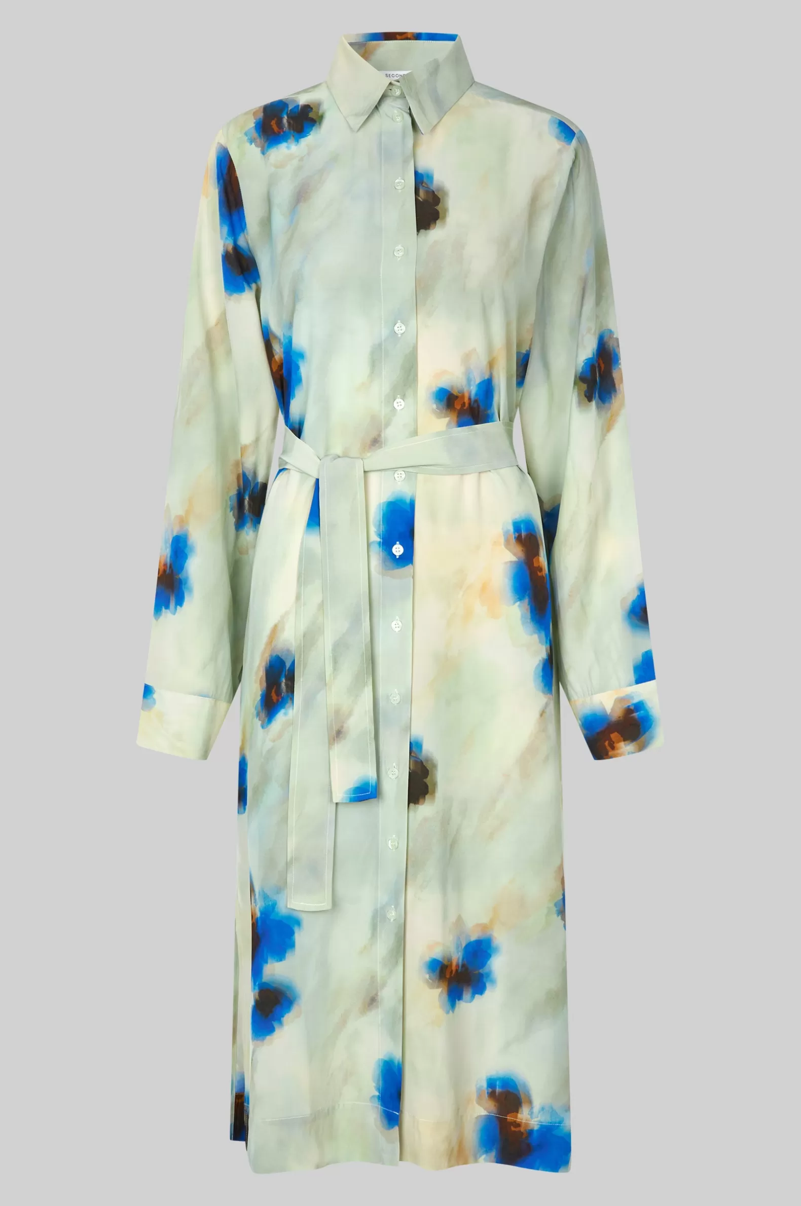 Second Female patterned shirt dress. Made in soft and silky viscose with graphic floral print. Features a regular collar and button-through fastening. Tie belt at waist and pockets in side seams. Long sleeves with wide cuffs with adjustable button fastening. Slits at sides. Regular fit.