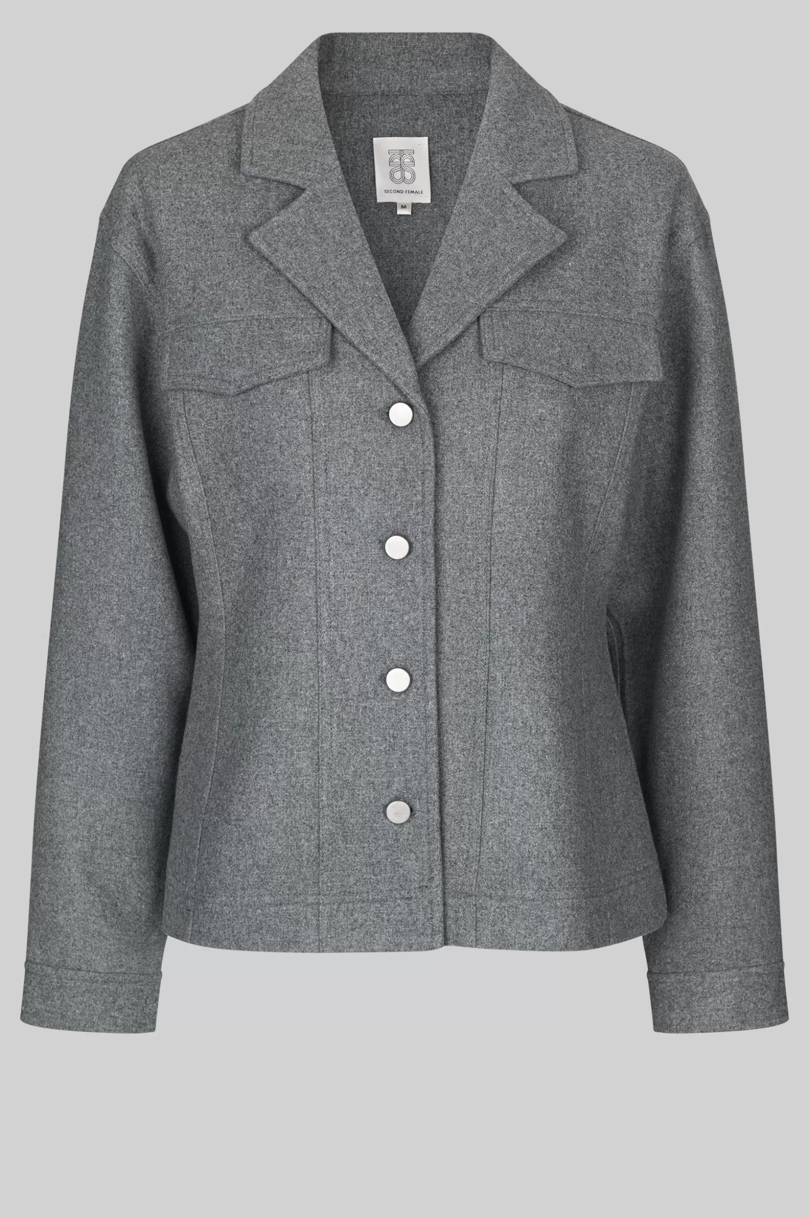 Second Female melange shirt. Made in mid-weight wool melange fabric blend. Featuring a notch lapel and button-through fastening. Two decorative flap pockets. Long sleeves with buttoned cuffs. Vertical stitching detail at front and back. Matt silver hardware. Regular fit slightly shaped silhouette.