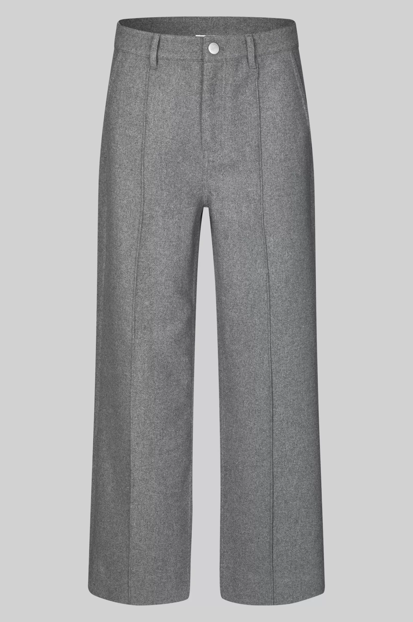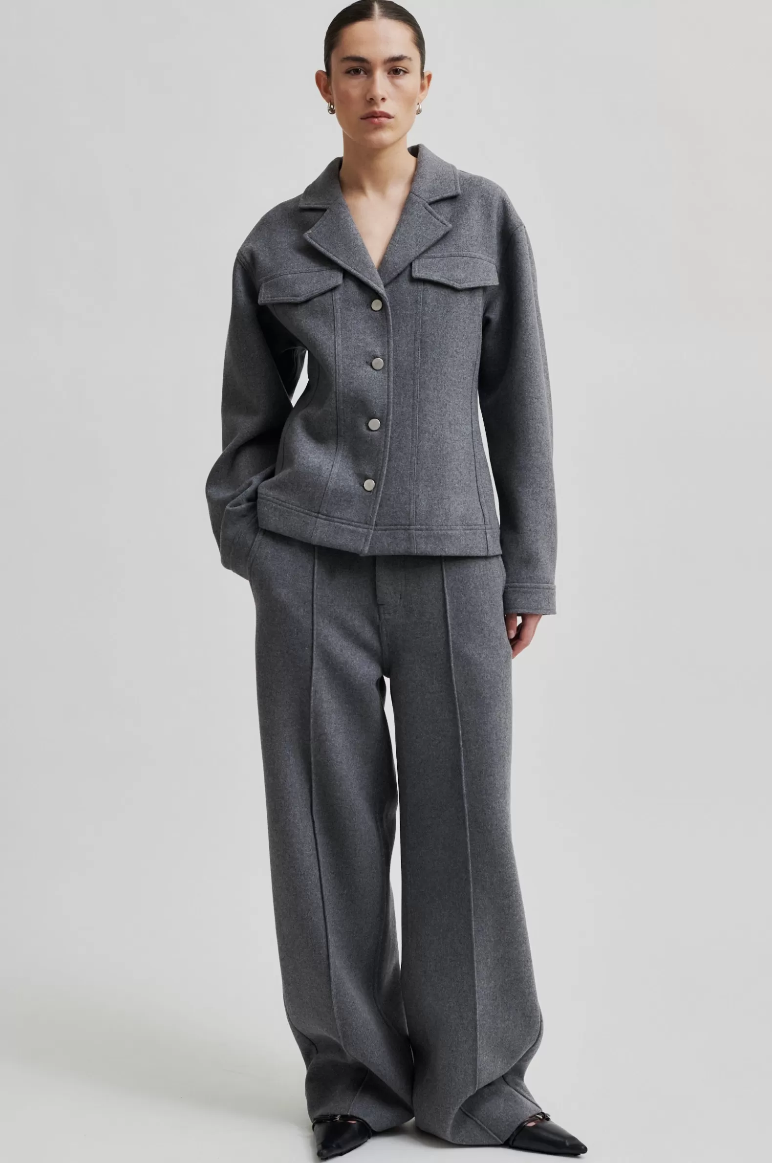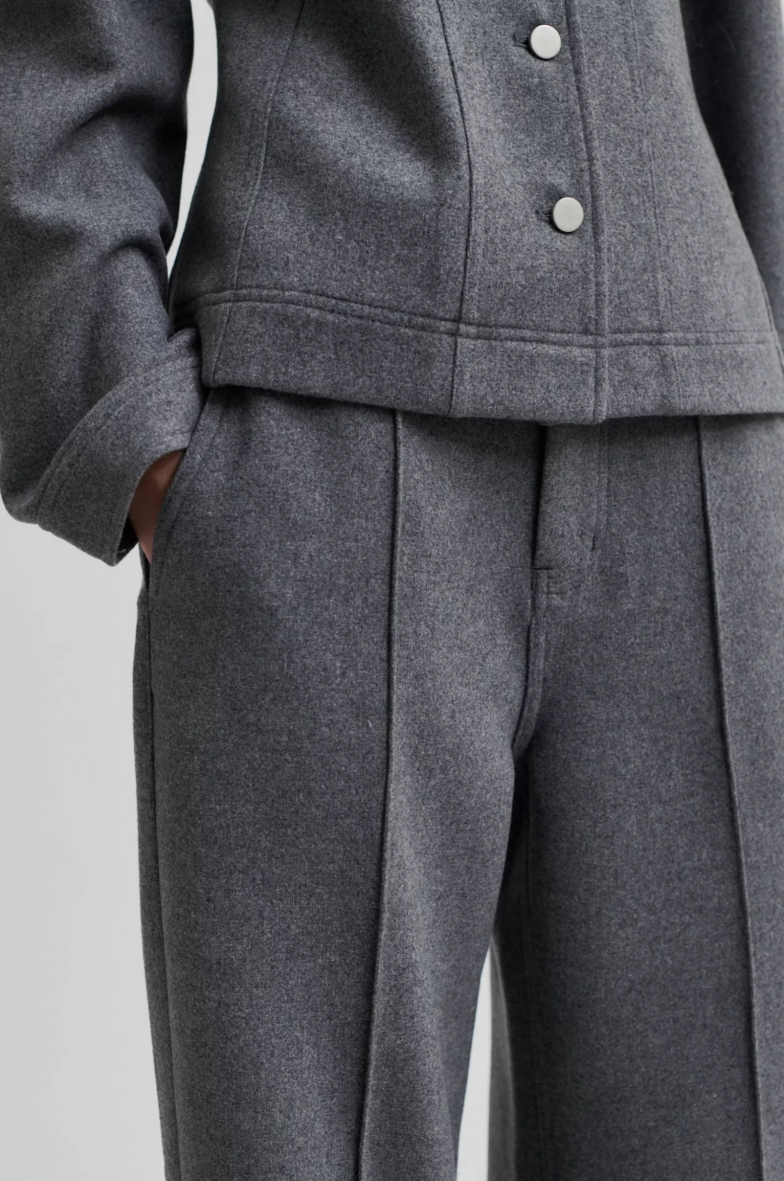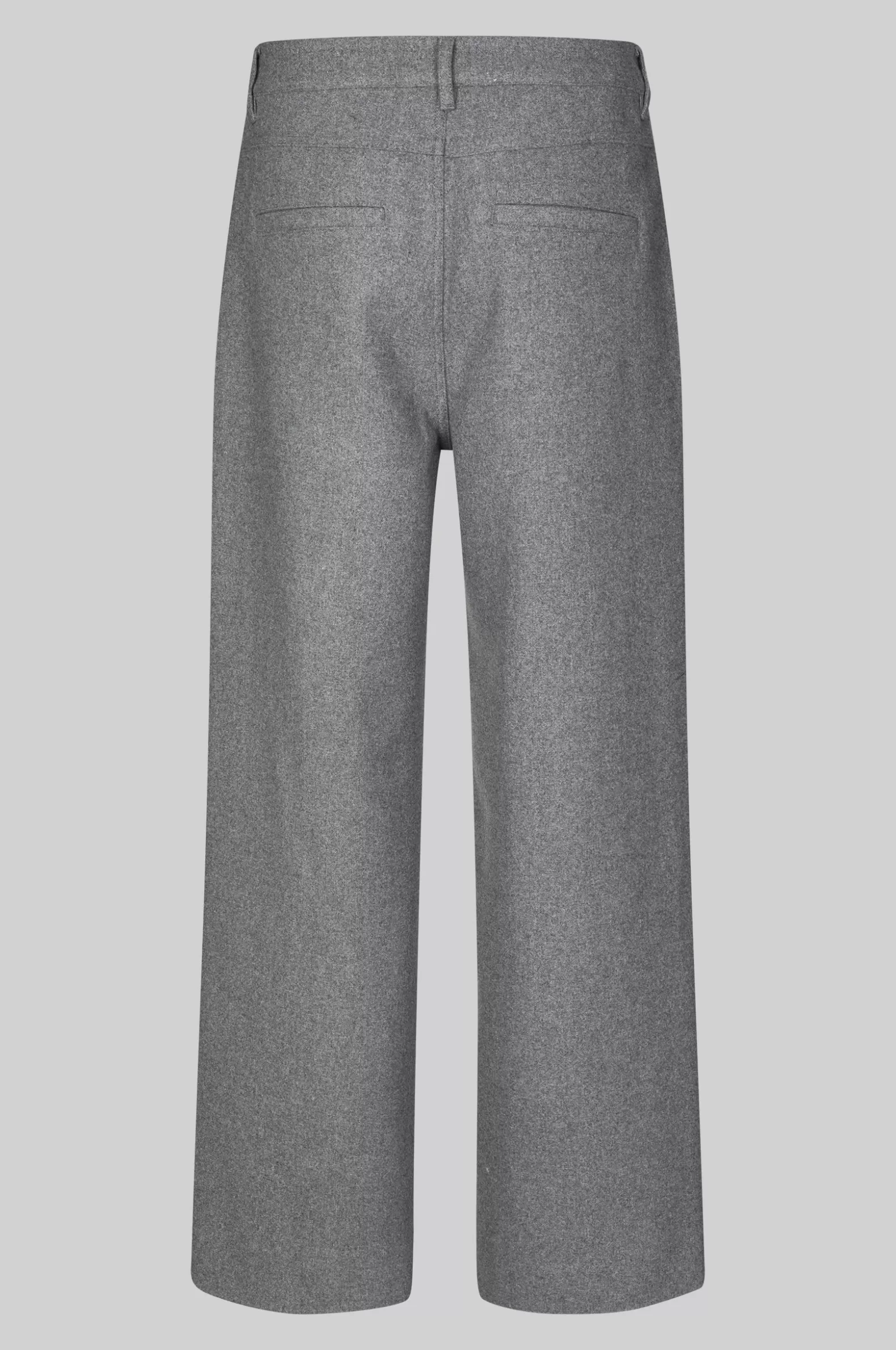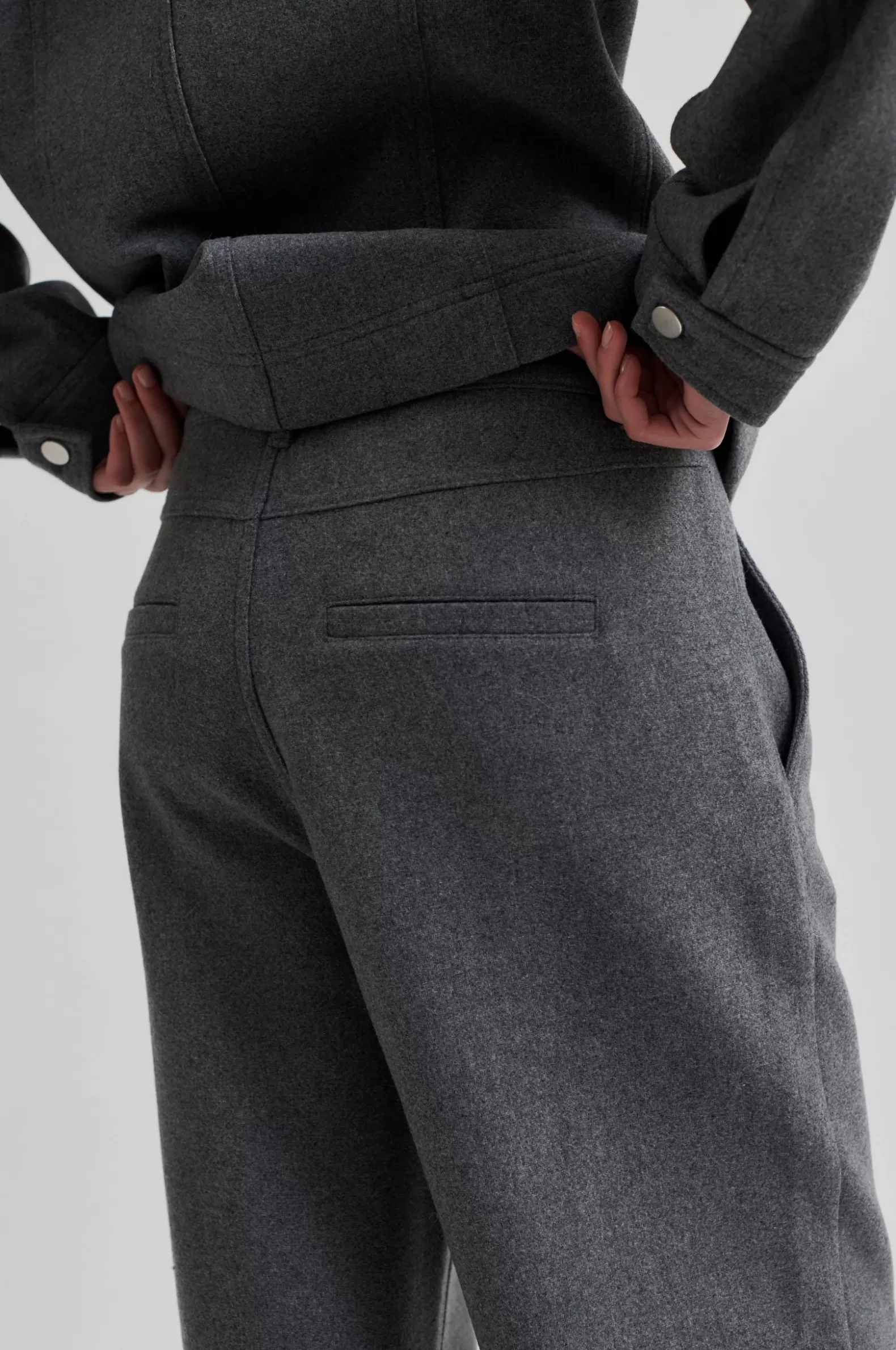 Second Female melange trousers . Made in mid-weight wool melange fabric blend. Featuring concealed zip fastening with metal button at waistband. Two slanted pockets and two decorative pockets at the back. Visible stitched seam details. Belt loops. Regular waist with wide, straight leg.