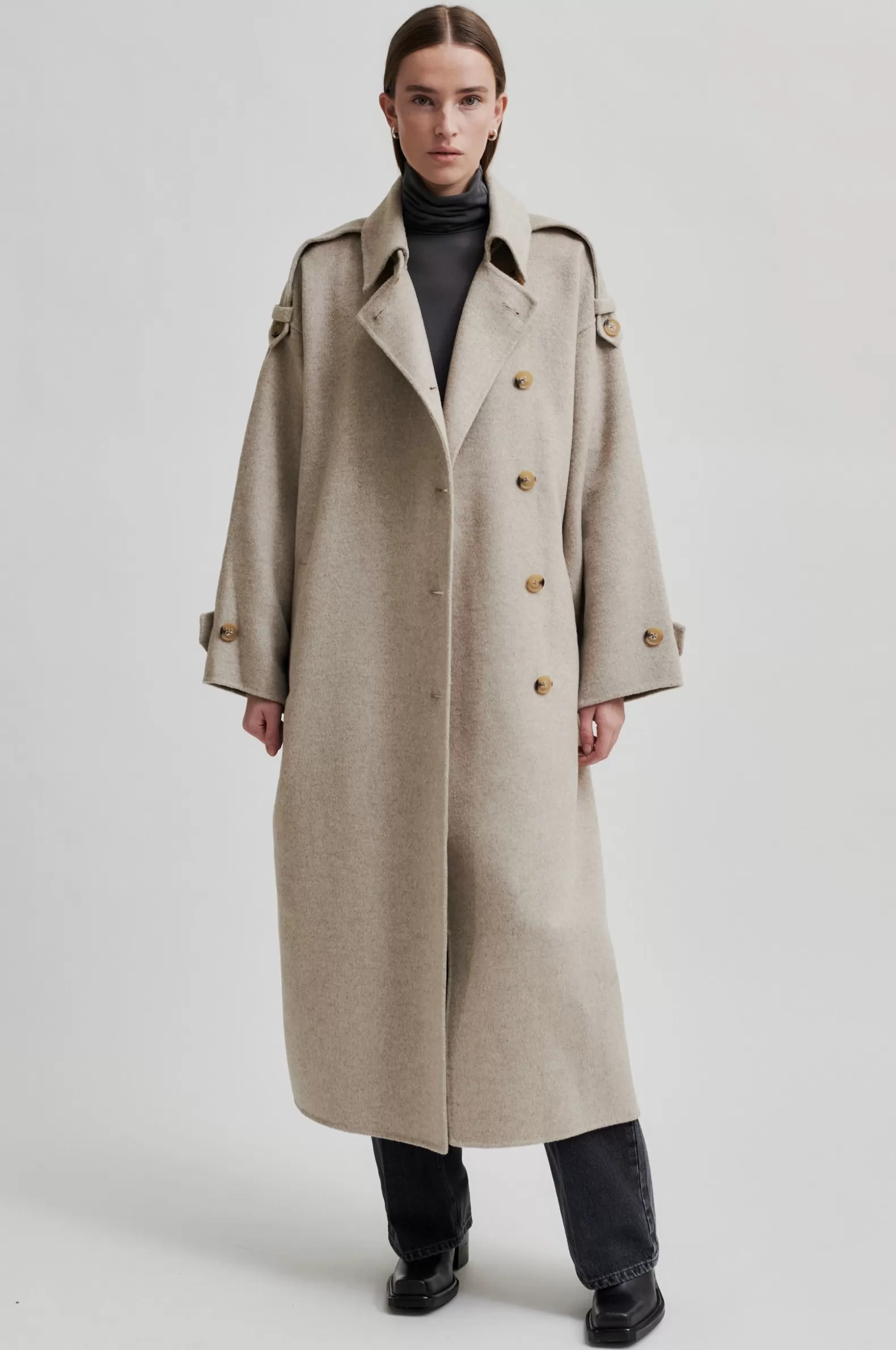 Second Female belted coat. Made in a soft and slightly textured wool blend. Featuring a regular collar with asymmetric button fastening and fabric tie belt at the waist. Straps with buttons at the cuffs and shoulders. Two side pockets. Loose and wide silhouette that can be pulled in with the belt.