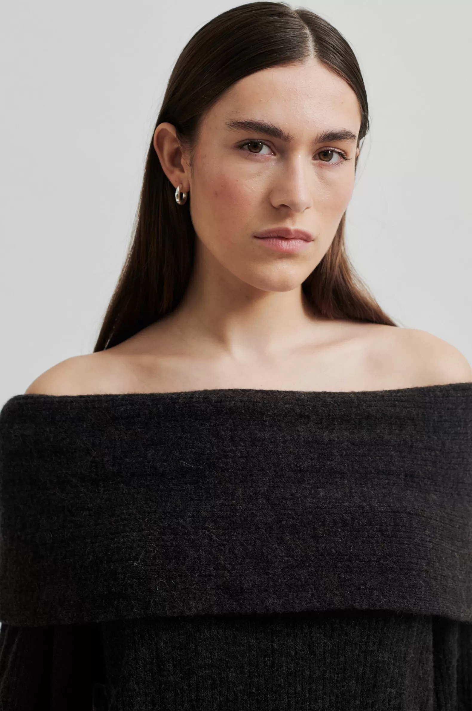 Second Female knitted off-the-shoulder pullover. The pullover is made in a soft and stretchy ribbed fibre blend with wool and alpaca. Featuring a double layer across front that leaves the shoulders bare and long sleeves. Regular fit.